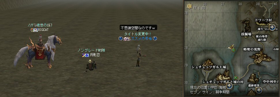× [PR]上記の広告は3ヶ月以上新規記事投稿のないブログに表示されています。新しい記事を書く事で広告が消えます。 「氷屋の小屋」を後にした俺達は、さらに北上し、 「シュチュッツガルトの村」の手前、橋の横から川に降りた。 泳いで、さらに北上すると・・・ 天空には海、地上は平原と言う奇妙な空間へ。 ふと「十二国記」の風景を思い出す・・・ 遅れてINしてきたメンバーと合流するために、しばし休憩。 で、この二人はと言うと・・・すぐに決闘を始めるw 普段、女性らしい振る舞いや言動の蘭さんが、サクッと決闘モードへw で、グラで参加のススメさんが魔法クリでコロッと・・・。 シリエル強ええええええええええええええええええええええ。 ちょっとびびる俺w (蘭さんの機嫌を損ねると、かなり危険なのかもしれない・・・ =w=;) 遅れてきたメンバーと合流。 さらに北上していくと、そこには巨大な壁が・・・ 「昇山」するのか・・・? 上を目指していくと、海になった。 上陸。呼吸ゲージも消えて、地上に出たことが分かる。 地図上で見ると、普通の半島にしか見えないが、 悪魔島のデータをそのまま有効活用しているらしい。 多分、大型アップデートでは、リニューアル対象となるだろう。 恐らくは、グラフィックデータや地上データが間に合わず、 現行のデータで一番イメージに合うものが適用された物なのだろう。 個人的には、これもこの世界の不思議な一面としてありだとは思うが、 製作側の外国人の考える事など分からん! アテにもならんし。 愚痴ったところで、ロールバックするわけでもない・・・ だがw 愚痴らせてくれw なぜなら、 こんなにも美しいと思えるシーンを創った職人達がいるのだ。 国も言葉も習慣も違う異国の人間達の中に、俺の心を打つクリエーターがいる。 今は、この世界を創った、真のクリエーター達に賛美を送ろう。 どうしようもないアクセサリー群は置いといて、綺麗な部分は綺麗なのだから・・・。 いや、本当に、綺麗だ・・・放置しておくには忍びない。 有効活用の良い手は無いものだろうか? リネージュ2が壊れてきて久しい・・・。 なぜ、この美しい世界を維持しようとしないのか理解できない。 もっとシンプルで、のびのびと皆と遊べる空間を夢見ている。 複雑で面倒なだけのクエストはいらない。 安心してプレイできる環境も欲しい。 プレイヤー個人が選択できるプレイスタイルが、害プレイとかぶらない心遣い(仕様)になる事を望んで止まない。 だが、吼えてるだけでは所詮は夢物語。 創るのは自分達しかいないのではないかと思う今日この頃・・・。 一歩踏み出そうとするものの、 目の前にそびえ立つ山は巨大にして急な斜面。 われら冒険者の登頂を拒み続ける・・・。 なんてね。 と言う事で、 スリルばかりではない、まったりなサークル活動の日でしたw (マル 参加してくれたみんなありがと^^ またね^^の PR