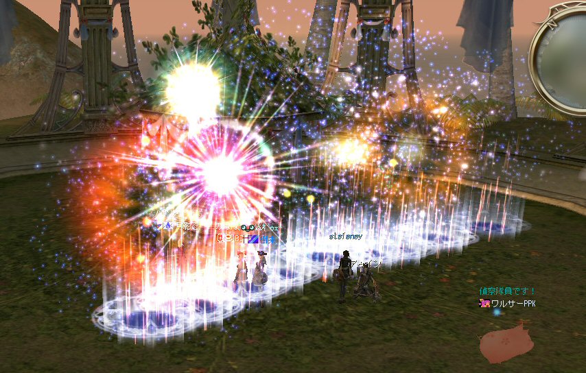 今日は、遠足予定。 22時に出発。アデンを南下する。 鏡の森を抜けて猟師村へ。 猟師村出入り口にて・・・ ウィスリーさんをサクっとNPK(ノングレ用語:NPCをPKする行為)。 警備員さんとの戦闘は、ノングレ定番だ。 どこまでも警備員さんを引けた時代は、共にアデンの果てまで遠足したものだ・・・(遠い目・・・ リザードブレインを横切り、ギランに向かう途中の出来事。 アリサが22歳に>w<b ギラン横断の図。叫びで「通りまーす」とギラン露店業の人にw クロコダイルの島から見た「サンダーバード秘密基地」 今にもサンダーバード2号が発進しそうだw (公式では、神託の島とも言うらしい・・・) 島に渡る。 向こうに見えるのは、サンダーバード3号機の発射台に違いない。 (公式では、水晶の神託所と言う所かも知れない・・・) 秘密基地であるがゆえに、警備も万全だ。 最新の科学を使ったバイオテクノロジーを使用し、 新しく造った生物(モンスター)を警備員として使用している。 その警備の隙を突いて、山やら谷やら移動していたんだが、 ノングレ隊員の一人が引っ掛っかかって追われる羽目にw 島を渡った場所のモンスターは3名以上でPTを組んで攻撃した場合、 分裂する事は確認している。 しかし、ここは奥地。 根拠は無いが、この青色のスライムモンスターは分裂しないだろう。 追われているワルサーPPKさんを助けるべくダブルショットを放つ! そして惨劇がw 分裂するやん!! 壊滅状態に近い中、樹来さんが生き残る。 流石!古参のノングレード戦士w アゥインさんがボタンを押し間違えて一人村に最寄るも、すぐに走って現地へ戻る。 その間、樹来さんのリザでPTを立て直す。 このあたりのモンスターも分裂するのか・・・侮れんなw 頭の辺り光ってるモンスターもいるしw なかなか独創的なモンスター達だ。 発光ダイオードでも仕組んであるんだろうか? それとも蛍や発光する生物の遺伝子を組み込んだバイオテクノロジーなのだろうか? 科学の最先端技術を使った何かなのだろう。 これらの技術が世界に広まると大変なことになるに違いないw だから秘密基地なのだ。 人間の警備員がいたとしても、きっとその秘密は教えてはくれないのだろうな・・・ そして目的地。 ノングレード戦隊の結婚式場あsdrfちゅじ・・・ いや、秘密のアジトだ。 秘密なのでノングレ戦隊もめったに来ない。 (と言うか、今回初めてだ@w@;) 一般公開もしているが(秘密なのか!?)人はめったに来ない。 隠れた観光名所である。 ミッション完了!!暴走ワルサーPPKさんの花火乱舞w いや、美しいwwww しばし、みんなでマッタリする。 リネージュではない、リアルでの話し・・・。 昔あった、空き地や公園、ちょっとした森、坂道、近所の友人達と走り回った場所の数々・・・。 テレビゲームなんて、まだ存在していなかった時代。 学校の登下校も友人達と一緒だったり、一人で登下校も珍しくなかった。 だから道草もいっぱい食べた(いっぱい寄り道しながら帰ったという意味ね)。 遊びだって、みんなで集まってから「何しようか?」相談してた。 自分達で遊びを考え、ルールを作り、それを守って遊んでた。 日が暮れるまで走り回って・・・遊んでた。 クダラナイ話に花を咲かせてわいわい話してた。 そのときは、それが当たり前の世界だった・・・。 時と共に、空き地は駐車場やら住宅やらが建ち並び、森の木は切られ、 砂利道は舗装され、近所の友人達もいまはどこで何をしているかすらわからない。 10年も経てば、そこは見知らぬ町に変容していたりする。 ふるさとを離れ、他の地に住み、たまに戻ってもあの頃の風景はどこにも無い。 町内の子供達がカン蹴りや鬼ごっこをする姿も見られなくなった・・・。 学校の登下校も集団で行われるようになり、道草している子も見かけない。 もちろん、子供の時代が良い事ばかりと言う訳ではないんだが・・・。 ただ、ノングレードで行こう!で行動を共にした仲間といると、 そんな、子供の頃の感覚がよみがえる気がする。 出逢った友人達と共に過ごすこの時間が愛おしいと思う。 恒例の5分帰還で本日のミッション終了。 みなさん、お疲れ様でした。またね^^ノ 追伸:PT解散と同時に、GMが出現www ノングレード戦隊の行動が見られていたらしい・・・^^; 「ノングレードで行こう!」と言うローカルイベントは、GMも知っていたらしい。 サーバ内のユーザーイベントの応援をしてくれているとの事。 挨拶程度ではあったが、GMと少しでも話が出来たのはうれしかった。 本当なら、 ゲームの仕様について改善要望とかも直に聞いてもらえると更に良かったんだが・・・ 空気読むとそんな雰囲気じゃなかったもんね^^; PR |