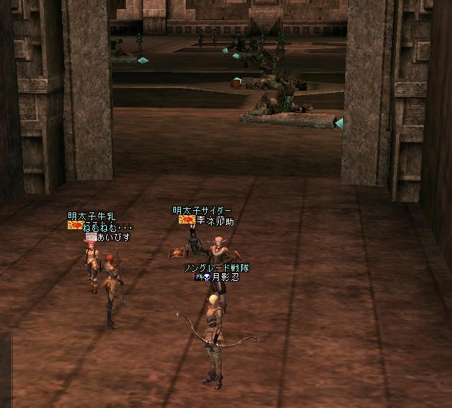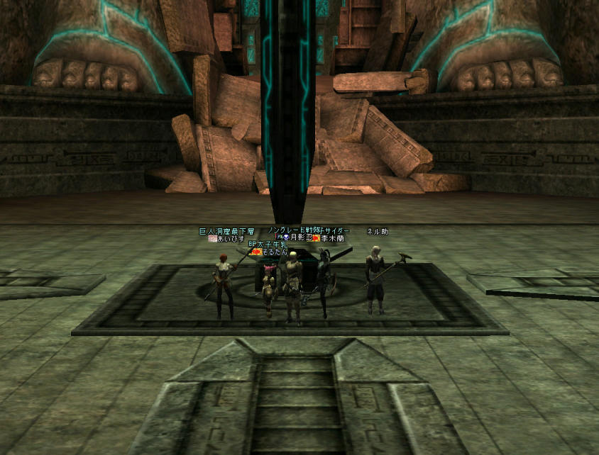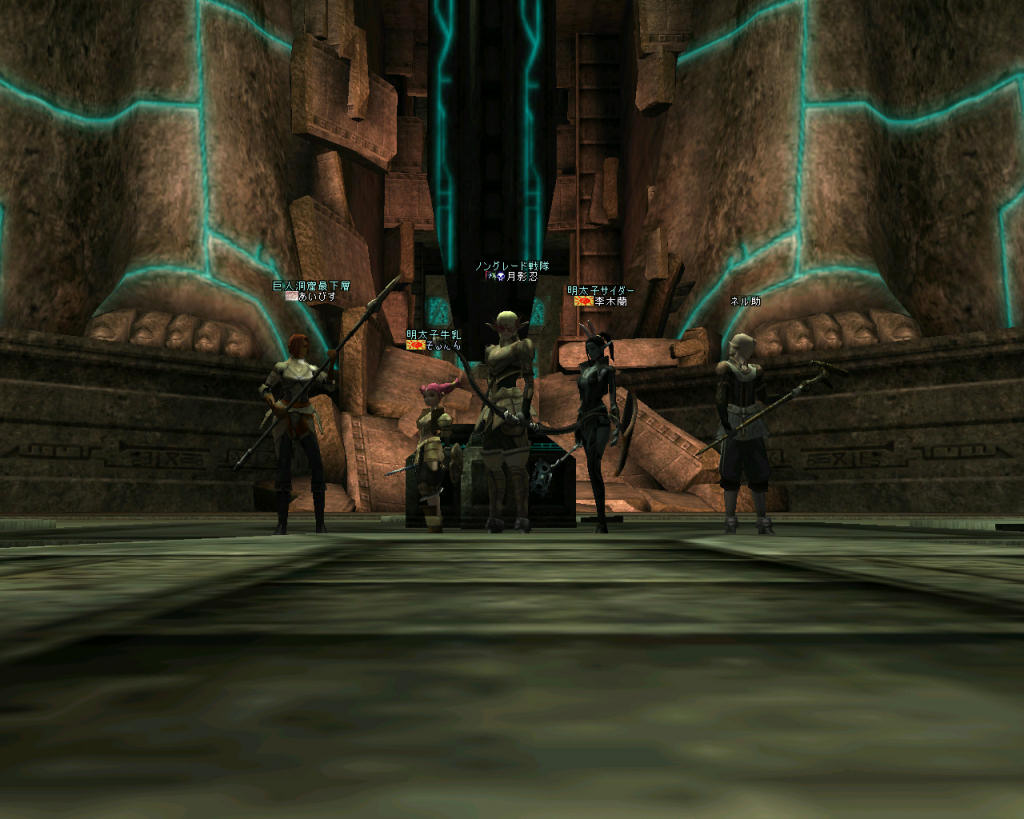 今回は、途中で出会った槍PTの人に復活させてもらった。 槍PTのそばで、果てていたメンバーは、槍PTのヒーラーさんに全員助けてもらったのだ。 本当に助かりました><; ありがとうございました。 m(_ _)m しかし、モンスターを一身に集め、疾走して果てたあいびすさんは・・・ 遠く離れた熊通路の上だ。 熊通路への入り口周辺では、 あいびすさんを仕留めたモンスター達が、果てたあいびすさんの姿を眺めながら満足そうに笑談している。迂闊に近づくのは危険だ。 「もよろうか」とあいびすさん 「待って」と李木蘭さん。 そう、MPを回復しつつ体制を立て直して様子を窺う。 しばらくすると、モンスター達も自分達の自慢話に飽きたのか、少しずつバラケ始めた。 「行けるか…な?」 近くのモンスターを引いては排除…道を作る。 無事、あいびすさんの所に到着。救出に成功。 さて、元気を取り戻しリトライ。 そして、助けてもらったPTの待機場所へ移動。 壁伝いに、さっきリンクした隣の部屋の入り口あたりまで…で、 手詰まり。 どうしたものか…と思案していると… 別の巨人PTが目の前でモンスターを排除して先に進んで行くではないかw 「チャーンス!!」 速攻で、ウォッチャー部屋を通過したw。 さらに奥へ… 部屋や通路が広くなり、モンスターの密度もさっきの部屋ほどではなくなった。 ウォッチャーもリンクさえしなければ、何とか対処できる。 さらに奥へ… さらに下へ… ミッション完了までの道のりは、楽ではない^^; 俺「ここ最下層(の部屋)かな?」 ネル助「いや、もういっこ(下の階)かな?」 あいびす「これ突破しなきゃならんのか」 李木蘭「向こうに下がるとこあるね」 そう、向こうに入り口と思しき通路が見える…。 そして、見ての通りウォッチャーさんの大群(;´Д`) (こ…これは、通り抜けられそうに…ない) 時間も23:30が近い… 中途半端だなぁ…せっかくここまで来れたのに、 気持ちのもやもやを抑えつつ… 俺「時間も時間だし、今日はここまでにしておきますか^^;」 こんなところであきらめにゃならんのかw(;´Д`) いろいろ、自分にも言い聞かせて自分を納得させようとするが… 解説本みると、すぐそこの右側に下へ向かう通路があるんだよなぁ… (全然納得しとらんやん!) … …… ……… なんか、あきらめきれないので、もう一度覗きに行く…と、 神は、我等を見捨ててはいなかった。 集まっていたモンスターがばらけて、人が通れそうな空きができてるw 「行けるかもw」 ダッシュでみんな、部屋を通り抜ける。 最下層の部屋だw ミッションクリアーだw 証拠の記念写真 まあ、熊の通路から落下すれば、ここに落ちるんだけどね^^; それじゃ、意味が無い。 とは言ってみたものの、全滅してるから、誉められたものでもない;; 本当に偶然と運で来れたのかもしれない。 お約束のノングレ帰還 ミッション:『巨人たちの洞窟の最下層を目指せ!』 ミッションクリアー! 参加した皆さん、ありがとうございました^^ そして、お疲れ様でした^^; See You Next Time! PR