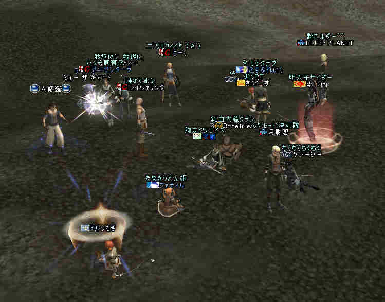 2006年7月13日(木) 21:00~22:30 ミッション:アルゴスの眼を探せ! 20:55頃、現地に到着。 すでに志願者が何名か集まっている。 特記すべきは一番乗りを名乗る志願者が2人。 「一番乗り」が「ふたり」って、「一番」の意味って一体なんだ@@; いや、ノングレード決死隊では、この「乗り」が大事だw 21:00過ぎに編成を開始…と言っても、1PT分の人数9人しか居ない。 普通なら、この状態で「みwwなww(中略)ぜww」で出発する所だが… 今回は、いつもと状況違う・・・ 参加希望者から連絡(Wis)が入るのだ… 「まだ間に合いますか?」とか「遅れます><;」とか… 社会人プレイヤーだと、 やはり通勤時間や残業等でどうしても遅くなりがちになる。 まして、緊急の仕事とか入った日には… 社会人は大変なのだ。 …と言うことは置いといて… 特筆すべき点はここにもある。 複数PTなんて、「ノングレードで逝こう!」始まって以来の快挙?@@;なのである。 主催を含む、古株メンバーで複数PTを体験したものは、いまだかつて居ない。 とりあえず、遅れて参加する志願兵がいる事をPT内に伝え、狩りを始める。 まずは、自分達の実力がどれくらいのものか? もちろん俺の目から見て真っ赤なMOBしか居ないw 「やってみなければ、わかるまい」 で、FAしてみる…当然タゲは俺に来るw さすがノングレード! 痛い!!(;´Д`) 3撃ぐらいで半分くらいHPが無くなっただろうか… ヒーラーが居てくれなければ、逝っていた…ありがとうヒール職のみんな(T-T;) また、後衛職も皆、いろいろな事を試す。 ルーツが結構決まる事が判明した! ルーツが決まると、狩りは格段に効率がアップする。 手探りで、色々な狩り方を模索するのも楽しさの一つだ。 確かにHPの削れるスピードは遅いが…相手の回復スピードよりも早い! なので、狩りが成立してしまうw スポも決まるw 1PTでも狩りは可能である。 ただし、ヒーラーは必須w さて、遅れてきたメンバーも徐々に集まってきたので入り口に一旦戻る。 再編成を行い2PTに。 「PTLやりたい人」 …シーン… 誰も居ないので、「ノングレードで逝こう!」皆勤賞の Rodefried 氏にお願いした。 さて、どうPTを分けようか…と、思案していると、 Rodefried 氏が看板をだした。 「逝くPTはこちら」(だったと思う) w みんなぞろぞろとそちらに… Rodefried 氏、両手どころか両足も花(ハーレム状態w) ww (おいおい、俺の方は@@;) 最終的には、バランスよく分かれた感じになったが…、 さすが死を恐れないノングレード勇者の集まりだw 心意気が違うぜw さて、PT分けだが、 PTLを立てて、その他のプレーヤーは、自分が選んだPTLの所に集まる。 自己責任で、自分のPTを決める。 ノングレード決死隊に相応しい方法だ。 なかなか使える方法だと思う。 そして、60を超えるMOBの中、ノングレード決死隊の冒険は続く・・・ 移動途中… 猛犬(スナッチ)も何とか倒したw 何か、とても硬かった気がするw 目玉のアクティブMOBに襲われ、魔法攻撃の直撃を受ける。 なんと8割くらいHPを持ってかれたw うはw 死むw 間違いなく死ぬw もう一撃受ければ逝っちまうw で、必死で逃げてたりする^^; ヒールしてもらってすかさず攻撃に参加w 戦死者がここで一人出たw ここは、予想通り(以上?)にとてもデンジャラスな場所だ…(;´Д`) リザ後、移動… そしていよいよ「アルゴスの眼」への坂道が見えてきたw 「この上だw」 みんな走って山頂へ… 「アルゴスの眼」発見w 誰も命令していないんだが… なぜかフルSS戦闘状態w(;´Д`) 現地到着:22:30 「ミッション終了!」 記念写真^^ 今回参加した、ノングレード勇者達の勇姿ですw みんな、ありがとう^^ そして… 恒例の5分帰還で幕を閉じた。 ミッション:アルゴスの眼を探せ! 完了!! PR