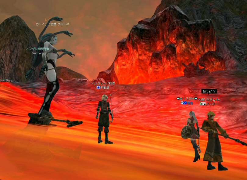 2008年1月10日(木)21:30~ 今回は、火炎と温泉に遊びに行った。 ノングレード装備で50~60の若造が、 嬉々として10レベル(20超える事もある)以上のモンスターと戦っている。 レベル差が開けば開くほど、攻撃も当たらなくなる。 危険度が増大する。事 スキル等でMPも大量に消費し、 ヒールどころか攻撃すらままならない事もある。 死亡確率が高くなり、時に瞬殺される事もある。 でも、死線を潜り抜け、生き残った時の感動はたまらない。 恐竜島(太古の島)や傲慢6階以上や帝国の墓地に亡者の森・・・ 危ない所には結構行った。 そして何度も死んだ。 それでも少しずつレベルも上がってきている。 55で創めたノングレイベント。 いまじゃ俺も58。 決してノングレだけでレベルが上がったわけじゃないけど、 上がるとその分世界がちょっとだけ広がる感じがする。 ここは「火炎の沼」 A装備でソロやペアしてる人をよく見かける。 もちろんモンスターは65~75レベル帯の地域で、 俺からするとすでに10以上上のレベルのモンスターがたくさん生息している。 ハーメス オーク フットマン(Lv.71)とかカーズド ガーディアン(Lv.73)とか・・・ AとかB装備の人が時々すれ違う。 そう、本当なら、ここはそういったレベルの装備で狩りを行う場所。 そして、その本装備でも時々逝く危険な場所だ。 なのにN装備! 俺達、TUEEEEEEEEEEEEEEEEEEEEEEEEEEE!!! (いや、単なる阿呆かも知れない・・・) 以前ノングレで来た時は、全滅しそうになった。 生き残りは俺だけ。 もちろん救出ミッションは行った(燃えたぜ>w<ノ)。 まあ、当時のタイトルが「ノングレードで逝こう!」だったから、 『逝く』イベントと思っていた人も少なからず居たと思う。 当初、洒落のつもりだったのだが、誤解を招くので「行こう」に変えたのだ。 苦戦を強いられた場所でもあり、慎重に進むのは仕方有るまい。 しかし、苦戦した記憶しか残っていないため、場所的には未知の場所もたくさん有る。 例えばこの溶岩流の噴出部分(丘の上)はどうなってるのだろうか? 気になる・・・ 見たい・・・ 思っちゃったら仕方が無い。 思った事は即行動だ! ハーメス オーク シャーマンはLv.74らしい・・・ でも、後援職が多いとアタッカーの被ダメが最小限で済むのはありがたい。 リンク処理して各個撃破は、ノングレPTの基本だ。 (いや、普通のPTでも同じだとは思うけどね ^^;) (普通PTより、切実なのよノングレは ^^;) お!? 宝箱発見!! 悪戯心が急速燃焼!!! 攻撃>>>宝箱w タッカー氏、戦死w いや、長い事やってるから、「宝箱」が危ないのは知ってるんだけど・・・ (実はデバフがほとんど効かないノングレ泣かせのモンスター) すんません=w=; でも、多分またやると思います・・・ 生きるか死ぬかのドキドキ感がたまらん・・・ (コラ ここが溶岩の噴出口。 さすがリネージュ2・・・グラフィックが美しい。 ん? 対岸に何かいる・・・? ====Lv:67 カーノンの忠僕 ケローネ [レイド ボス]==== ケローネさん美しい・・・。 「キッス」の代わりに「愛のダブルショット」をプレゼントした。 お返しに、HPが飛んでしまうほどのダメージを受けたが・・・ ケローネさんに好かれてしまったようだ。 後をついてくる・・・。 ケローネさん、『ツンデレ』だったんだね。 元の場所からかなり離れてもついてくるんだけど、 見つめると(タゲると)、元の場所に戻ってしまう。 そして、そこから鬼のような形相で、ダッシュで俺のところに戻ってくる。 俺が浮気してないか見張っているようだ。 (タゲルと消えて、元の場所から走ってくると言う現象は、各クライアントごとに出るようだ。タゲッた本人しか見れず、他のPCからは確認できない。バグかも) 鼻の下を伸ばしている俺に、 蘭さんは口をきいてくれなくなってしまった・・・ ===妄想モード終了=== レイドで遊んだおかげで経験値が少しロスト^^; でも、面白かった^^ ノングレでレイド討伐したいね~。 まあ、ノングレレイド討伐の練習と言う事で、攻撃してみる事に。 俺が叩いてすぐに樹来さんが緊急リコすると言う手順で、早速、攻撃! レイドを攻撃して全員生き残った。 すごいぞノングレード戦隊@w@ノ (ちなみに、ダブルショットでケローネ様に与えたダメージは415だった) つづく PR