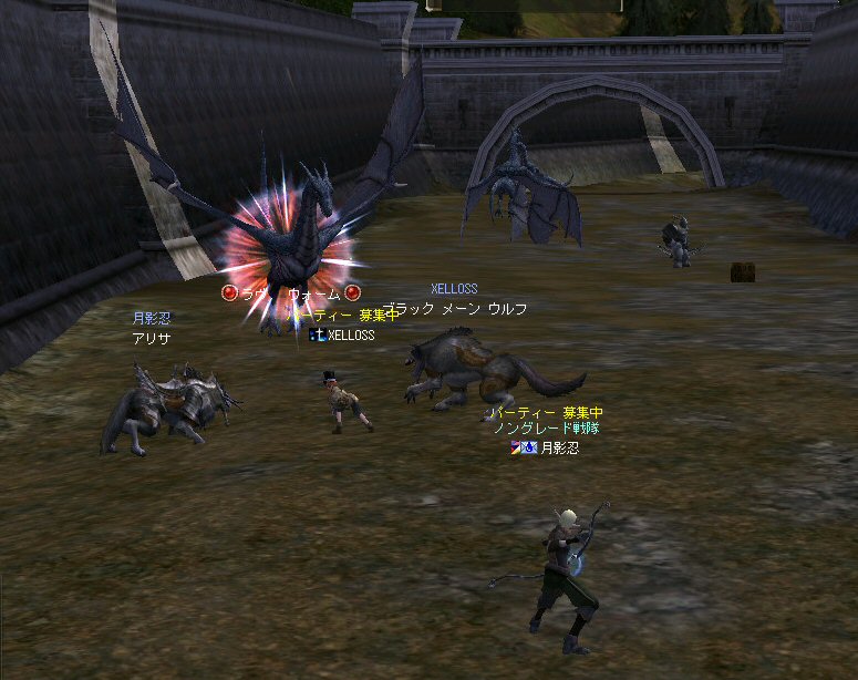 定時に人がいる事が無い。 相変わらず、集まりが・・・・ Wis で課金終了後の休止の問い合わせをくれた人がいた。 まあ、少しでも惜しんでくれる人がいると言うのはうれしい。 少なくとも、今までの活動が無駄ではなかったと言う事なのだから・・・。 さて30分を回ってからしばらくしてから参加者が。 人数少なめなのと、参加レベル帯を考えて、場所は火炎南側橋の下あたりにした。 22時を回って、やっと参加者3名でスタート。 ドワ娘×2+弓(俺)のPT。 あえて言わせてもらおう。 両手に花とw だが、流石にアタッカーばかりのPTだとスリル感が大きい。 特にラヴァオームの火炎弾(魔法攻撃)は、クリティカルが出ると即死だ。 (この時、俺が確か1エンドした気がする・・・) ハーブの落ちる地域以外で、PTプレイは自殺行為に等しいかもしれない。 (それはそれで、はらはらドキドキなのだが・・・) XELLOSS さんが、盾と交代したいと申し出があり交代。 ドワ娘+盾男+弓男のPT。 あえて言わせてもらおう。 ライバル出現!と この後、極悪見習い(ドワ娘)をめぐって激しい争奪戦がはじま・・・らない。 まあ、冗談は置いといて、善玉菌(盾)が入る事でPTの安定感が格段に増した。 タンカーは、もともとHPの高い職なので、一撃死はほとんど無い。 だが、しばらく見ていると・・・善玉菌さん、ハーブを拾わない・・・。 ヒーラーの居ないPTなんだが・・・ 唯一他者にヒール出来るのが盾職パラディンが善玉菌さんw (自分のHPを気にしようよ^^;) お蔭でスリル感は増すんだが・・・ これは増して欲しくないスリル感だな^^; そして、狩りは徐々に過激さを増し、リンクがリンクを呼ぶお祭状態が発生。 盾が死亡すれば、他にタゲが向くのは当たり前だ。 HPの多いとされているドワーフ族にしても、限界がある。 スタンで多少の時間を稼いだところで火力が不足している以上、 複数の敵には効果が無い。 大型犬と弓スキルで何とか切り抜けようとするが、リンクが痛い。 MPがあっという間に枯渇して、まともな攻撃は大型犬しかできない。 程なく、3人とも死亡状態(全滅だ=w=)。 大型犬がまだ生き残っているものの、時間の問題だ。 さくっと最寄る。 生き残ったのはアリサのみ・・・。 まあ、敵を甘く見た報いだろう。 だが、強く叶わない敵なら諦めもつくが、倒せる敵に殺されたとあっては、 腹の虫もおさまらんw リベンジに行こう! と言うわけで、ミッション終了時間が近づいていたが、現地へ舞い戻った。 リンクしていた連中にタゲルと、HPが減っている。 俺たちが善戦していた名残だ。 俺たちが、戦場離脱(最寄りの村へボタンを押下)したために、 目標を見失ったのだろう。 あれほど密集していたモンスター達が、しっかりばらけて居る。 いける! 各個撃破なら、俺たちが勝つ!! という事で、無事リベンジ終了。 俺たちは帰途についた。 ノングレード帰還(5分帰還)発動。 ミッション終了後も、 別れるのが惜しくて、しばし雑談してしまった^^; 参加してくれたみんな、楽しい一時をありがとう。 縁があったらまた遊ぼうw <(@w@) ピッ PR