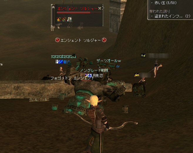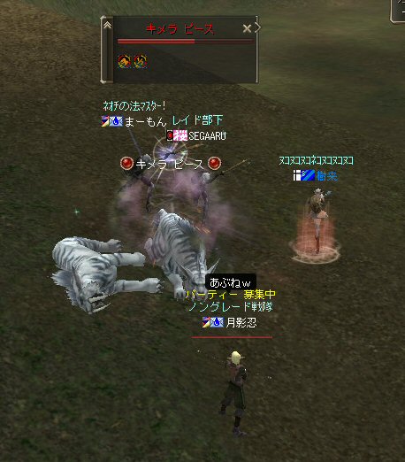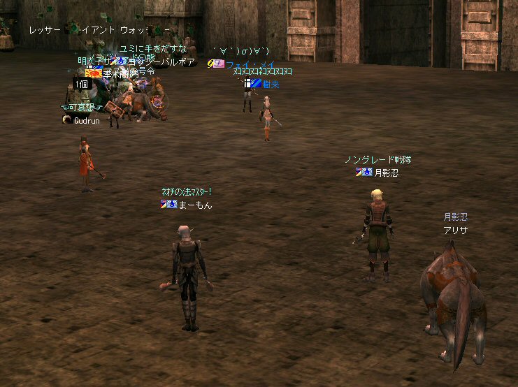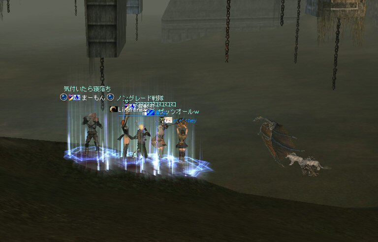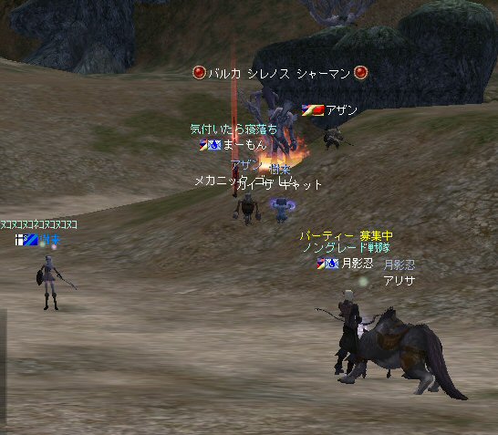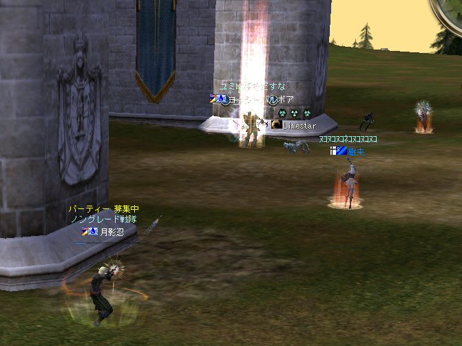 公式での告知文---------------------------------------------- レベルが上がりやすい仕様に変更されて、 最近、本当にレベルの高い人が増えたなと思う。 レイド討伐も、以前は60から募集があったものも62とか64とか… 現地で薄青の人は手抜き、お座り… 適正レベルで参加ならこんな事にはならないのだが、 討伐には人数を必要とする為、適正の人だけでは厳しくなってきているのかも知れない。 もちろん、ドロップ狙う為には有効な手段ではある。 (時々募集レベルに満たなくて泣いているのはナイショだ) でも、みんな70や80になったら、低レベル帯のレイドはどうなるのだろう? やはり、俺たちの様に『石化レイド討伐作戦』だろうか? ある意味時代の最先端を進んでいるのかもw (違? クランでハンティングに行こう!と言っても、上は70~80で下は40台とかになると、 みんなで遊べなくはないが、低レベル者に経験値は入らない。 (ノングレ戦隊も高齢化が始まっていて低レベルの人には経験値が入らない事が…) 「だから、早くレベル上げて一緒に遊べるレベルに…?」 最近、それも面倒に感じる…。 本来、レベル上げ作業をしたい訳じゃない。リネ2の中で仲間や友達と遊びたいんだ。 あまりレベル上げ出来ない人(接続時間短いとかリアル忙しい等…)とか興味のない人は、 そのレベル帯で長く飽きずに遊べる環境が欲しいと思う。 また、レベルが上がったおかげでお気に入りの狩場を去らなければならない事もある。 わざわざ自分から行動不能状態(一般に言う死亡状態)にしてレベル落とすのもなぁ…。 本当にレベル下げポーションとか、レベル強制固定狩場とかできるといいのになぁ…。 他にも、ペットへ行く経験値を自分で設定できるといいのになぁ… ペットに100%自分に0%とか… 以上、愚痴でした。 ま、無い物は仕方がない。 『あるもので賄う』のがノングレスピリットだ。 さ、今日はどんな冒険をしようかね? ----------------------------------------------------------- ・・・と言うわけでアデンの中央広場に集まった俺達。 他のメンバーは分からないが、 気分的に、狩りをする気にならない・・・ NPCで最近遊んでないし・・・ とりあえず南門のコンロイ氏を叩いて、オーク村のNPCと同じか検証した。 コンロイ氏は近接戦闘タイプのNPC警備兵。 叩けば追いかけてくるはず・・・ で、フォースアタックをかける!! 南門を下って闘技場まで引けるか試そうとしたんだが、 スクリーンショットを撮ったあたりで逃げられた(テレポートして消えた)。 目算でキャラクターが見えなくなる距離の倍くらいの位置だろうか。 感覚的には、走り出してちょっと来たかな?くらい(判らんだろうな^ー^;) 元の位置から、そんなには離れてない距離だ。 NPCをノングレで引いて遠隔地へ引いたり、倒したりするのは、 ノングレード戦隊では、定例の遊びの一つなのだが、 今回、初めての人もいたんだよね^^; 最初何が起こっているかわからなかったらしい・・・。 単純にNPCを倒す(NPK)ですなw 以前、警備兵をどこまでも連れて行けたある日(ブログをさかのぼると分かる) コロシアムが単なる決闘場だった頃は、コロシアムで戦った。 あの頃はレベルも55周辺だったろう・・・ 若かったなぁ・・・ (マテ しかし、そこ頃弓警備兵とは、戦っても勝てなかった・・・ 走って逃げても間に合わない。 一発命中すると半分以上HPが減り、反撃する間もなく2発目が飛んできた。 戦った相手は・・・そう、クエストNPCのコルマンだ。 久々にやってみるか・・・ あれ?倒した??? うそん@w@ あの、強敵のコルマンが!? もし、事実ならノングレード戦隊史上初の快挙である。 再検証だw おっ、また倒せたぞ@w@ 俺達、TUEEEEEEEEEEEEEEEEEEEEEEEEEEEEEE!!!!!!! ってのは置いといて・・・ グレシアにアップしてから、多少変更があるようだ。 以前は、足が速いのを利用して、弓の射程ギリギリからダブルショットで打ち込み、 その足ですぐに逃げる戦術を使った。 しかし、相手の射程の方が長く(ロングボウなのだろうか?)、かつ、NPCの足も速かったと記憶している。 全力疾走しても、反撃で死亡していた。 今回の、弓職の俺の戦術としては、門の角から攻撃して、 向こうからの反撃の祭には壁を盾として隠れるようにした。 弓警備兵が追いかけてこない・・・。ほとんど固定砲と化している。 弓警備兵がこちらに気をとられている隙に、近接戦闘職が叩く。 タゲが近接職に移るとヒーラーが癒す。 ヒーラーが癒すとタゲがヒーラーに移る・・・と。 樹来さんが、すぐに叩かれる=w= 固定砲座化しているおかげで、タゲが移ったヒーラーも、門の影に隠れてしまえばどうと言う事は無い。 で、また倒す・・・と。 コルマン氏と戦闘中、補給品クエの途中と思われる人が来たが、 クエの進行には影響が無かったのだろうか・・・ 白チャで呼び止めたノングレ隊員を振りほどき、また狩場へ去っていった・・・。 まあ、NPKです。 コルマン倒せてうれしかったりする^^v その後、巨人たちの洞窟で Limestar さ