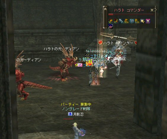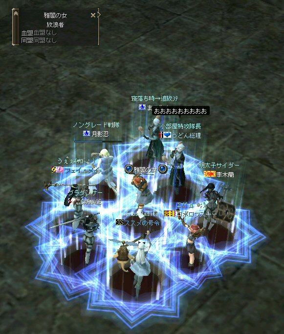 先週、話の流れから裸でノングレード戦隊になってしまったが、なかなか面白かった。 そこで今回は定番の『傲慢の塔』の予定だ。 傲慢の塔の5階は、ノングレードで行こうの原点のような物だ。 そう、DVCの浅瀬と傲慢の塔は思い出深い場所なのだ。 当時の俺が真っ赤な敵を相手に戦った場所。 もちろんPTメンバーがいてくれなければ、それは単なる特攻で終わっていた事だろう。 無謀な試みをして無駄に死ぬのは、ただの自殺行為と変わらない。 それは、遊びとは言わない物だ。 高レベルの狩場に、「ノングレードで行こう!」は無謀ではないのか? そう、無謀に違いは無いと思うが、死ぬ気は全然無い。 以前にも話したが、生き残りをかけた遊び方が「ノングレードで行こう!」だ。 全滅したらゲームオーバーなのである。 集まったメンバーではちょっと厳しいかもしれない1Fから開始。 相変わらず、手を変え、キャラを変えてBOTが走り回っている。 ここの連中が、数ヵ月後にどこかの血盟に所属し、盾職なのにヘイトって何ですか? とか質問するのだろうか・・・? アカウントを買う馬鹿がいなけりゃ業者だって商売にならない。 需要があるから違反してでも供給するのだろう。 また、ツールを使って高速育成なんてやってるプレイヤー連中もいるのだろう。 高レベルの方が戦争は有利だし、時間をかけてプレイできない連中は、 違反と知りながら、高レベルキャラクターを手に入れようとするかもしれない。 要は、高レベルで高額装備を身に付けている者が、俺TUEEEEEEEEできると、 そう言う仕様なのだ。 新規で初めてリネージュ2する人は、 70代とか80代のキャラクターが戦争してるのを見て、絶望するかもしれない。 戦争目的なら、レベル上げと高額装備は必須条件だからだ。 クランに入って、気のいい先輩から使わなくなった低レベルでの最強装備を借りて、 一生懸命レベル上げ…。 戦争に参加しても最初は敵の的にしかならず、結局は必死にレベルを上げ・・・。 早く高レベルになってクランに貢献できるようになる為には結局、廃プレイか 規約違反のRMTに走ってしまうんじゃないのか? ゲーム環境を提供している会社が、 低レベルしか参戦できないような戦場を提供すればいいのだろうが・・・ それも、古株プレイヤーのサブキャラクターがOEした武器で我が物顔で荒らすだろう。 やはり、低レベルでしか参戦できないような戦場を作るのなら、 そう言った不公平感を無くすためにも、『ノングレードで行くしかあるまい!!』 そうだ、俺たちは遥か未来を見据えてプレイしているのだw (ホントカ? ・・・とか、ノリはいいんだが、さすがに裸は痛い>w<; CARNAGEさんがw・・・ 戦死者が出てしまったw 魔法クリだったのかもしれないが、自分のHPを越えるダメージを受けて生き残る手立ては無いw ・・・ orz メンバーの一人がGMにBOTコールをした。 無事、キャラ凍結になる事を祈ろう・・・。 よし、2Fへ移動だ。 ここには先客がいてた。 火力もその人達と比べたら低いので、少し引いては各個撃破とかしてたんんだが… PTモンスター引っ掛けたw うはw ちょwww もう少しで全滅w 取り合えず『モンスターを引いて逃げ切り作戦』をしようと下の踊り場へ移動中 シルレンは足が速いので、モンスターを引いて逃げ切るのに成功する場合が多い。 逃げ切ったあとは、モンスターのタゲが外れるので舞い戻って体勢を立て直す… と言うのが常套手段(実は脳内作戦?)なんだが、 先に遊んでいたノングレとは無関係のPT(人達)にリザしてもらったらしい。 すでに体勢は整っていた。 3F、4Fもちらっと味見して5Fへw ハラトコマンダーが入り口から見えた。 単品のあいつから血祭りに上げようw と、近づいて矢を発射するときに、 入り口の影にハラトのガーディアンがいるのがチラッと見えたw 発射態勢に入った俺は止まらないw うはw リンク必須w でも2匹なら足止めと眠らせる事でなんとかいけるハズだw とにかくハラトコマンダーを引いて、敵モンスターの火力を分散させよう。 @w@; ハラトのガーディアンが何で2匹おんねんw 3匹はちょっと危険信号だw 全滅はマズイ。とにかくみんな攻撃をやめて、俺にモンスターのタゲを向けさせてくれw ・・・って想いに反し、みんな良く戦う。 ものすごい善戦だ。 コマンダーを倒し、ガーディアンへ火力集中。 ある者は床に転がり、ある者は火力の有無を無視して敵に立ち向かうw 本来、後衛職などと呼ばれている職は、支援が本職だ。 薄い防御で減らしたHPを可能な限り回復すれば、あっという間にMPは枯れる。 そして、戦闘職の火力で敵を殲滅するのを待っていられるほど余裕も無い。 後衛職業務も滞るほど、MPは枯渇た状況で殲滅時間が長くなれば当然全滅の可能性が高くなる。 だから、ノングレではヒーラーも戦闘に加わっている。 ノングレではそれが普通の状況。 ヒーラーはアタッカーとして、ヒーラーとしての仕事を受け持つ事になる。 なんと言っても本日は裸族なのだTwT; 守ってく