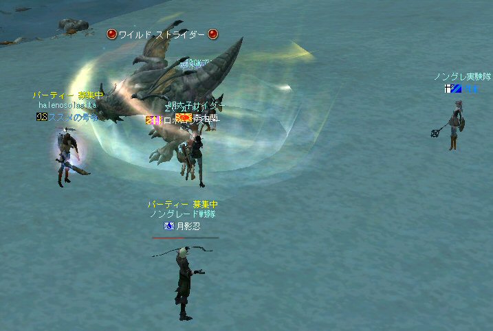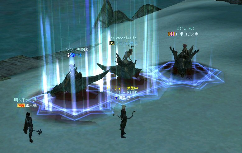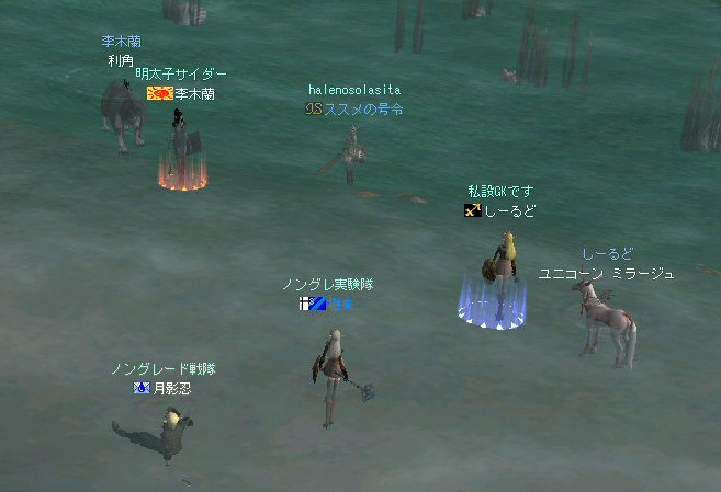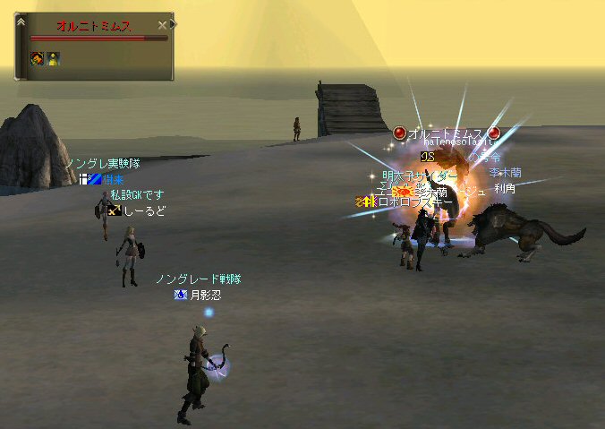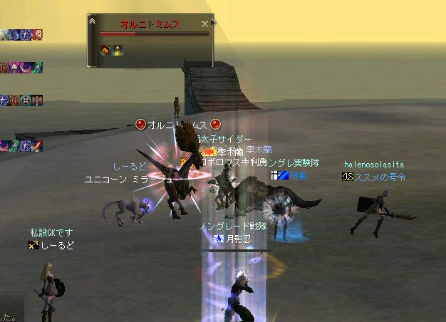 「もうすぐ課金が切れるなぁ…」と言う想いを胸に、どうせなら派手に行こうかと考えた。 初参加のしーるどさんがルウンに居た事もあり、怪獣島(太古の島)へ ここへ来たのは何ヶ月ぶりだろう… ちょっと懐かしい気もする。 何かにつけ、集まると何かやり始めるのがノングレード戦隊だ… ストライダーへ搭乗したままの5分帰還… いや、なかなか見栄えがいい。 あとで使おう。 さて、早速戦闘開始だ。 平原を見て、ちょっとびびったw 単品モンスターが見当たらない・・・ こんなにPTモンスター多かったっけ?ここ・・・ ってぐらいモンスターは沢山いるのに、ソロが見当たらない・・・ それでも無理やり見つける。 そう、太古の平原に巣食う恐竜型モンスターの単品を狙い、ダブルショーット!! ・・・とここまでは良かったんだが、3匹くらいついてきたw こいつもPTモンスターかよw (リンクした可能性もあるが) あっという間に死屍累々w 俺も逝った。 男の勲章ゲットw もちろん、様々な危機的状況を今まで体験して来た隊員達だ。 そう簡単には全滅しないw ま、一発で即死するダメージを受ける場合も多い場所だから、 戦闘不能も結構でたが、逃げのびた者も多数いる。 うーむ、やはりなめてかかっちゃイカンな。 今度の引きはススメさん。 美味い具合に単品を釣った。 戦闘開始! スポるしw 光るしw スウィープするしww 他のプレイヤーから褒められるしwww さっきPTモンスター引いちゃったとき、 褒めてくれたプレイヤーをMPKしそうになってたのは内緒だw (実は我々を、助けてくれた人だったりする ^^;) 本当にMPKになったら洒落にならんので、釣り場を少し移動した。 その後も単品を釣って戦闘を楽しんだ。 たまに複数引いてお祭りになる^^; ススメさん死にすぎ>w< 各プレイヤーとも、MPをバリバリ消費し、補助魔法の切れる時間も忘れ、 ノングレード戦闘を楽しんだ。 今回は、めったに死ななかった利角も逝った+w+; 日の傾いた中、俺達はお腹がすくのも忘れてモンスターとの戦闘を楽しんでいた・・・ なんか、リアル昔の風景みたいな感じがするな ^^; TVゲームも無く、情報化社会とは縁の無い時代。 そう、それはTVさえも珍しかった時代、子供達は外で遊んでいた。 建物も多くなく、町内には畑やら空き地やら、だだっ広い公園があった。 他人の家の庭だって子供達の遊び場と化し、みんな走り回りまわっていた。 学年の違う近所の子供達が集まって一緒に遊んでいた風景。 学校から帰ってから集まって、遊びまわって、気がつけば夕方。 そんな毎日・・・。 貧しかったけど、人の心は温かかった気がする。 リネージュ2では、 せめて、対人戦闘で人の心をすり減らすようなゲームにはなって欲しくないなと思う。 本来なら、対人戦闘はフェア(対等の立場)で行われるべきだと思う。 もし、人間のダークな面を育むようなゲームなら、いっそ無くなった方がいい。 俺としては、逆にゲームの中に癒しの場が欲しいよね・・・。 ま、癒しとしては『ノングレードで行こう!』はなかなかいい感じだと思うがw さて、 ノングレのモンスター討伐が一段落した所で、 馬と狼、どっちが強いの?ってな話がでて、 ユニコーンとBMWの一騎打ちが行われた。 召還獣とBMWの決闘など見た事が無い。面白そうだ^^ 結果(ほとんど見えんがw)、接戦だったw しーるどさんのユニコーンミラージュ(馬)の方が 李木蘭さんの利角(BMW|大狼)に勝った。 再戦したら判らんかも@w@; 最後の〆はもちろんノングレード帰還だw それもストライダーで帰還w 初めての試みは面白い>w<ノ という事で皆さんお疲れ様でした>w<ノシ (参加、ありがとうございました(^o^)ノ