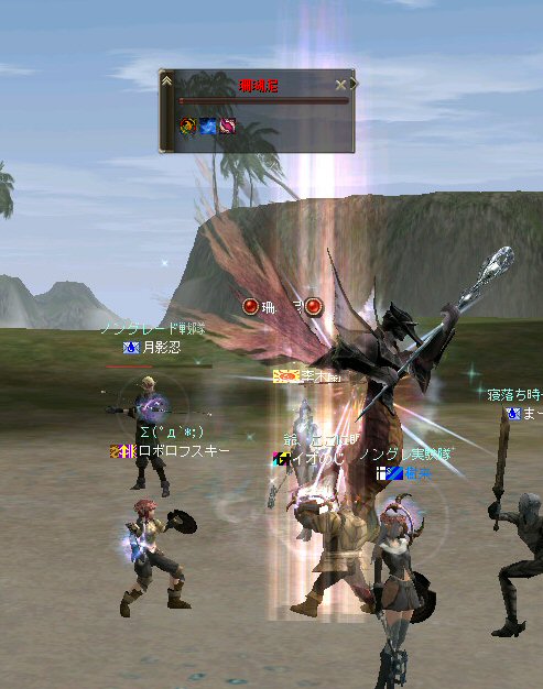 これよりノングレード戦隊は、 海岸線の浅瀬での作戦行動を内陸部へとシフトする。 奥地ではPTを組んでも大丈夫なモンスターが居るらしい。 行けるものなら行って見てみたい。 偵察だw 補助魔法を掛け内陸部へ移動開始。 入り口でもかなり苦戦した。 内陸部は一体・・・w こ・・・これは・・・ 浮遊大陸か? いや、敵の秘密基地かも知れない。 新しい城?アジト?砦?ま、なんにしてもいい感じだ。 やはり、リネージュ2のグラフィックはすごいと、改めて感心する。 しかし、それをストレス無く表示する為のスペックを持つPCを入手するとなると、かなりの投資になる。 =w=; グラフィックは美しいんですけどね…。 と、あちこちSSを撮りながら歩いてて、モンスター引っ掛けたw はい、犯人俺ですw 何とか殲滅。 いや~綺麗だね。 ピクニックに来たいものだ・・・ 危ないモンスターが居なければいいんだが・・・ ちょっと危なすぎるぞこの辺w 先を進んでいくと、両側を山に囲まれた渓谷みたいな通路に・・・ モンスターが何体かいて、行き先を阻んでいる。 もちろん、真っ赤なのは言うまでも無い。 60俺的には超真っ赤だw 単品で引いて道を作るか・・・ だが、 ・・・ 魔法攻撃が痛すぎるぞw あっという間にじっちゃんもロボさんも逝ったw HP俺の倍くらい無かったっけ?>w< とにかく倒さない事には先に進めないw ダブルショットでかなりモンスターのHPを削れる。 体力回復剤を消費しつつ、モンスターのHPをさらに削る。 半分切った。 あと4/1・・・ あと一撃でwwww で、ちょっとタイミングが遅かったみたい。 久々の全滅を味わった。 言っておくが『全滅』は、ここ数ヶ月無かったと記憶している。 ノングレード戦隊としては珍しい出来事なのだ=w=; 危険な事は何度もあったが、全員最寄るなど・・・ orz で、仲良く最寄って最後の〆だ。 定番のノングレード帰還w いや、参加した皆さんお疲れ様でしたw そして、俺のわがままに付き合ってもらって、ありがとうTwT; 今日もノングレード戦隊は、アデンの大空の下を駆け回る・・・。 さて、次はどんな冒険をしようか? ^^v この後、少し有志で通常装備のPTを組んでリハビリした。 こうして見ると、普通のPTも結構楽しいw (マテ おまけ 姉貴からの情報提供 奥地にはこんなのが居るらしい・・・
