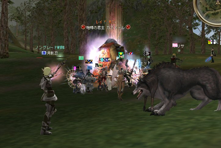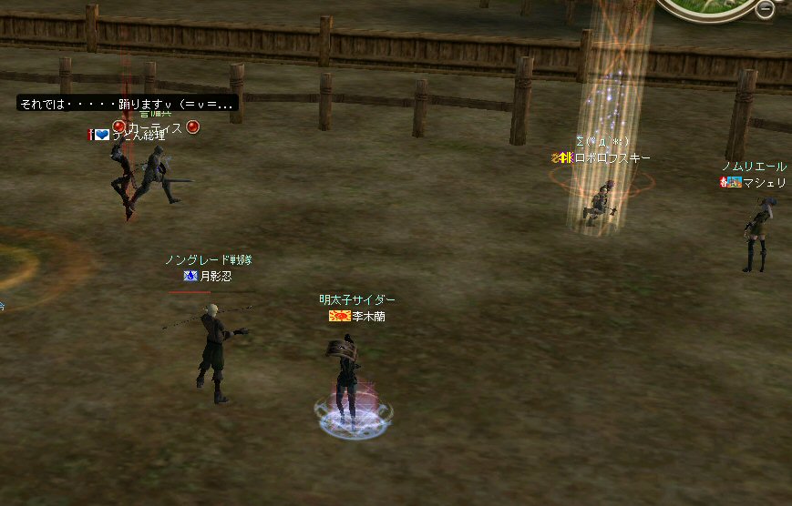 以前は21:00集合としていた集合時間も…今は21:30。 30分遅くしたにも関わらず、集まりが悪い(と言うか変わらない?)。 おまけに21:00前後はレイドイベント真っ盛りだ。 俺のスレよりも後のスレの方が 人々の関心の深さの表れかもしれない。 (たくさん来てもらっても収拾がつかないけどな^^;) 関心の深さ云々はともかく、 いったい、何時に集合するのがベストなのだろう? あまり開始時間を遅くしてしまうと、終わる時間が遅くなる。 遅くなると(参加者の)次の日の仕事に差し支えるからな…。 遅くとも12:00頃には終わらせたい。 東京都内なら通勤2時間と考えると、18時に仕事が終わったとして帰宅は20時。 (まあ、大都市周辺なら同じ様なものだろう) 順調に行けば、食事してお風呂に入って21時にINという所か。 残業が入ると、やはり厳しいな^^; 一応、22:20頃まで待って見た。 このままだと、ノングレを行う時間がなくなってしまうw 集まったメンバーで現地へ移動。 ちなみにマシェリさんは初参加。 ここは、要塞戦の舞台でもある。 要塞戦の仕様が導入され、初めて来る場所なので、 国境守備隊員(NPC)の仕様が変わっていると引きができなくなる可能性もある。 って言うか、国境守備隊員、居るのか? ちょっと心配だったのだが、いたいた。 要塞戦で、傭兵にとって換わられてたりしたらどうしようかと思っていた。 どうやら、首にはなっていなかったようだ。 いったん攻撃して反応も同じか試してみる。 普通に攻撃しようとしても仕様上、 出来ないので、強制攻撃( /forceatk )のマクロを作って攻撃。 一発、二発、三発・・・外れる@w@; お、当たった、 うまく引けそうだ。 で、いったんみんなで国境守備隊員を倒し、仕切りなおし。 さ、国境守備隊員をギランまで護衛しよう。 ギランのお母さんに会わせてあげようじゃないかw ギランへ向けて『国境守備隊員の護送作戦』開始w 今回の作戦の場合、弓職が複数いるのはとても都合がいい。 お互いに連携して、タゲが外れてもフォローができる。 おまけに接近せずに攻撃できるのでフットワークが軽い。 遠距離攻撃でヘイトを稼いで、タゲを取り続けることが出来るからだ。 オーレンの城村の横を通り過ぎ、南下を続ける。 ロボロフスキーさん、うどん総理さんと合流、 途中、SS(スクリーンショット)を撮りながらなので、守備隊員に叩かれる。 それをヒールする蘭さんにタゲが奪われがちだ。 アタッカーよりも婦女子を追い掛け回す守備隊員。 綱紀が乱れているなw 『俺の蘭さんに手を出すなwww』 怒りのダブルショットw アタッカーがタゲを何とか保持しつつギランへ ギランの街中を引いて見る。 知っている人は知っている、国境守備隊員の勇姿だ。 国境守備隊員君、お母さんには会えたかな? さ、せっかくギランの決闘場まで来たのだから、歓迎会だw 盛大なパーティで国境守備隊員は、酔いつぶれてしまった。 都会の酒が美味かったのか、そのまま天国へ・・・^^; せっかくなので、ギラン常駐の警備兵、カーティス氏も呼んで見ようw 国境守備隊員君は、ゴダードの国境付近から、ずーっと走ってきて、 アルコールの回りが速かったのだろう・・・ 駆けつけ三杯で逝った。 君はギランからすぐのこの場所で、もう逝くのかwww そか、君は下戸だったんだね。 知らなかった・・・。 一杯で、潰れちゃったよ =w=; などと冗談は置いといて、今日も楽しめた。 かなりの距離を引く事が出来た。 今度やるときは、さらに遠くまで引いてみたい。 協力してくれた皆さん、ありがとうございました^^ノ またね^^