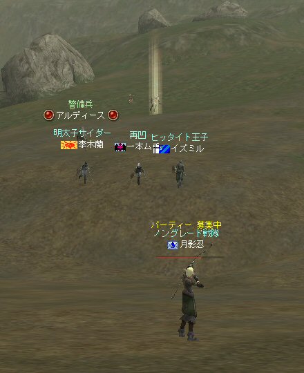 アデンは山の中だ。 たまの休暇と言ってもアデンの街中をぶらつくのが日常。 ハイキングに行くのもいい。 大自然の山々、咲き誇る草花、聳え立つ木々、 そして・・・その建造に至る真意が伝わる事無く、 事切れてしまった文明の跡、古代遺跡の数々。。。 モンスターが各地に棲みついているのは難点だが、 観光スポットには事欠かない。 しかし、海は遠い・・・。 そんなぼやきをアデンの酒場で聞いた。 退屈しているアデン城常駐の警備兵に、 日常からちょっとだけ外れた冒険を、 我らノングレード戦隊が提供してあげよう。 イベント真っ盛りの時期だと言うのに人が集まった。 今回は何とノングレ史上初のアカネキャラが参加だw ゲームの仕様上、無差別PKだろうが業者やBOT討伐だろうが、 白ネームのキャラクターを倒せば、倒したキャラの名前は赤くなる。 赤ネームには赤ネームの事情があるのだ。 我が『ノングレード戦隊』では、悪意のあるPK(無差別PKとか)以外なら、 もちろん参加可能だ。 ただし、赤ネキャラの場合、いつもとは違った要素が追加される。 白ネの時は、見守るだけの警備兵が攻撃してくるようになる。 つまり、アデン城村から出るときに攻撃されるw また、今まで気楽に村を通過していたが、そのたびに攻撃を受ける事になる。 当初、グルーディンの海の見える丘へ向かうにあたり、 宣伝をかねて猟師村とか通過を考えていたのだが・・・ それでは赤ネ参加の一本ムティさんの命が危ないw で、先週と同じ、傲慢を横切るオーレンコースとした。 対象の警備兵はアデン西門を警備している「アルディース」氏と決定。 アデンを出る際に、弓の警備兵を倒してからアルディース氏を連れ出そうとしたが、 弓の攻撃力が高すぎて、断念>w<; 何人か攻撃を仕掛けて見たが、皆一様にHPが半分以上持っていかれた。 今回、死亡者は出なかったが、クリティカルが出たら即死だ。 しかし、そうやって他の参加者がタゲを取ったおかげで、 ムティさんに向かうはずの弓警備兵のタゲが外れた。 そのまま城外に飛び出し、移動開始。 途中、ムティさんや、まーもんさんが落ちて、置き去り状態に。 まあ、ゆっくり進行してるし、途中時間稼ぎもしているので追いつけるだろう。 ヒーラーに矛先を向ける警備兵をなだめながら移動。 タゲ取りしながらのリレーは、結構たのしい。 今回は長丁場なので、補助魔法も途中で切れる。 タゲが他の人に移ったら自分に補助魔法かけ、他の人も同様に役割を交代しつつ移動を続ける。 ギラン領土へ。 なおも南下を続ける。 急に重くなる。アクティブモンスターもいる。 今となっては真っ青な敵だが、油断は出来ない。 いくら高レベルでも、ノングレード装備なのだ。 当然、アクティブモンスターも倒す。 ギラン村へ行くT字路で、俺が落ちたw クリエラは仕様か!? 復帰してみると、側には誰も居ないw T字路で西へ進路を変更、ダッシュで追いかけるw いたいた。 無事合流を果たし、グルーディンを目指す。 グルーディオ城村も通過。 新しく出来た要塞もちょっと見学しつつ(単なる道草w) 道草中に通常攻撃をしてしまったw クエストは普通に表示される。 こんな場所に来てもアルディース警備兵は仕事をしていたw グルーディンの村へ。 もうすぐゴールだ。 しかし、アカネのムティさんが居る事を忘れてはいけない。 村を通過しようとすれば攻撃を受ける。 さて、どうする? (つづく)