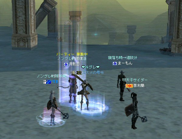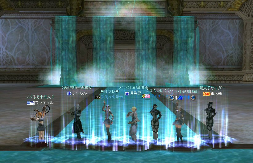「この中に、宇宙人、異世界人、未来人、超能力者がいたら、ノングレード装備で来なさい!!」 この命令に従って集まるキャラクターがいるとしたら、 恐らくは『涼宮ハルヒ』の名前を知っているに違いない。 しかし、集まったのはノングレード戦隊のみだった・・・。 しかもゴールデンメンバーだw はてさて、今回はどのような場所に行こうか・・・。 「ノングレードで行こう!」と言うサークル活動を続けていく上で、いつも悩みどこにろである。 そんな時、GyAo Animation で「[B-ch]涼宮ハルヒの憂鬱」を見た。 http://www.gyao.jp/anime/ いや、おもしろい。 と言うか「あーもー、なんか面白い事無いかな~」って感じに共感した。 そう、リネージュ2も突き詰めていけば、 「狩り」「PVP」「戦争」「ボス討伐」「クエスト攻略」「ペット育成」「金儲け」「製作」「その他」 多分、あそびを分類するならこれくらい。 目的を分類すると、そりゃ人それぞれになるか・・・。 普通の遊び方もいいけど、同じ遊び方ばかりじゃ飽きる。 「つまんない、つまんない、つまんなーい!」 告知もいつもと同じような内容だと、書いている自分に対して、 「つまんない、つまんない、つまんなーい!」と頭の中で連呼する声が聞こえる。 (読んでるほうも、『またか』で終るw) そろそろネタ切れか@w@ (最初からノングレ以外のネタが無い・・・) で、告知文を変えたが・・・反応が無い。 ・・・って言うかビュー数が少ない;w; とりあえず集まったゴールデンメンバーで考えた。 俺「今日は、どこ行こうか?」 みんな「んー、おまかせ」・・・って待てw 困ったw だが、俺もノングレード戦隊の隊長だ。 オーク脳(え?)でちょっと考えた。 「キノセイダキノセイダキノセイダ」 ヒューマン脳でも考えた。 「大切なのは愛だ。人間愛を育むような遊びというと・・・」 ドワーフ脳でも考えた。 「ノングレード戦闘における効率的な黒字になる狩りの仕方は・・・」 あーやめだやめだw 単純に、ここに行った事無いから、行ってみよう!! 『エヴァの水中庭園』 ノングレードで行こう!で過去、一度も行った記憶が無い。 面白いか、面白くないかは、行ってみればわかる! 早速、中へ進入だ。 ノングレードの冒険者に、サメも真っ青(事実真っ青)だろう。 モンスターとの戦闘自体に危機感は無い。 死ぬ事は恐らく無いだろう。 つまり、今回の冒険にて、生死を分けるような危機回避のドキドキは期待できない。 (ま、観光でしょう・・・) などと、どうでもいい与太話に花を咲かせながら、最下層を目指す! 久々にファティルさんも参加し、合流した。 なにせ40位のモンスターなので、真っ青。 ドロップなんて気にしないのがノングレード戦隊だ。 でも、たまに、スウィープが成功したり・・・ レアな本が出たり・・・ レイドボスも健在だった。 俺から見て薄青なので、攻撃しても石化出来ない。(マテ 高レベルな参加者は、石化を楽しんでいた=w=; 最下層の階、中央の塔を登ってみた。 この塔もPVPとかで使用できるとさらに面白いかもしれない。 PVPどうこうは置いておいて、グラフィック的にも綺麗だよなぁ・・・ここ。 でも、上がってきたのはススメさんと俺だけw 最下層から、さらに下の部屋へ行ける扉があるんだが、 他のメンバー先にそちらに移動していたw おーい、置いてかないでくれー ;w; ちなみに回りはアクティブなモンスターがうようよ居る。 入り口にはバリアが張ってあるのかそのままでは中に入れない。 みんなのところに行くにしても、そのアクティブモンスターが扉の前にいるじゃんw 引っかかったモンスターにかなり叩かれたが、 扉の向こう側をポイントし↑キーを押し続けてすり抜け、下の部屋へ。 (もしくは中に入った人をタゲって↑キー) 広いw 広くて綺麗な空間がそこにあった。 いったい、ここの部屋は何に使う予定なのだろうか? 使う予定で破棄された部屋なのか? それともレイドボスが出現する場所? 謎である。 しかし、いい場所だ。 ノングレード戦隊のアジトに欲しい所だ。 最下層の広い部屋への到着、一応一次ミッション終了だ。 さて、どうする? このまま5分帰還ももったいないし・・・ で始まる決闘&PVP大会w 当初、PVPの決闘大会。 エルダーと戦っても、眠らされ、MP焼かれ、攻撃すらままならないw とても嫌な相手だw 結局引き分けに。 メンバーで分かれてGVGもやってみる。 なんにしてもヒーラーが厄介。 眠らされる。MP焼かれる。www やっぱり、GVGの基本は、ヒーラーから潰すしかないみたいだ =w=; (姉貴、嫌がるだろうなー =w=;) 眠らされる前にスタン、集中砲火。 しかし、さすがノングレード装備。ヒーラーも瞬殺は無い。 スタン掛ける前に眠らされるとこっちが危ない。 かなり嫌な相手だ。 ヒーラーに限らず、CPとHPを削るために、かなり時間がかかる。 なので、GVGを楽しむと言う意味ではバランスがいい感じがした。 23時20分を過ぎた頃、フェイ・メイさん合流。 ノングレードに着替える暇も無かったので、装