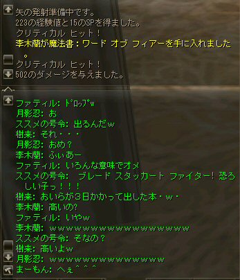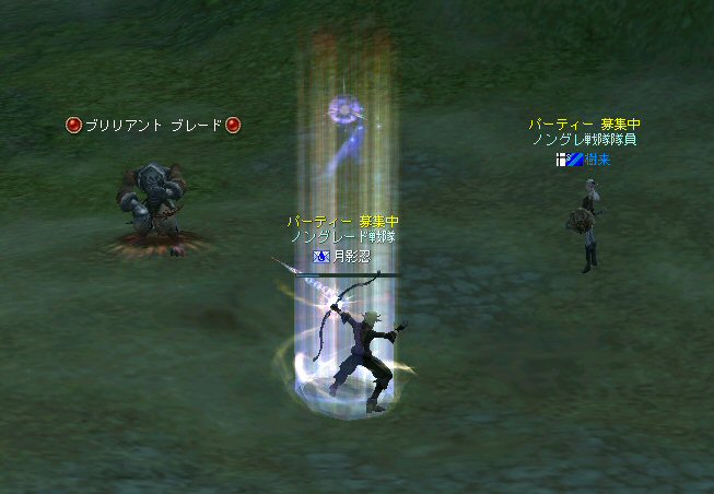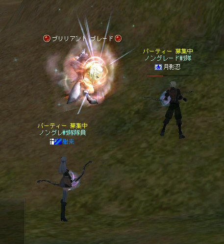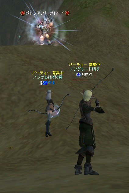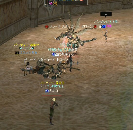 戦闘を開始したノングレード戦隊。 ところが俺のNSSが切れた。 弓職の火力はかなり高い。 PTの参加人数的に考えれば、主火力と考えていい。 その火力が半減したw 危機的状況である。 しかし案ずる事は無い! こんな事もあろうかと圧縮パックを持ち歩いているのだ。 一袋1000発入ってる。 ・・・え? 解凍できない!? またまたピーンチ!! スロット的にはまだ、空きがあるんだが、空きが無いと認識されている。 (80%問題か、はたまたバグか?) いずれにしてもここは押し切るしかない。 気持ちはあせるが、行動が伴わない…。 (今まで使った事が無いプレイヤースキルだw) … … … この回、ほとんど戦闘に参加していなかったので、 ススメさんとヒーラー(李木蘭さんと樹来さん)で倒したw 俺、何やってんだろう^^; さて、気を取り直してペットに荷物を退避。 圧縮NSSを3袋ほど解凍した。 今日は、ペットに頼りたくないので、BMウルフはしまうw 戦闘再開。 しばしノングレ戦闘を楽しんでいると、変なものがわいたw 怪しげな名前。 恐らくはBOTだろう。 出現したものの、時々補助魔法かけたりしているが、狩場へ動く気配が無い。 邪魔だw 俺たちここで狩してるんだけどな… ま、いっかw せっかくなので、彼らのそばで狩りをする事にした。 モンスターの範囲攻撃とかの巻き添えを食わせて楽しませてもらった。 そう、彼らがのんびり座って居られない状況を作ってあげた ^^v しばし、BOTで遊んでいると(すでに目的が違ってるw)、 また、集団のプレイヤーが、俺たちを観戦に来た。 (PM:多分普通の狩りをしにきた普通のPTです^^;) 彼らから教えてもらったんだが、 ここのBOTERは日本の不正プレイヤーが所持しているらしい。 戦争期間中は、BOTが居なくなるそうだ。 BOTは…と言うよりは、 不正プレイヤー(あるいは業者w)はドビ鯖から出て行ってもらいたいものだ。 まあ、リネの仕様の問題もあると思うけどね… 不正プレイはいけない。 ま、何にせよ、 久々の傲慢。楽しませてもらった^^v 参加メンバーのみなさん。お疲れ様でした^^ノ