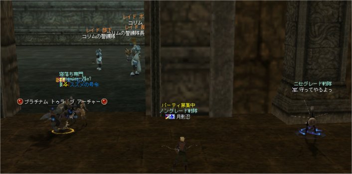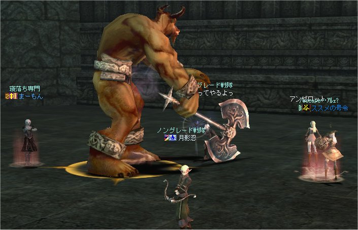 10階を、さっさと通過し、最上階を目指す! なw! 懐かしい!! 久しぶりに見た。まだ、生存していてくれたのか。 武器クエの時の対象レイドボスだった。今はどうなのだろう? とにかく硬くて、タゲ跳ねもよくした。ヒーラー泣かせのレイドボスだった。 ヒーラー職の姉貴も、予測不能のタゲ跳ねでよく死んでた(戦闘不能状態)。 苦労する分、倒したときの達成感は、なかなか楽しめたレイドだ。 それが・・・・・・・・・・・・・・・・・・・・・・・・・マジですかTwT; 何か、もう・・・言うべき言葉が見つからない。 システム的に、だいぶ変更が入ってたから、いろいろ変わっているんだろうなと・・・。 魅力だったレイド討伐のキーポイントだったのにね。 ここでは、危険度が上がって、連合内のPTでも、緊迫感があった。 ヒーラー職はタゲはねが起こっても、攻撃を受けている対象者の死亡を阻止し、 盾職もヘイトでタゲを戻して討伐するという流れに一体感があったと思う。 みんなで協力したからできる繋がりが好きだった。 そんな楽しいと思った仕様が、またひとつ、壊れていた・・・。 まあ、別の魅力があるならいいんだけどね・・・。 (その別の魅力を、俺はまだ見つけることが出来ていないし、無いかも知れんw) 同じ階の別のレイド。ここは、変わっていないらしい。 そして13階。 やっぱ、グラフィックのセンスすげーw そして、ここにもレイドが居る。 …って、 オイ!! いきなり手を出す所は、ノングレード戦隊の正式隊員に匹敵する愚行(?)だw。 こうでなければ、ノングレード隊員は務まらないw ノングレード戦隊に入隊しなさい!! お陰で、守ってやるよっさんは、 経験値が減った。 HPが減った。 慎重さが減った。 すばやさが減った。 運が減った。 レイドのティミングに成功した。 (ぴろろ~ん♪) 隊長が、見本をみせちゃる!! ・・・・・・・・・。 冗談はさて置き、死なないよう引き回していたら、 13階とバイウムの階が階段で、ループしている事がわかった。 これは、新しい発見だった。 しばらく追いかけっこを俺は堪能したんだが、 他のメンバーは呆れていたかも知れない=w=; 不思議と、他愛ない、こんな追いかけっこが楽しかったりする。 死ぬかもしれないリスクと、 NPCになんとか一泡吹かせるような、そんな行為が出来ないだろうか?とか この装備で殲滅できないだろうか?とか いろいろ考える。もちろん選択肢はあまり無い。 逃げ切ったら『勝ち』が基本かな。 だけど、狩りや戦争以外にも楽しみ方ってあるんじゃないか? どんな事をしたら楽しいんだろう? 自分達はなにをおもしろいと感じているのだろう? ある意味、開発側の想定外の遊び方を見つけられたら俺達プレイヤーの勝ち! 決められた環境の中で、遊び方を創造、発見し、産み出す。 『有る物で賄う』が基本だから、装備とかも関係ない。不足は気合とチームワークで補う。 それが「ノングレード戦隊」なんだと思う。 そんな視点から、今のリネージュⅡを見てみると、 開発側の傲慢さや、クレーマーに対しての過保護さが見えてこないだろうか? 仕様がどんどん縛られ、自由度がどんどん奪われる。 ゲーム内の自由度が奪われる=ノングレードでの遊びの可能性が奪われる 開発側の「こうやって遊べ!」が俺にとっては息苦しい… 以前は5分間、魔方陣のゆったりした変化を楽しんでいた(前にも同じ事話してるよね?)。 今回もノングレード戦隊恒例のフォーメーション組んで、『5分帰還』を懲りずにやったが… 今、エフェクトは30秒で消える。 ススメさんが主催した『5分帰還イベント』は、もう出来ないだろう。 ノングレード魂全開のイベントで、とても好きだったのに。 ま、木曜恒例のノングレード公式イベントは、今回で終了だ。 みんな、参加してくれて、有難う^^ たのしい時間を過ごす事ができました。 m(_ _)m また、無料期間があって、縁があったら、またやろう。 その時、知り合いが残っていればいいが…(;T△T;) (もちろん、一緒に無料復帰でもおk) PR