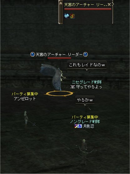 (何か、セーブデータみたいだ=w=;) 7階には、アブナイ血盟の人が放置されていた。噂では羊さんより危ないらしい…。 もっとも、羊さんから直接危害を受けた事が無いので、本当に危ないかどうかは、 俺にはわからない。 昨年9月に無料復帰していた頃、DVでノングレードで行こうをソロ(;w;)でやってて モンスターに倒され、転がってたんだけど、そこで助けてくれたのは、 偶然通りかかった、羊の(俺の記憶が正しければ)ダークエルフのお姉さんだった。 なので、噂で聞く羊さんに対しての他の人たちのイメージと、 俺が自分の目で見たイメージとはかなり違うようだ。 (少なくともプレイスタイルを尊重するプレイヤーは居ると思っている) それぞれのプレイスタイルがあり、お互いにプレイスタイルを尊重するのであれば、 それがどんなプレイスタイルであっても構わないと思う。 だが、お互いのプレイスタイルを尊重しない輩が居るのも事実だろう。 共存を目指すのではなく、無差別に排他を目指す集団。 噂が本当なら、ツから始まるその血盟(伏せてはあるが)は、そういう輩の集まりらしい。 (戦争血盟同士は排他するのがお互いのプレイスタイルで、無差別じゃないからOKw) 後で、ごたごたするのも嫌なので、この階はスルー(通過)しようw ↑俺も欲しいw うぁ・・・まぶしい。 そして、何て美しい夕日なんだ。 写真のようにリアルな、そして懐かしい光の感じは、筆舌に表せないほど素晴らしい。 こう言う景色に出合いたくて冒険していると言ってもいい。 これがリネージュⅡの本来の魅力だ。 だが、時間も無いので先へ進む。 9階、なにか、モンスターの形は一緒っぽいが、名前が違ってる? 新しく配置られたレイドボス。クエストモンスターらしい。 叩くしかあるまいwwwwwwwwwwwwwwwwwwwwwwwwwwwww 倒すwwwwwwwwwwwwwwwwwwwwwwwwwwwwwwwwwww 俺の矢がしこたま刺さっている。 1PTで倒せる事自体はうれしい気もするが、それにしても、レイドの強さじゃないだろw 時間はかかったし、俺のレベルのダメージはそれほど与えてなかったと思うが・・・。 レイドボスじゃなくて、普通にクエストモンスターでいいんでないの??? 倒したwwwwwwwwwwwwwwwwwwwwwwwwwwwwwwwwwww さらに上へ昇るぞ!! つづく