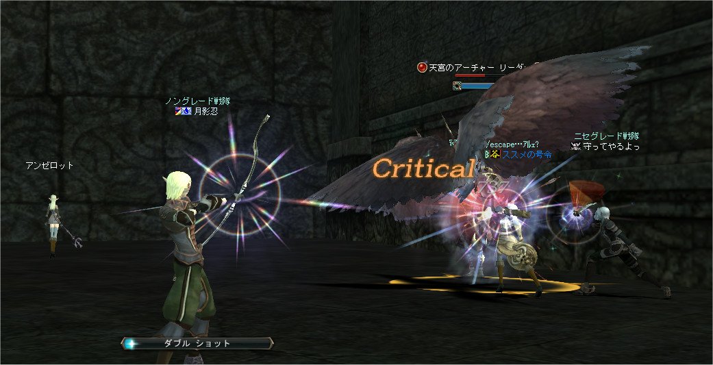どこかで見たことのあるような・・・ たしか、どこかで叩いて遊んだ気がする・・・ なぜ、こんな所に? こいつ、門番とか仕事サボってこんな所に? お仕置きだw NPCでこんな所に配置されているから、反撃してこないのかと思いきや、 しっかり反撃されて死んだwwwwwwwwwwwwwwwwwwwwwwwwww (PM:モニターの前で吹きましたw) ならば、やるしかあるまいw 叩いて!逃げる!!!!!! アデン中央広場で、鬼ごっこw だが、やはり糞な仕様だ。門を出る前に、定位置へ戻っちまう。 はぁ~。少しは遊べる仕様にしてくれよ~;w; ま、NCに期待しても駄目か。 クリティカルでダメージ14って、こりゃ倒せんな。多分=w=; 高レベル仕様にシフトしたのかもしれない。 ノングレード戦隊にとっては、冬の仕様だ。 そして春が来る事は、恐らく無い =w=;