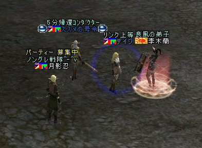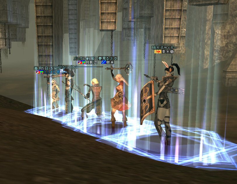マスターがPCの電源を立ち上げた時点で21:10位だったと思う。 マスターが主催を始めて、初めての遅刻だ。 プレイマスター「定刻に集まって頂いたみなさん、ごめんなさい」 アデンの中央広場では、すでに蘭さん他、参加希望者が数人。 前の日に告示したせいか…? 今日は人が多い^^v しかし、ススメさんの姿が無い。 蘭さん曰く、台風の影響らしい。 今年は特に、九州方面に台風が集中して大変な事になっている。 リアルが大変なときに、「リネージュⅡ」をやってはいけないw ススメさん、大丈夫だろうか・・・ さて、集まったメンバーでどこへ行こうかという話だが・・・ 今回は、人も多いがレベル帯も40代からの参加がいる。 初参加も多い、かつ、 「GK代が高い>w<;」 と、ギランで立ち往生している参加者もいるし・・・と言う事で、 DVCへ行く事にした。 思い返せば、第一回目の「ノングレード装備で逝ってみよう!」は、DVCだった。 公式ページのイベント告知でも書いたが、 ============================================================================ 高いレベルの人で、ノングレード装備でどれくらいの狩場までいけるか? ノングレードの装備者でPTを組んで、いろんな狩場を狩り回ってみようというだけのイベントです。 自分の装備できる最上位グレードの装備を身に付け、OEし、経験値やドロップを追い求めて、狩りをするのも楽しみ方のひとつ・・・ま、これは良く見かけるプレイスタイル。 いい防具にいい武器なんて、接続時間が限られている人は、接続時間の長い人にはどうあがいたって、かなわんよなぁ・・・商才でもありゃ別かもしれないが・・・ でも、楽しみかたは、ひとつじゃないと思う。 OEできない装備を使い、己のレベルとプレイスキルのすべてを駆使してハイレベルな狩に挑戦してみよう! 経験値、SPとも激マズ。赤字必須。スリル満点、いつでも逝きそう(;´Д`) w。 ~略~ 1年以上前のノングレ告知 な・・・懐かしい(・・・のは俺だけか^^;) 仕様の変更に伴い、死亡ドロップが無くなったり変化は多少あるものの、 やってる事は今も、あまり変わらない。 当時は、ノングレの可能性が未知数だった。 いったいどこまでいけるのか? すぐにも逝きそうな「ノングレ」のイメージ。 「同レベルや高レベルのMOBには歯が立たないのではないか?」と言う不安。 新しいこと、未知なる領域へのチャレンジには、不安と期待がてんこ盛りだ。 PTで最強装備を身に付け、力押しでモンスターを倒すプレイスタイルでは味わえない、魅力がある。 今だから、このあたりでこの火力なら大丈夫とか、ここは危険とか、感覚で見えてくるものも、培ってきた成果と言えるだろう。 ============================================================================ そう、やっている事は1年前と変わらない。 でも、一年前とは感覚が違うのは確かだ。 そして、 ノングレ戦隊に不遇職は存在しないw よろしく (^ー^)b これも最初から変わらないコンセプトw 今回、職としては始めてのWL(ウォーロード:槍職)の参加が^^v 参加者が集まるまでDVC入り口で少し狩りをした。 俺のレベル(50代中盤)で適正くらい。 入り口で小手調べで、フィールドのモンスターを倒して火力の確認。 感覚ではあるが、火力的には、いつもより少し低いかもしれない。 もっとも、いつものメンバーだけで来た場合より火力が高いのは確かだ。 さて、今回はどこまで行けるだろうか? DVC入り口あたりのモンスターを倒せないと、当然先には進めない。 「倒せる!」 しかし・・・・硬いw 火力が足りないかもしれない。 みな、それぞれのスキルを使い、ノングレードの感覚を覚えていく。 特筆すべきはWL職のスキルの、サンダー ストーム(範囲スタン)だろう。 敵の多い少ないに関わらず、ノングレード装備で闘っている以上、攻撃を受けた場合のダメージは大きい。 ヒールのタイミングもMPの兼ね合いも有る。 シルレンのスタンショットは単体にしか発動できないし、失敗も多々有る。 そんな、PTの危機的状況で、このスキルはありがたい。 PTメンバーが何度かこれで助かっている。 途中、gorudora さんが抜け、 かわりに そるたん さんが参加。 レイドボス化したモンスターを倒し・・・。 前回も、その前も、プラントとかに阻まれていけなかったその先に・・・。 そこで目にしたものは、今の火力では到底進む事の出来ない世界。 普通ノングレでここまで来ないってw そういう意味では、ノングレPTのメンバーはすごいと思う。 自分で言うのもなんだが、『俺達って、クールだぜw』 という事で、参加した皆さん、お疲れ様でした^^ノ