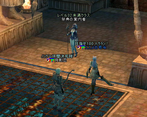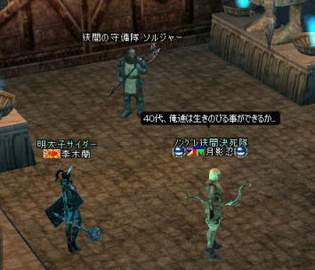 ========================================================================== 【情報】 あえて言おう!ノングレードで逝こう!!(定例3月2回目) 作成者:月影忍@ドビアンヌ 作成日:2007.03.08 11:06 定例「ノングレードで逝こう!」の日です。 今日はリアル事情により俺のINが遅れる可能性がありますが、 サークルメンバーによりPTM等による参加者募集は行われる予定です。 21:00頃~アデンあたりでw サークルメンバー以外の人で参加したい人は、 全身ノングレード装備で40以上であれば参加OK。 害行為を行うキャラクターについては参加をお断りします。 人が集まらないと、狩場制限が厳しい><; さすがに、ノングレード装備でペア狩りはきついぞw (ちょっと愚痴) ノングレードで火力が不足するのは仕方が無い。 効率を求めるなら、やはりデラックスな装備を揃えた方がいいに決まっている。 しかし、普通にPTを組む事ができれば、普通にPTを楽しむ事が可能になる。 フルNSSでなくても狩りは可能。黒字にする事だってできるw (当然、消耗品費を引いた最終的な利益だ) (フルSSによる戦闘は赤字になる可能性が高いw) これも、実際やってみた結果だ。 ライトユーザーは、廃人効率プレイは不可能! ならば、他の遊び方を模索しよう。 共に、知恵と勇気とプレイヤースキルを使って、リネの遊び方を考えようではないかw 新規、ノングレサークルメンバーも募集中。 ========================================================================== …とドビ鯖掲示板に書き込みした。 前の日に、ススメさんにお願いして、当日、先に開始していてもらった。 マスターのリアル用事の方が終わったのが21:30を回った頃…。 それからダッシュで帰宅したらしい。 ススメさんの1000人エスケープイベントの後で、ギランのはずれにいたw 「アデンじゃ無かったw 急いで移動しなくてはw」 と思いきや… ススメの号令「悪魔島でいい?」と連絡が。 俺「おkk」 内心、助かったw 近くジャン^^; 俺の装備がCだったので、急いでノングレに着替える。 そう言えば、弓職の俺は、悪魔島にはあまり来た事が無い。 姉連中は、何度か来ているらしいが…。 GKに悪魔島へ飛ぶ。 本日のメンバー4人 ミッション:『悪魔島探検(海賊船を目指せ!)』 早速移動。今の所、敵は真っ青だ。 お、あれは、一度は手にしてみたいハザード弓ではないか@@; 手が届きそうで手が届かない^^; 途中のQK場所の傍に、レイドボスが湧いていた…。 休憩時間中… ノングレのレイド討伐は難しいかもしれない。 なにせ、人が集まらん。 レイド討伐なら、普通の武器で普通に討伐した方が儲かる事が多い。 ノングレード装備でレイド討伐を行う場合、火力を上げるには参加人数を増やすしかない。 少人数でやる場合は、高レベル者の補助魔法必須だろう。 少人数とはいえ、1PTや2PTで火力が足りるかと言えば、無理だろう。 わざわざ全滅のリスクを犯し、大人数で分配を減らしてまで、ノングレでレイドを討伐するメリットが、 普通のプレイヤーには無いのだ (ノングレプレイは仕様上可能なプレイではあるが、効率を無視した特殊なプレイ方法だと思う)。 最悪、ドロップ無しもありえる。 ノングレード装備に理解のある人間しか、恐らくは参加しないし、そう有るべきかも知れない。 ノングレ愛好家が増えなければ、レイド討伐は難しいな…^^; 『それでも、やってみたいノングレレイド討伐…』 なんて事に思いをめぐらせていた…。 さて、先を急ごう… この辺になると緑色ネームのモンスターになる。 だいぶ奥地に来たのだろう…。 単品ならどうと言うものでもないのだが… (弓職二人いるし、火力はそこそろある) しかし、数の多いPTモンスターはダメだw 例え青ネームのモンスターであっても、数が多いとどうにもならない。 おまけに、このあたりでNショット切れてる人もいるし^^; 皆さんで『最寄りの村』へw ギランの街中で5分帰還w 密かに目立っているのが、快感にw ミッション:『悪魔島探検(海賊船を目指せ!)』本日未完了!! なんとか、海賊船まで行きたいねw 次回、リベンジしよか? と言う事で、皆さんお疲れ様でした^^ノ