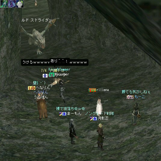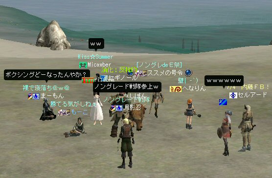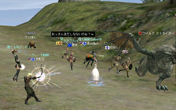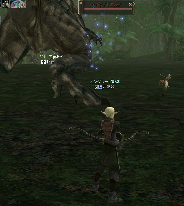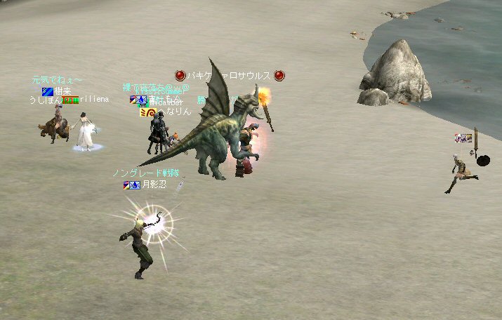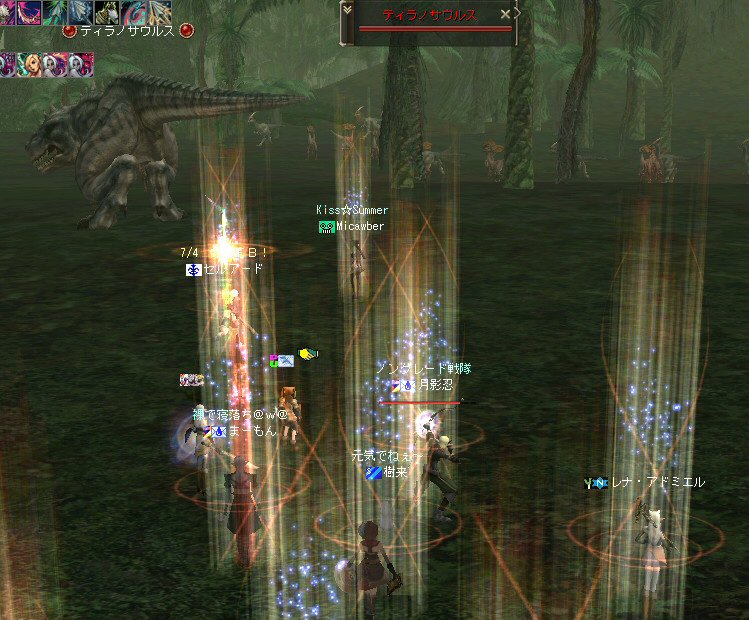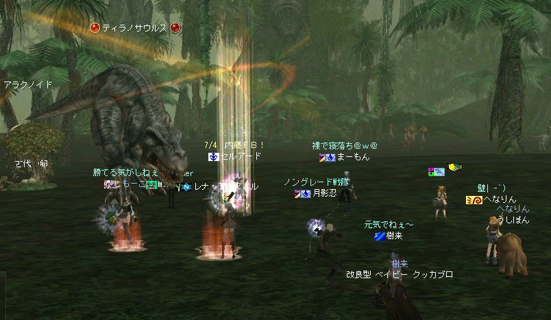 ススメさんがノングレやるって言うんで、参加してみた。 ログアウトしたのは広場だったはずなんだが、現れてみると、南門そばの花壇・・・。 まあ、いろいろアップしたから配置移動されたんだろうな・・・。 さて、場所は怪獣島だ。 NCJの料金改定が行われて居ないため、未だに100カイモ1時間と割高な設定。 急がねば・・・ ルウンのゲートキーパーに「太古の島乗船場」が追加されていた。 便利な世の中になったものだ… 無事、怪獣島上陸。 いつものメンバーっぽい^^; ノングレは不滅・・・と言う事か??? 早速、ノングレード戦闘開始。 レベルの高いモンスターは、やはり攻撃が当たるほうが珍しい^^; スキルを使って攻撃しないと、一向にHPを減らせない^^;;; リンクして全滅の危機にwww (樹来さんのリコ発動!!一部死亡放置 =w=;) 俺の弓を射る姿もかっこいいなぁ・・・他のゲームは見るに耐えないものが多い^^; 足元を見れば、 テクスチャではない、オブジェクトとして作られている貝殻が・・・ 3D世界としては、期待以上のクオリティの高さ・・・ この世界を構築する情熱は、半端じゃないと思うんだが・・・ 反面、ゲーム世界の仕様の期待を裏切る「糞ゲ化」はどうにも止まらない=w=; BOTも多いらしい・・・ まあ、せっかく「怪獣島」に来たんだからティラノ倒そうw ってな話しが出て行くことになる。 だが、すでにこの時、システムログには課金が切れるまで5分だったのだ。 誰だよ5分で倒そうとか言ってる奴www 勝てる算段なんか、まるで無い特攻ゲームになってはいるんだが、 戦いは熱かったw うおおおおおおおおおおおおおおおおおおおおおおおおおおおおおおおおおおwwww と、盛り上がって来て、死ぬかも知れないと頭をよぎった時、回線が切断された。 今度、INする時は、ティラノがうろついている場所かもしれない・・・ =w=; PS:みんな、参加させてくれてありがと^^ 楽しかった。