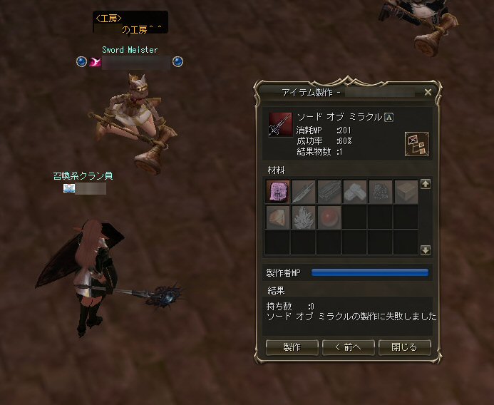 クランの支援もあってやっとSOM(ソード オブ ミラクル)の材料が揃った。 思えば長い年月だった・・・。 憧れて、恋焦がれて、やっと製作までたどり着いた。 (ここまで来るのは本当に大変だったのだ・・・) 半分諦めかけていた、SOM・・・最近は、売りもあまり見ない。 果たして、運命の女神は微笑んでくれるのだろうか? 「ソード オブ ミラクルの製作に失敗しました」 ・・・運命の女神に見捨てられたらしい・・・。 リネ2を愛したプレイヤーを見捨てる神、もはや、このゲームに やる気が消失した。 気合が消失した。 気力が消失した。 材料が消失した。 アデナが消失した。 材料を集めた時間が徒労に終った。 夢が消失して、未練だけが残った・・・。 姉貴は女キャラだからなw 男らしくないとか言わないようにwwww まあ、60%製作は、やる気を殺ぐ究極の仕様だったな。そう言えば・・・ 100%の図なんて手に入らないし(見たことも無い=w=)・・・ あとは課金切れの日を待つばかり・・・ (まだ、図とコアは残ってるんだけどね^^;)
