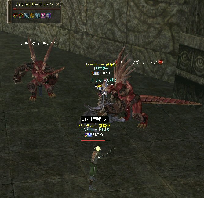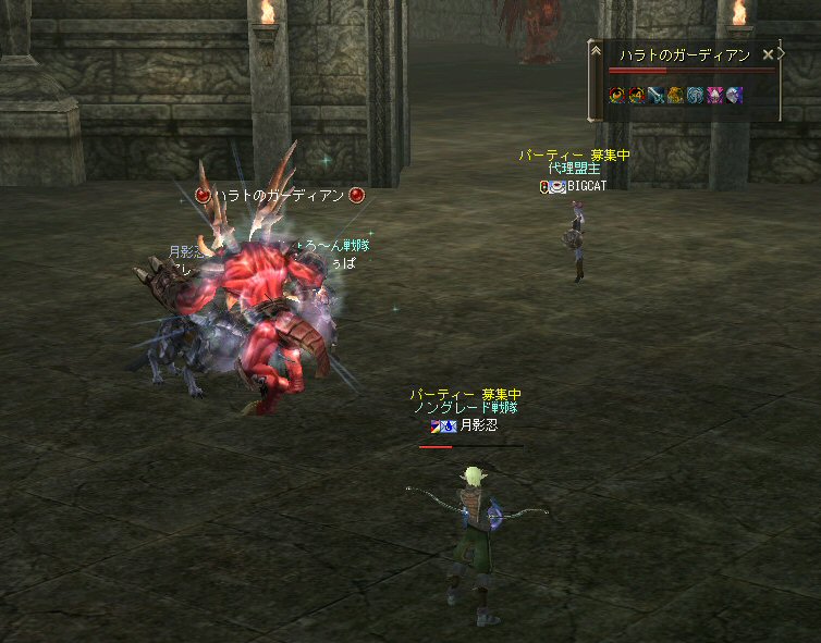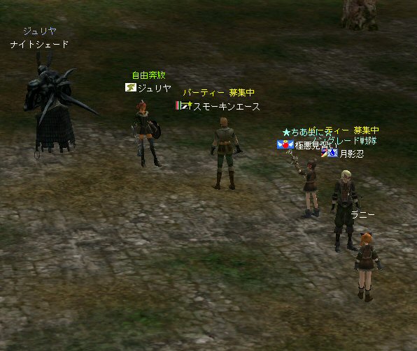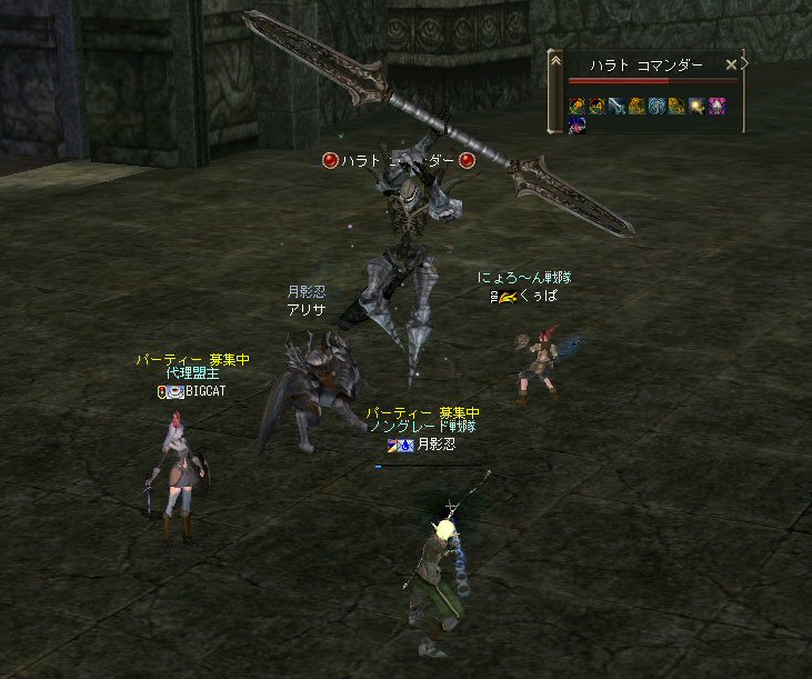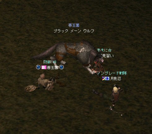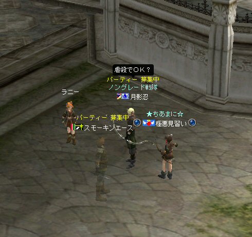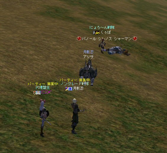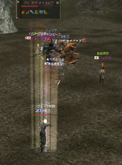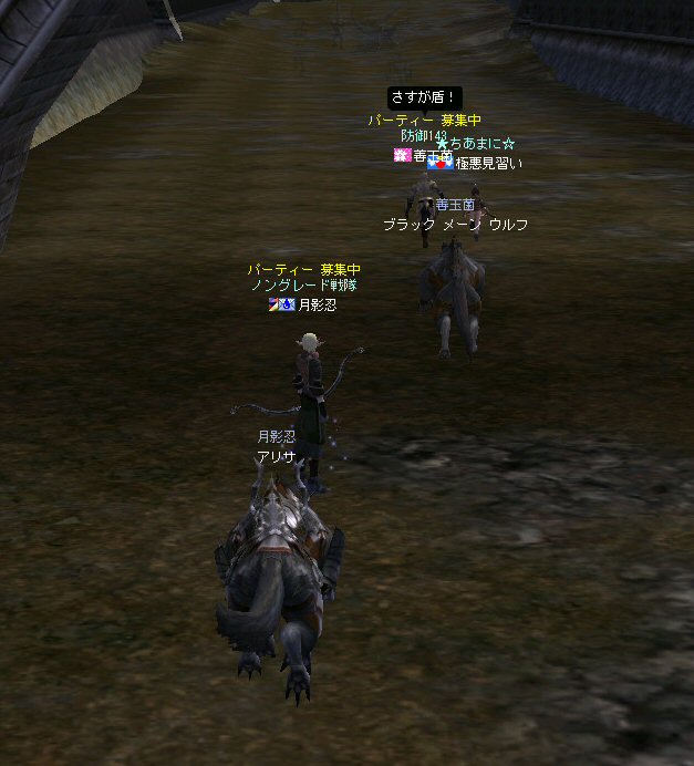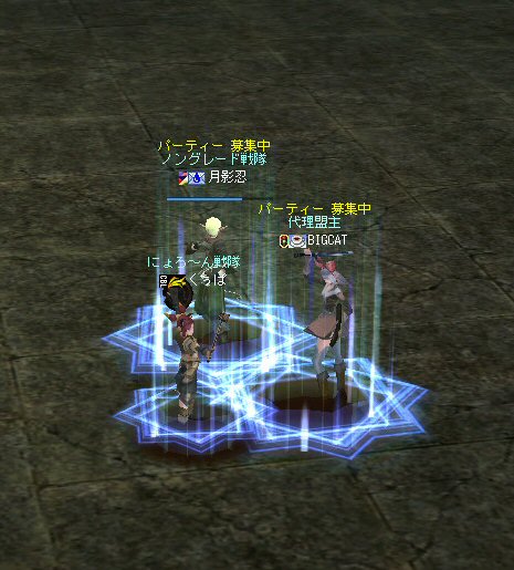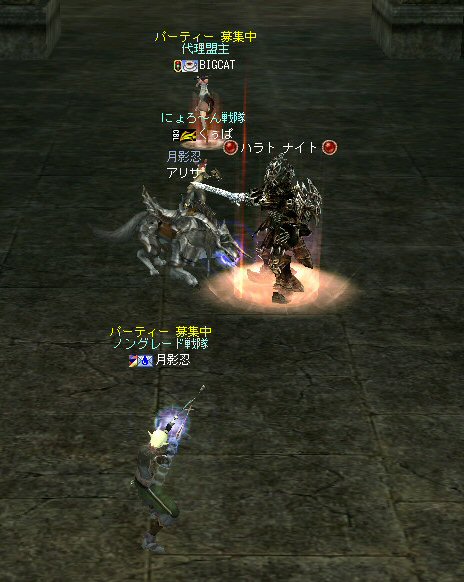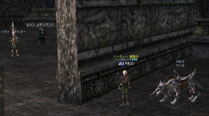 モンスターとの生き残りをかけた知恵と勇気と戦いの物語を一緒に綴ろうじゃないか。さ、今週もノングレードで行ってみよう!! ・・・と告知してあるにもかかわらず、定刻に人が来た事が無いw それから20分間…業者っぽい名前のキャラクターがPTMに来たので、 「ノングレードで行こう!に参加希望ですか?」 と聞いたら、「はい」と答えたので誘った。 しかし、その後は無言…話しかけても答えない。 本人がやってきて、装備を見るとCグレ装備…。 何だ?こいつ… 「イベント掲示板読んでくれてるよね?」 (一応、PTM募集にイベ板参照と注意書きを入れてある) しばらくして、無言のうちにPTが解散された… おいおい…そりゃ、俺に失礼だろうw やはり、業者だったのかも知れない。 …やはり人が集まらない。 ま、いっか。 22:00もまわって、しばらくすると、BIGCATさんとくぅぱさんが来てくれた。 ソロしてたんじゃ、ノングレの意味が無いしね ^^; 一階、二階と順番に登って火力確認。 なにせ、3人だからな=w=; BIGCATさんがヒーラーで良かった。 3人ともアタッカーなら、かなり困難な冒険だった事だろう。 途中の階では、壁向こうのモンスターも口寄せの術(?)で呼び、倒した。 それにしても、3人の火力だと単品がやっとだな。 アリサ(ライディングウルフ:♀72歳)投入でやっと普通の狩りっぽい。 そして問題の5階。 本当は、人数集まれば傲慢の塔登頂と洒落込みたかった・・・が、 3人では5階を通過するのも躊躇われる・w・; 結局、安全策で入り口での戦闘のみ。 もっとも、安全かと言うとそうでもない。 リンクにスタン攻撃、3人+1匹だからまだピヨっても何とか凌げるが、 ペアだったりしたら生き残るのが難しい^^; まして、アリサがいるから何とかなってるが、居なかったら全滅の可能性が大きい。 それにしても、参加者がめっきり減った・・・。 せめて固定メンバーだけでも、 この日この時間だけはみんなで遊べる様にとサークル活動化したかったのだが、 ノングレ戦隊の正式隊員がINしてこない。 また、INしてても、すでに所属クランの中での役割があって、参加が難しいようだ。 それに、リネージュ2の自由度も、 最初の頃とは随分変わって遊びにくくなってるのも確か。 だが、これが直接の原因ではないだろう・・・ ドビ鯖に残るプレイヤーの意識の問題が大きいのかもしれない。 効率をそれほど重視しないプレイヤーほど、INしなくなっているのかも知れない。 その中で俺たちは「希少価値的存在」なのかもしれない・・・。 なんにしろ、一緒に遊べる仲間が居てくれるのはありがたい。 そして、それが楽しいと思う。 装備とか集めたり、レベル上げたり、戦争したりするのも「楽しさ」の形ではある。 欲が先に走って、人を人とも思わない扱いをするようなプレイヤーが増えるのは、 正直うれしくない。 そしてそんな扱いを受けて、「装備が貧弱だ」と気にしたり、 効率ばかり気にして何か言われるんじゃないかと小さくなって遊ぶのもおかしな話だと思う。 お互いを大切に想える・・・そんな仲間がもっと増えてくれたなら、 「ノングレ戦隊の価値」もあると言えるんだがな・・・。 参加してくれたお二人さん、ありがとう^^ 楽しかったです>w<b