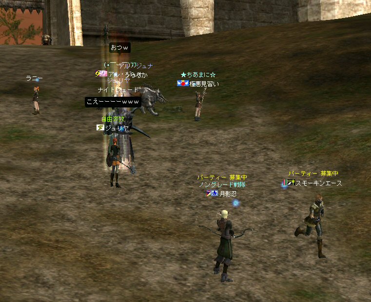 発足してから3年が過ぎ、 すでにネタPTと化しているこの「ノングレードで行こう!」では、 今度の「祝福されし力」のアップでも祝福されない。 (70後半のレベルでなきゃ遊べない仕様じゃ、ライトユーザーアウトだろ;w;) 元々、戦争や血盟で遺恨を残したり、 種族や職やレベルや装備で差別する遊び方が嫌で始めた。 それは、所詮NCの想定外の遊び方なのかも知れない。 見方を変えるなら、圧倒的少数派の趣味のプレイスタイルw それも有志が集まってナンボの世界だ。 集まってくれる人が居たから今まで続けられた。 支えてくれた人達が居たから何度休止しても復活してきた。 だが、そろそろ限界っぽい。 引き継いで「ノングレ戦隊」を続けてくれる人材が居ればいいが、後継者が居ない場合は、 「ノングレードで行こう!」の終了が近い事をだけは伝えておこう・・・。 =w=; ってか、課金安くしてよw NCJさんwww (そっちが本音かwww) 公式ドビ鯖掲示板