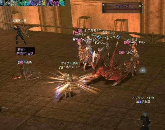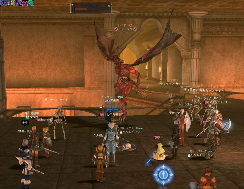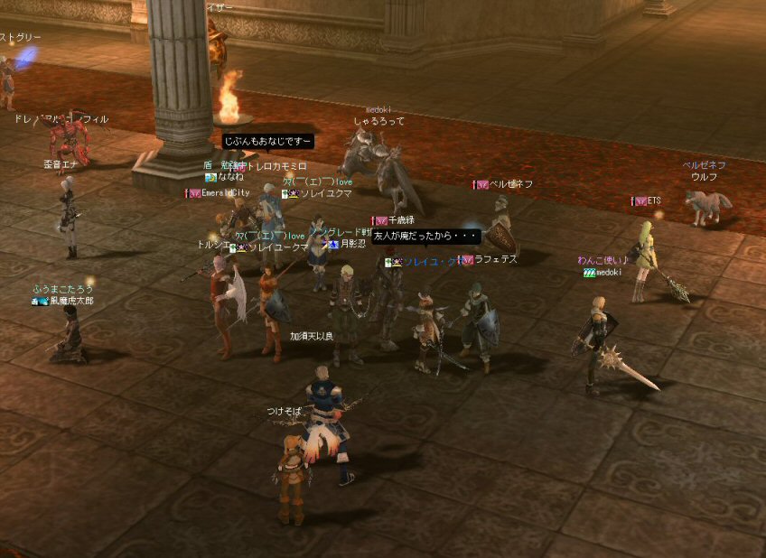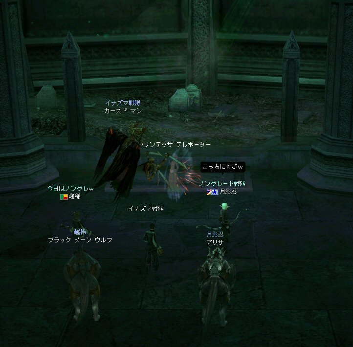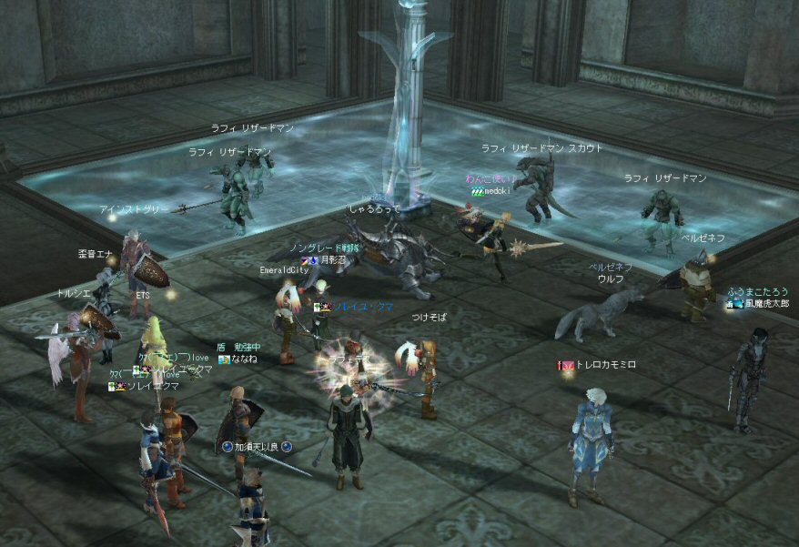 【雑談】 動画作成に協力してくださる方募集(再掲示) 【抜粋】 ほとんどの方は始めまして。某動画サイトでLineageIIの紹介動画を作成している者です。 これまではクエストの紹介を行ってきていましたがせっかくのMMOということでPTプレイを 紹介したいと思っています。 そこで、動画作成に協力していただける方を募集させていただきたく書き込みしました。 集合日時:本日 7月3日(金) 21:00~ (出発21:20くらい) 集合場所:グルーディン村南口(PTMも開く予定です) レベル:20以上(上限は設けませんが40までを推奨) 装備、職業問いません。 狩場は忘れられた神殿を予定しており、即死しない程度ということでLv20~とさせていただいて いますが、多少足りなくてもかまいません。目安と考えてください。 名前は消した状態で録画しますが血盟旗は映りますのでその点ご了承をお願いいたします。 効率は度外視したPTとなる予定ですのでその点もご了承ください。 あまり行くことが無くなった狩場を懐かしみながらワイワイ探検しましょう。 時間は約1.5時間くらいを予定しています。 こう言ったイベントは大事だと思う。 ノングレード戦隊に通じる物がある =w=b レベル20から40位との事だが、レベルは多分関係ないだろ。 俺も60過ぎてるけど、姿だけならノングレードなので、見分けはつかないはずw で、参加してきた。 何かシナリオがあって、それに則ってカット割りして行くのかと思ったら、 そうでもないらしい。 PT組んで、「忘れられた神殿」を探索。途中のモンスター倒して、それを動画に撮るらしい。 2PTだったかな?結構人が集まっていた。 まあ、ノリのいいプレイヤーしか集まらないのがこの手のイベントだ。 面白くない訳が無いw ノングレードで行こう!でも、何度か来ている場所ではある。 適正レベルの時は、アクティブモンスターに泣かされる狩場でもあった。 当時は普通のプレイヤーはもちろん、業者プレイヤーやBOTもいっぱい居た。 モンスターの中で、高価で取引される製作素材がスポイルできる事から、かなりの激戦区だった。 そんな、華やかな時代も過ぎ、今やモンスターしか居ない空間となってしまった。 これだけ凝った作りなのに放置はもったいない。 動画作りのロケーション場所としては、いい場所だと思う。 これでお姫様とか王子様とか、騎士とか庶民の織り成すファンタジーのドラマになると最高なんだけどね・・・俺の趣味的にはw (ま、そのうち気が向いたら創るかもしれない) 例えば・・・ 「忘れられた神殿」 ・・・遠い昔、グルーディオ村周辺で村人を襲い、その魂を喰らって生きている化物が居た。その化物を村人達が討伐しようとしたが、その強さは村人の想像を超えたものだった。村のエルフ巫女が機転を利かせて神殿におびき寄せ、神殿の神の力を持って封印しようとした。 しかし、神の力をもってしても完全な封印は出来なかった。巫女は命と引き換えに結界を張り、怪物は「神殿」の外には出られなくする事には成功した。村人は最小限の犠牲で、その平和を手にしたのだった。だが、怪物は神殿の中を徘徊し、獲物を狙うようになった。そう、神殿の中に入った者は、無事では戻ってこなかった。 そのため、神殿には人が寄り付かなくなり、神殿をモンスターの巣窟にし、村人を守るために犠牲になった巫女の話は風化し、神殿は人々の記憶から徐々に薄れ、昔話の一つとして語られるのみとなったのだ。 その忘れられた「神殿」が、先日発見された。 娯楽も少ない田舎町で、若者が集い冒険者として、この伝説に挑もうとしていたのだった・・・。 そして今、神殿の奥の化物、狭い神殿に封じ込められ、恨みを募らせてきたレイドボス「ティラック」が、部下を引き連れ俺たちの前に立ちふさがったw みたいなノリかなw 俺ならw ちなみに、リネージュ2の神話系には一切興味ない。 神話も含めて歴史は自分達で創るのが MMORGP の醍醐味だろ=w=; さて、トレロカモミロさん主催で行われたこのイベントのラストはレイドボス討伐。 俺からみると真っ青なレイドなので・・・当然「石化レイド討伐」となるのだが、 (そして当然のごとくダブルショットで石化するwwww) その場合って普通ならドロップとか無いはず・・・ 適正レベルのPTと分けて討伐したのが良かったのかもしれない。 ラッキーでした >w<b レイド討伐はともかく、どんな動画になったのだろう?気になる所だ。 トレロカモミロさん、参加させてくれてありがとう^^ 楽しかったデスw 2009/08/10追記: 【ニコニコ動画】いまさらLineageII実況動画~Vol.13~「忘れられた神殿の巻」 ※見る場合には、ニコニコ動画のアカウントが必要かも・・・
