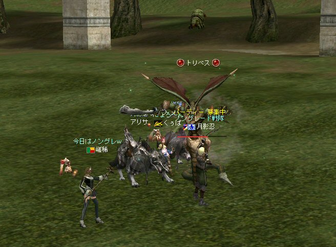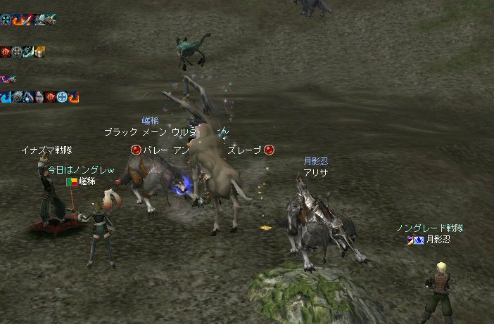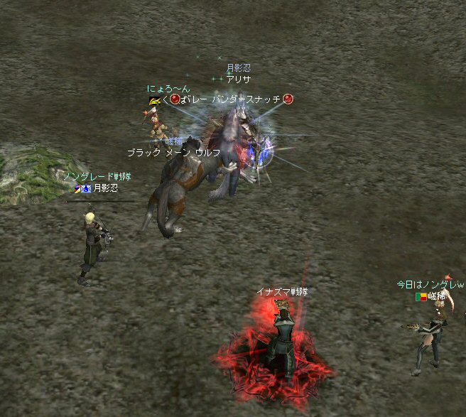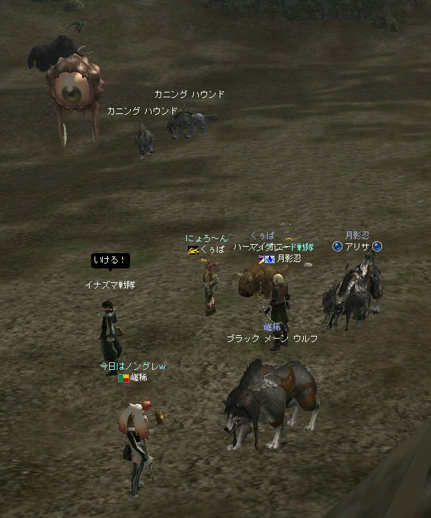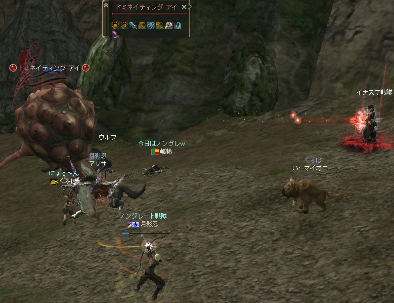 ノングレ戦隊は当初国立墓地で活動していたが、メンバーの増強と大狼の火力が加わった事で、狩場をアルゴスに変更したのであった。 ~ノングレで行こう!(2009/07/30)後編の開始~ 火力を確かめつつ前進する。行ける!倒せるぞ!! MPがあっという間に底を尽くことも無く、大狼達の火力のお蔭で、普通に狩りができるw サクサクと敵を倒し、あるいは敵を避けて(無駄に戦闘しない=w=;)移動し、 アルゴスの眼に到着。 ここはクエスト受けられるポイントではあるが、 クエストに必要なレベルを満たして居ないため、誰も受けられないw 要は、俺達のレベルで来て遊ぶ場所とは想定されていないと言う事だ。 定番の記念写真を撮り、軽くバフをして下山する。 下山途中で、ふと後を向くとPTメンバーが目玉に襲われているw 助けないとw 特に後衛職はバフ後でMPが少ない。 すかさずダブルショットを目玉に放ち、アリサを迎撃に向かせるw 硬い! タゲを剥がして、ローブ職から引き離さないと・・・w ん? なんかおまけがいる? 犬がこちらに向かってきた! こっちにもダブルショット!! 硬い!! くはwMP残量が少ないww 俺からみてもピンクの名前なので10レベル近く離れているモンスターだ。 スキルのダブルショットなら100%命中するが、普通のショットだと命中率が落ちる。 痛てえ!! 何だ!?この812のダメージって@w@ 全HPの1/4が削られるw くはw 一度は生命の秘薬で100%まで回復するが、それもすぐに削られるw 強力体力回復剤を連打するが間に合わないw で、1エンドw 生存していた嵯稀さんが復活を試みてくれる。 よし!復活!! 軽く自己バフをかけて再度戦闘に参戦! だが、MPが無いww アリサが死亡、このままではマズイ! PTで複数のモンスターを一度に相手にするのは不利だ。 とりあえず犬を一匹引いて逃げ切ろう! ある程度引けば、モンスターの帰巣本能で諦める可能性がある!! 敵の火力が分散すれば他のメンバーの生き残る可能性もあがる筈w 強力体力回復剤を飲みつつ移動する。 だが、多少PTからは離れた場所ではあったが、HPが尽きた。 逃げ切れなかった・・・。 くはw PT壊滅状態w 月影忍:きゃつらは? くぅぱ:わんこが やっつけたW 嵯稀さんが、大狼で敵を倒して生き延びる事に成功したようだ。 近くのPTメンバーをリザ復旧していく。 嵯稀:リダさんはどこでしょう?^^; ちょっと離れた場所だからなぁ、判りにくいか・・・ くぅぱ:放置で イナズマ戦隊:さぁ5分帰還だww ちょw 月影忍:しくしく;w; おーい;w; 何とか全員復活し、PTを立て直す。 ふむ・・・ ドミネイティング アイ (Lv.74)とカニング ハウンド(Lv.72) PTモンスターだったらしい・・・ まさか、PTモンスターがいるとは想定していなかった。 だが、壊滅状態にされたのは悔しい。決して倒せない敵では無いはずだ。 MPもなく、補助魔法も万全では無い中、足並みが乱れてしまっては半壊も当然の結果ではある。 だが、全滅はしていない。全滅していなければ、俺たちは負けた事にはならない! ならば、勝つ!! リベンジしよう。 目玉の足は決して速くは無い。 取り巻きの犬の方が足が速く、こちらが受ける物理ダメージが大きいように見える。 ならば、最初に危ない犬を倒して行くのがいいだろう。 一匹ずつ各個撃破して確実に相手の戦力を減らしていくんだ。 第1目標 犬(カニング ハウンド)各個撃破 第2目標 犬(カニング ハウンド)各個撃破 最終目標 目玉(ドミネイティング アイ)各個撃破 途中、嵯稀さんが倒れたが、PTモンスターは倒した。 戦死者を出したのは残念だ。 そこへ運良く知り合いのデイジさんが通りかかる。 デイジさんにリザ9をもらい嵯稀さん復活。 「仲間がやられているので」と言う事で、話もそこそこデイジさんは行ってしまった。 ありがとうデイジさん >w<;ノ さて、その後、俺たちはさらに奥へ進むことにした。 自分達でアクティブな虫達を倒し、 あるいは露払いしてくれる他のプレイヤーにの後を歩きつつ・・・ 「帝国墓地」到着。 最初に「国立墓地」を言い間違えた「帝国墓地」に本当に来てしまった。 ノングレードで行こう!では何度か来ている場所ではあるが、 来るのが初めての人が多いのでちょっと観光。 帝国墓地の過激な地下通路への入り口横にある、 小さな小部屋からノングレ帰還。 少人数ではあったけれど、PTモンスターとの対決は面白かった>w<ノ 参加してくれたみんな、ありがとう。 本日のノングレミッション終了w PR