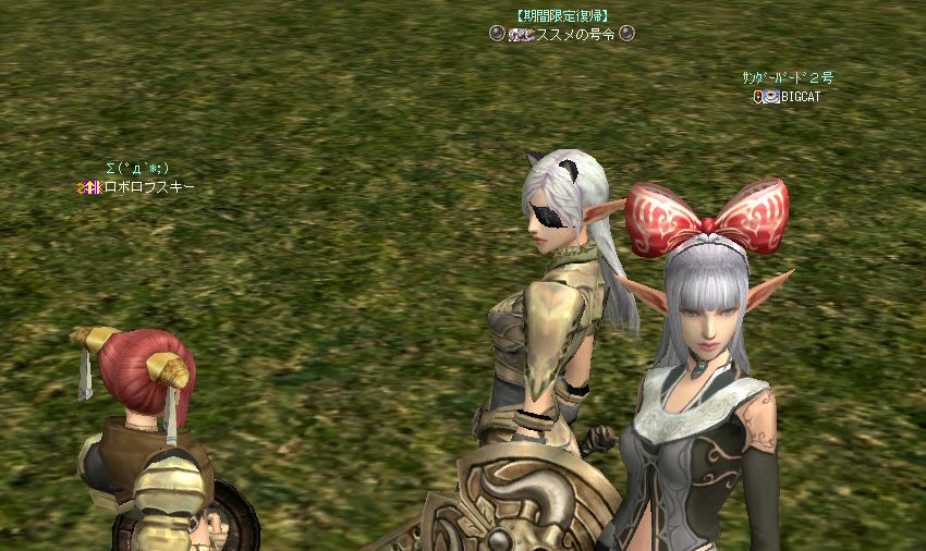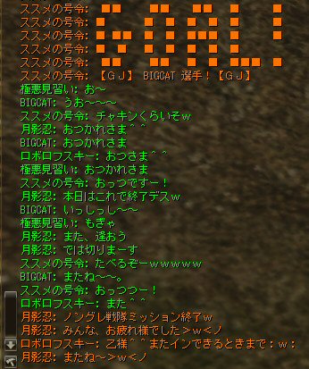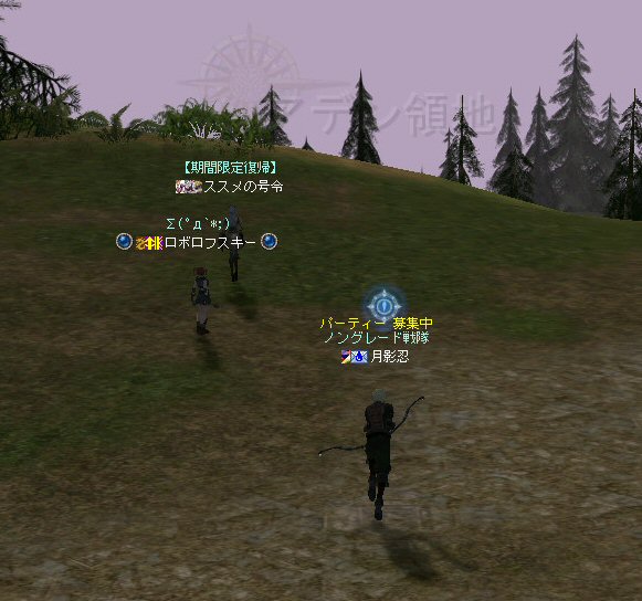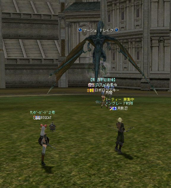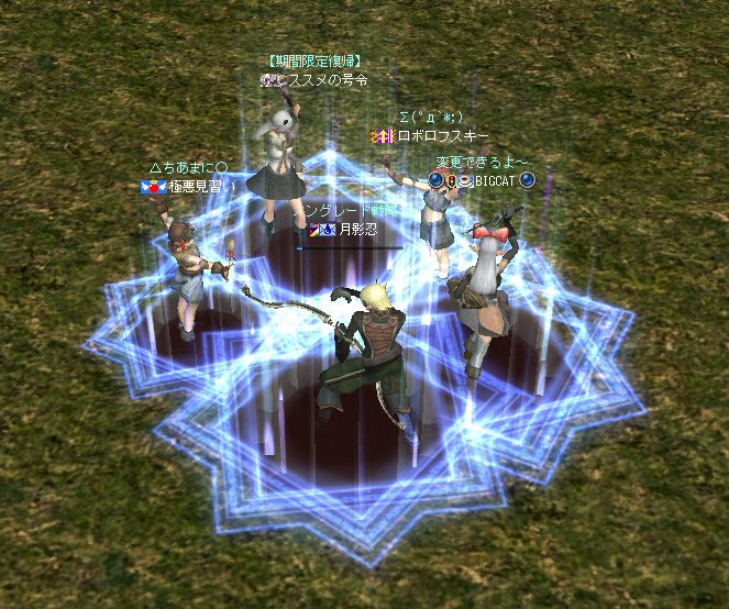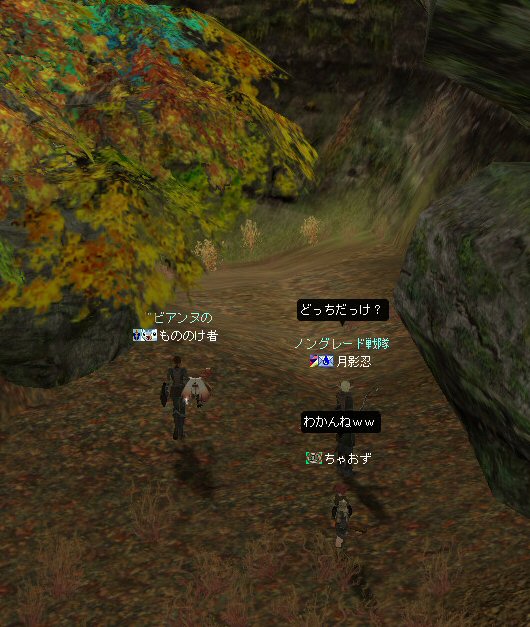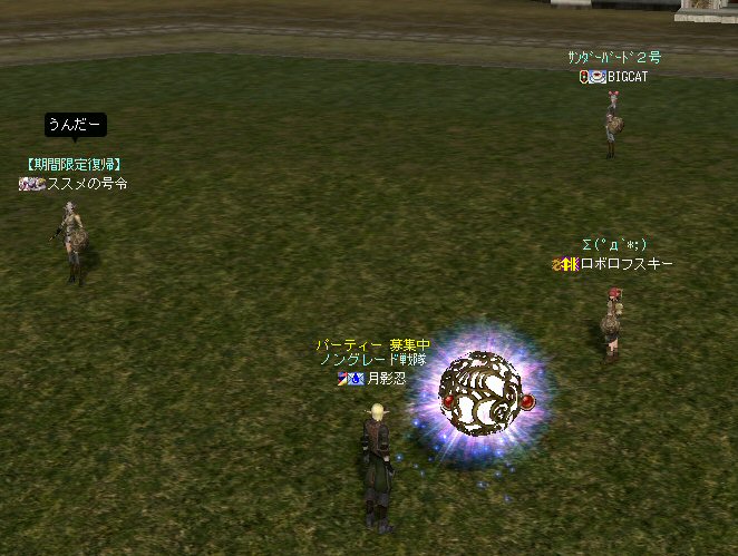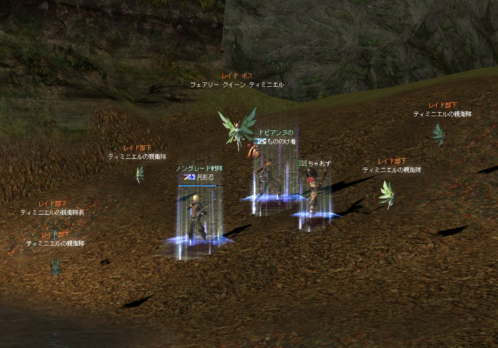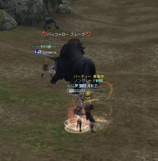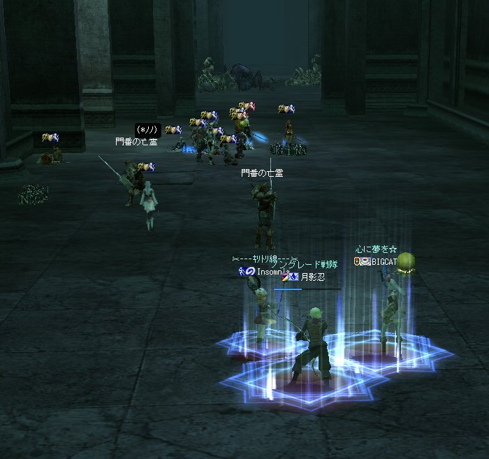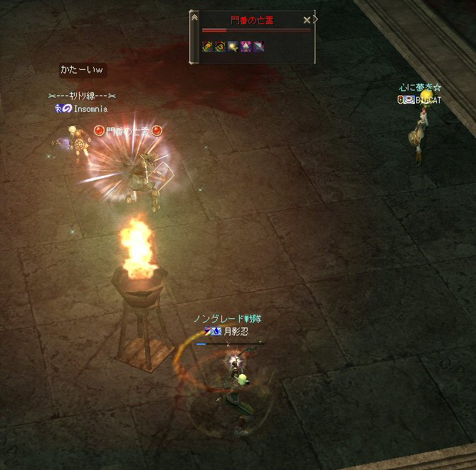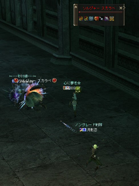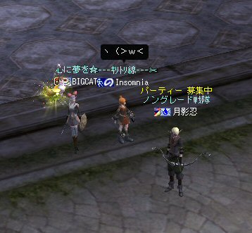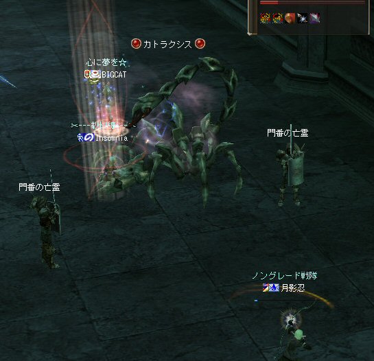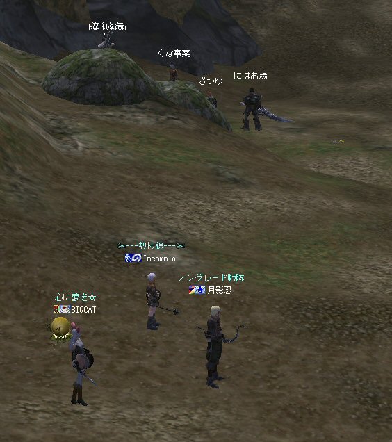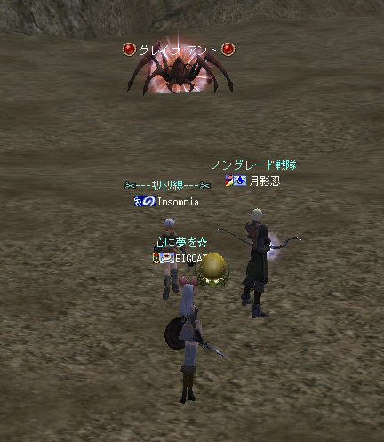 最近、ノングレ参加者減った気がする・・・ =w=; ってか、コアメンバーがめっきり参加しなくなった。 まあ、引退したり、休止したり、盟主やったり・・・それぞれに事情はあるのだろうが、 隊長としては、正直、寂しい限りだ =w=; それでも新しい出会いはある。 今回、Insomniaさんが初参加。 3名のPTとなった。レベル的には俺以外は70代。 まあ、怪獣島は無理かもしれないが、そこそこ危ない所にはいけるだろう。 3人で行けそうな冒険先・・・で選んだのが「帝国の墓地」 ゴダードからアルゴスを駆け抜けよう! 「帝国の墓地」3人で向かうと言うのは初めてかもしれない。 人数的に経験が無いのは不安要素。 なので火力を途中で試しながら前進だ。 多分、InsomniaさんのHPが高いのだろう。モンスターから打たれ強いのはありがたい。 おまけにスポイルも決まったりw 序盤、狩場が空いてるなぁと思っていたら、奥の方に居た! 怪しい集団。 動きをしばし観察してると、先頭のキャラクターだけ人が入っていそうな動き。 (本当にそうならNCJでBANできないかも =w=;) BOTにしては、時々立ち止まり、判断が入っているようにも見える。 おまけに、こちらが叩いているモンスターを横殴りして行きやがったw 腹が立つが、こいつらと遊びたい訳じゃない。 こいつらをPKするプレイヤーの気持ちはわかる=w= そして、ペナルティを負うリスクも馬鹿にならないだろう事も想像に難くない。 だが、 無駄な時間をこんな奴らの為に使うなど「ちょこっと課金」ではナンセンスだ。 先へ進もう。 途中の敵も、3人なら怖くない・・・ (時々HP半分以上飛ぶがw) 道に1度迷うが無事、22時30分に到着。(>w<)b 時間的にはまだ遊べる・・・と言うことで内部へ。 3人で門番の亡霊とか叩いて、倒せる事を確認。 だが、超硬い。 倒すまでにかなり時間がかかるし、MPの消費量も馬鹿にならない。 しかし、倒せる事が分かってしまうと興味が薄れるのはノングレ戦隊の性だろう。 次なる獲物と言えば・・・昆虫達? 思い起こせば(多分50代の頃?)フルPTでやっと倒したあの虫達。 一匹でMPがすっからかんになり、超危なかった記憶がある。 (当然、倒したけどな =w=;) それを3人で・・・? 思っちまったら仕方が無いw 最悪、リコよろしくw (だが、リコを期待してはいけない。なぜなら、最初に逝くのが・・・あsfghjkl) 現地に移動してみると入り口で、クラハンをしているらしい。 まあ、空いている時に分けてもらう事にする。 最初は、チャームでうまく引けた。 2度目、 「一匹(?)もらいまーす」とPTに白チャで伝え、快諾してもらった。 「お釣りが来たらどうしよう@w@;」 俺の不安をよそに、チャームは無視された。 PTの人に「ノリ気じゃないらしい。ムシだけに・・・ (マテ」 俺「無視されるのか・・・」 PTの人「どーもヘイト稼げてないっぽいね;;」 BIGCAT「さむさはひつようだ。」 PTの人「夏には必要ダ」 とか仕様も無い会話をしつつ一匹引く。 PT3人で、かつノングレード装備で倒せる事を確認した。 ミッション終了。帰還する・・・。 (PTの人が時々飛び入りする^^;) お疲れ様でした>w<b 3人であの虫を倒せるとはw、まさかの成果にうれしい月影でした。 やはりキャラクターレベルが大きく影響しているのだろうか。 ふむ、なんにしても楽しかった^^v またね^^ノシ