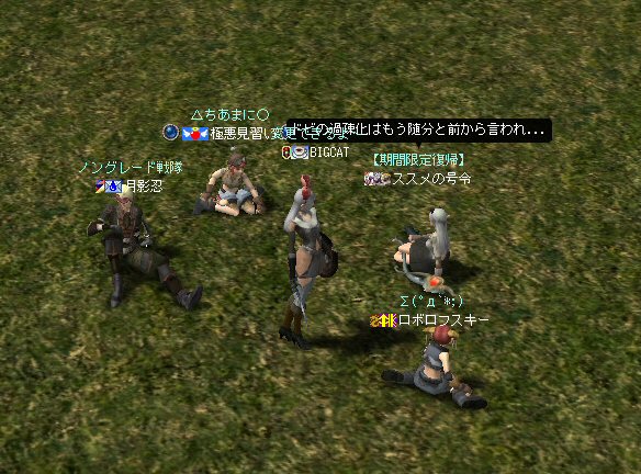 と製作側が思っているとしたら、浅いゲームになるだろう。 カンストすれば終わりだからだ。それはプレイヤーにも言える。 『ノングレードで行こう!』をやってて何が楽しいって、 集まった仲間との馬鹿話し(時々エロトークもあるかな?)は定番だw 一人でできない事でも、みんなでやると出来るってのも楽しみ方の一つ。 「石化レイド討伐作戦」も「傲慢の塔登頂作戦」や「DVC突入作戦」も、 シルレン一人じゃ絶対に無理だったろう。 ※「石化レイド討伐作戦」とは、 高レベル者が低レベルレイドボスを討伐したがらないように、 ペナルティが加わる仕様を利用した遊び方。当然ドロップなんか無いw 適正レベルよりも高レベルなプレイヤーがレイドを攻撃すると石化して行動できなくなる(2分間)。 だが、一撃だけなら加えられるのだ。 そんなキャラクターが多数居れば、継続してモンスターにダメージを与えられる。 そうやってレイドボスを討伐すると言うゲームだ。 ※「傲慢の塔登頂作戦」や「DVC突入作戦」とは、 普通ノングレード装備で行ける様な狩場じゃないと思われている場所へ行く、 ハラハラどきどきの生死をかけた冒険だ。 他にも、「アルゴスの壁」「太古の島(怪獣島と呼んでいる)」 「神託の島」「沈黙の修道院」「帝国の墓地」えとせとら・・・ 名だたる狩場に顔を出し、生き残りをかけてハラハラドキドキは、当然、通常装備でも味わえる楽しみ方だが、難易度は通常装備の比じゃない。 PTメンバー全員が協力しないと全滅する可能性が高くなる。 『死んだら負け』『全滅したら負け』が基本ルール。 「ノングレードで行こう!」は、それに『ノングレ装備』と言う縛りが加わっただけ。 その縛りだけでも、装備格差が無くなり、PTを干される事も無くなる。 俺の場合、ノングレソロの実験もしているからPTの有難さは身に染みている。 火力がどうとかよりも、人が居てくれるだけでうれしいものなのだ。 『仲間に助けられ、自分も仲間を助け、協力して困難を克服する』なんて贅沢な遊び方ではないか? もちろん経験値とかゲーム内通貨とか、収支が赤字になる事もよくあるが、 ここでの『面白い』は、少なくとも『レベル上げ』ではないし、『資産を増やす事』でもない。 それが低レベル層でも生かせればいいのだが、それが難しい・・・。