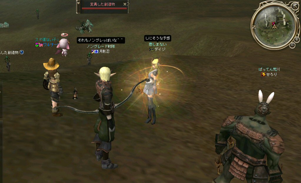 【情報】 ノングレードで行こう!エルフ村編 作成者:月影忍@ドビアンヌ ノングレード装備による実験は2006年6月1日から始まった。 私的な実験は、当時、アカウントハッキングやOE破産で引退するプレイヤーのアンチテーゼとして行ったものだ。装備が不遇だから、装備が無いからと言う理由でリネージュ2と言うゲームが出来なくなるゲームバランスなのか否か。24時間接続以外のプレイヤーを想定し、一日2時間以内のプレイを原則として実施した。 当然何も無い状態からのスタートで安易に装備が調う訳が無い。量産兵器とて無い時代。 極悪な環境かなと思ったけど、それは新鮮な体験でもあった。素手から始まり、徐々に装備を整え、一ヵ月後にはノングレード最強武器も手に入った。 そしてこの『ノングレードで行こう!』の原型である『ノングレード装備で逝ってみよう!』のイベントを開催したのが、2006年6月29日(木)の21:00・・・。始めてからもうすぐ3年になろうとしている(ま、詳しくはブログで=w=;)。 『リネージュ2』と言うゲームは、自由度が高いMMORPGである。 戦争やPVP,狩りやレイド討伐などゲーム製作側が想定した遊び方以外にも、プレイヤーのアイデア次第で遊び方が広がる環境だった。自分が『面白い』と感じるプレイって何なのだろうか?自問自答で色々試した歴史が『ノングレードで行こう!』の中にはある。 そして、仕様が変わるたびにノングレードで熱くなった遊び方が次々の消えていった・・・。量産兵器の出現で、一番安価だったノングレード装備も高額装備になっちまった・・・。レベル差で経験値が入らない仕様、引けなくなったNPC・・・リネージュ2の製作側は、決してノングレード戦士には優しくない。 はぁ・・・(あ、幸せが逃げちまうw) そうだな・・・戦うばかりが遊びじゃない。たまにはマッタリしてみよう・・・初期村あたりでw。 (いつもマッタリか@w@?)。 趣旨:血盟、種族、職種、レベル、装備等々の枠を超えて、ともに冒険を楽しむw 日時:本日21:30~23:30位の予定 場所:エルフ村GK前 冒険先:エルフ村のお散歩(変更になる場合があります)。 お約束:最後はみんなノングレード帰還(5分帰還 /escape の事) PR