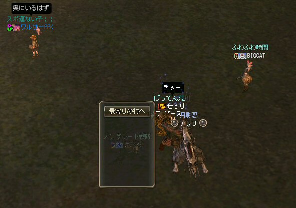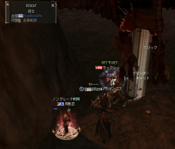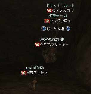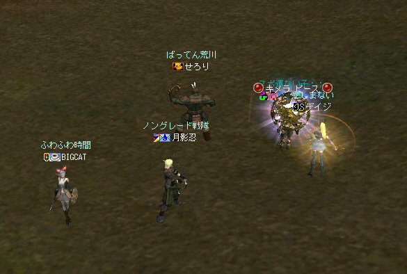 ちょこっと課金は従量制課金方式。接続した時間で料金が決まる。 あまりのんびりもしていられないので、22:34にSVへ移動した。 アップしてから初めて来た。随分今までとは様子が違う。 新鮮だとは思う。 モンスターの名前の色から当然俺のレベルより高いモンスターだと言う事はわかる。 だが、その強さはどの程度の物か?それ調べるには、実測するに限る。 タゲってみんなで叩く。倒せる!うん普通に倒せる。普通の超真っ赤に比べたら楽な物だ。 だが・・・あれ?急に動かなくなった???? チャット入力してみるが、チャットのリストに反映されない・・・ え@w@; まさか・・・・ 聞いてみたが、チャットに入力した言葉が反映される事は無かった。やばいw PC側(クライアント)で不具合か、さもなければサーバ側の問題か・・・。 何れにしても、とりあえずゲーム終了だw ゲームを再起動しよう。 え@w@; ちょっと待てw 何だその文言はwww まだ、俺はそちらの世界に居るのか@w@; 『すでに使用中』って、すでに終了してるぞ@w@; アセアセ;; まさか、誰かにハッキング!? (冗談ではなく、マジでありえる話しだからね。) 何度もリトライしてやっとINしてみると、死亡直前までHPが削られていた。 サーバが落ちたらしい。みんなそれぞれに被害に遭っている。 デイジさんに至っては死亡状態。もちろん、プレイヤー側の手違いで死亡した訳じゃないのでGMコールしているとの事。レベル80台周辺での経験値損失は、かなり大きい。それこそ、『長時間プレイして来た時間と労力が無駄になる』事を意味している。祝復活スクロールを使うのも手ではあるが、それとてゲーム通貨1M以上する高価な代物だ。サービス提供側が原因の事故で、自分のゲーム資産を使うのも馬鹿らしい話し。なので、『GM粘着で復活作戦』との事。 生存しているメンバーで続ける事にしよう。 ・・・と、新たな参加者がw 杉薫氏、ドビ鯖でも古株のキャラクターだ。 姉貴は何度かレイドでお世話になっているはずだ。 BIGCATさんの同盟主との事^^; 見習いナイトソード+見習いセットに身を包んだ偽ナイトw(裸になった時点ですでにグラだがw) ま、忙しい中、顔を出しただけっぽいが、一緒にちょこっとノングレを堪能して行った。 慣れる慣れないは別にして、魔法系攻撃もあり、ノングレード戦隊では危険度が高い狩場である事が徐々に判って来る。俺に至っては3000くらいダメージを食らう事があるので2撃来たらアウトだ。だが、それも運次第。 流石に、即死レベルのダメージを食らったら、回避も糞も無い。 生き残るスキル以前の問題だ =w=; それでも、仲間のリザで随分経験値的には助かっている。 まあ、今のゲームの仕様なら、俺のレベルの経験値復旧はそれほど手間はかからないだろう。 最後のノングレ帰還の場所だが・・・デイジさんはAFK(離席中)らしい。 今回はノングレ史上初の体験が多かった。 ノングレ史上初、主催の遅刻w ノングレ史上初、ゲーム中の鯖落ちww ノングレ史上初、『死亡した英雄』を取り巻いてのノングレード帰還www なにか、嬉しくない『ノングレ史上初』ばかりになってしまったw(;´Д`) 参加してくれた皆さん。ありがとう^o^ そしてお疲れ様でした ^ー^ノ