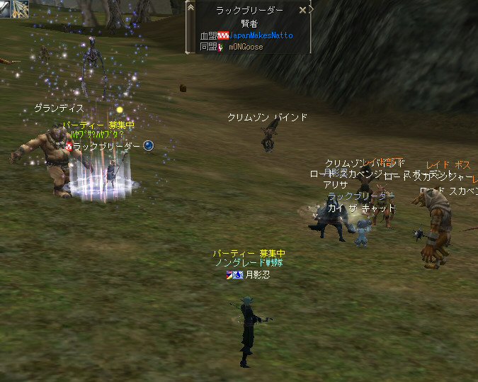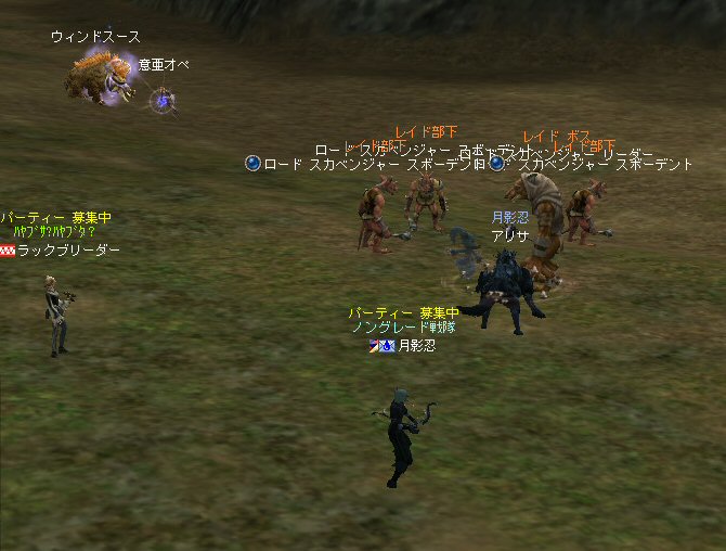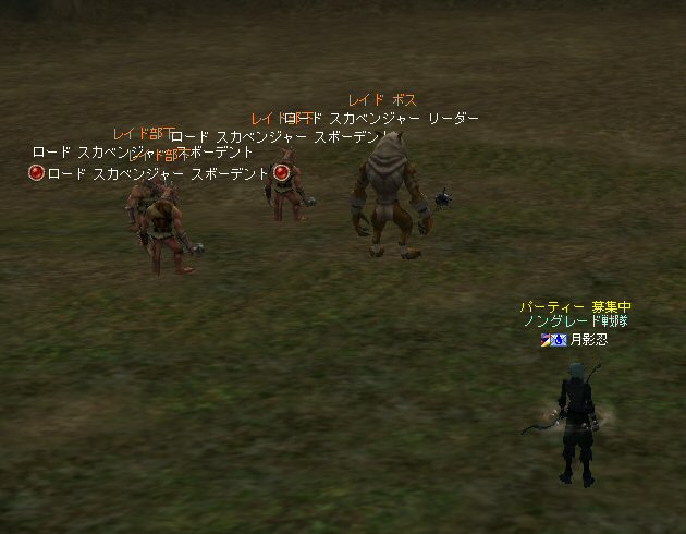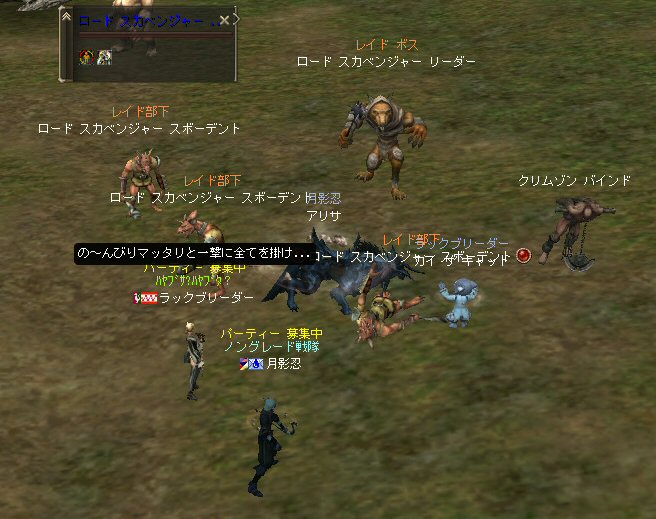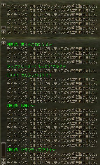 21:20頃INしてギランに移動した。 今日もちょこっと課金だ。 ダラダラとした遊びは出来んなw といいつつ・・・ 「ノングレ石化レイド討伐作戦」w たまに、変な遊びがしたくなる。 なぜか今日は、我慢できなかった;w; マンネリが嫌なのだ。ちょっと変わった事がしたい。 最初、猫(キャット団)がいるか見に行ったが、留守だった。 で、ギラン近間でレイドと言えばこいつ。 『ロード スカベンジャー リーダー』 今まで石化レイド討伐作戦で成功したレイドのレベルは26。 こいつは40だ。 どう考えても、ソロでは討伐は不可能だ。 試しに、リーダーに一撃を食らわせてみたが、HPに変化が見られない。 つまり、ほとんどダメージが与えられていない状態だ。 ダブルショットで1075とか1024のダメージ与えている。 だがw 全然減って見えない。それこそ、0.1mmも減ってない。動いた気配すらない。 フム =w=; そこへ、通常のレイド討伐隊がwww スマンw 高レベルの俺がダメージを与えてしまった以上、ドロップは無いww (確か、そんな仕様だったと記憶している。レベル差がありすぎると、ドロップが無い筈w) レイド討伐を楽しみにしていた、みんな、悪いがアウトだ;w; そして、もう一言付け加えるなら、ノングレ戦隊での討伐は無理かもしれない・・・。 静かに立ち去る彼らを瀬に、石化しつつ討伐?を続ける俺であった・・・ (心の中では、「ごめんよぉ~~~~~~>w<;」と叫んでいたw) ま、それは置いておいて、近くをBOTと思われるドワキャラが、黙々と狩りをしている。 ちょいとウザイ。 ここ最近、BOTについての不満のスレが随分公式で立っているが、こんなレベル帯にまでBOTがいるのか・・・;; 初心者プレイヤーが狩れる場所が無くなってるのと違うか? 今回参加のラックブリーダーさん到着。 火力を上げるためにRW(ライディングウルフ)も投入したのだが、 アクティブモンスターに襲われた。 BOTだけじゃなく、アクティブモンスターも結構ウザイw 70超えてるウルフだから、雑魚モンスターの攻撃など当たらない。 おかげでチャット画面が超ウザイ事にwwww 石化レイド討伐に関してだが、やはり40モンスターは無理だ。 俺と、ラックブリーダーさんのペアでかつ、RWと召喚猫で、 取り巻きの『ロードスカベンジャースボーデント』は倒せた。 ログを見ると、俺のダメージが2600位。ウルフも2000位のダメージを与えている。 ノングレペアだと、このあたりが限界だろう。 1000人、いや、せめて100人もノングレ戦隊がいれば楽勝だろうけどな。 と、言う訳で、『ロード スカベンジャー リーダー』は、今だ狩れず・・・。 前半のミッションは終了だw つづく・・・