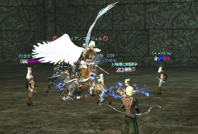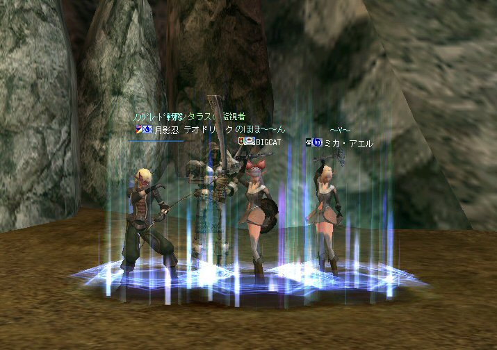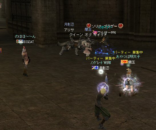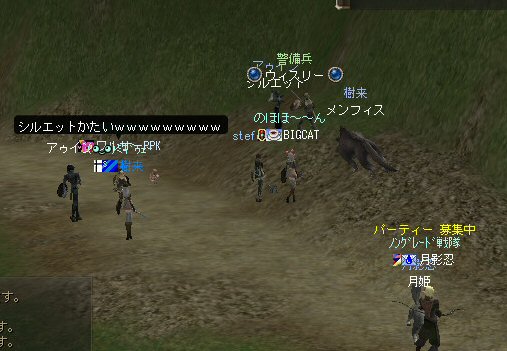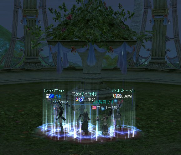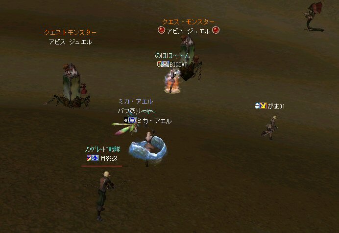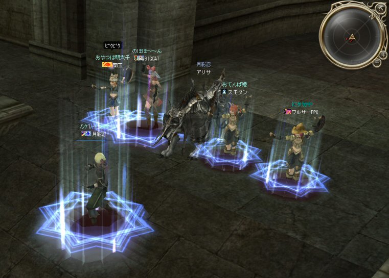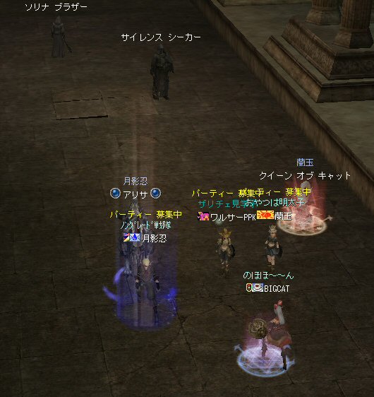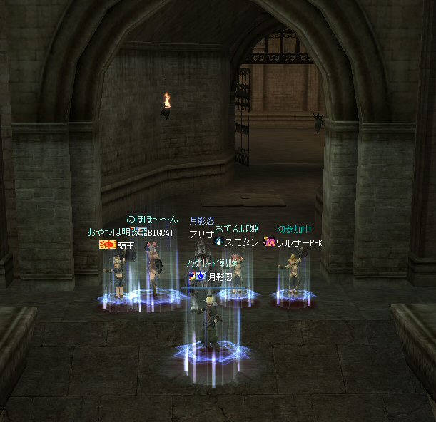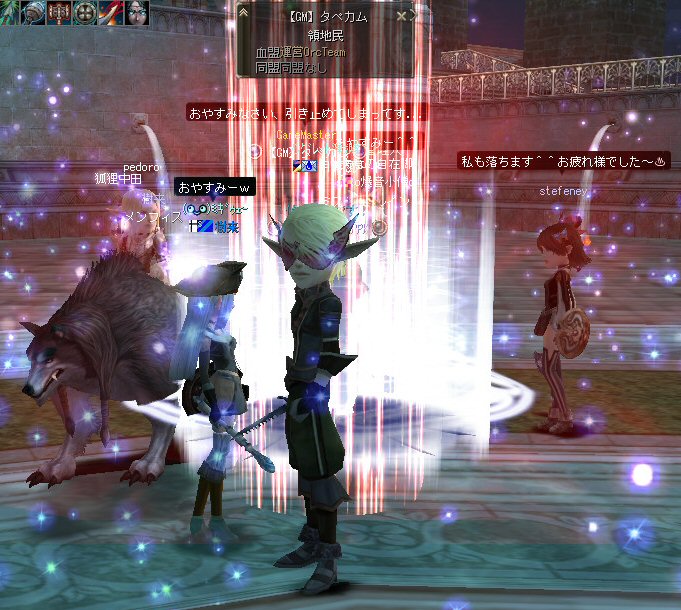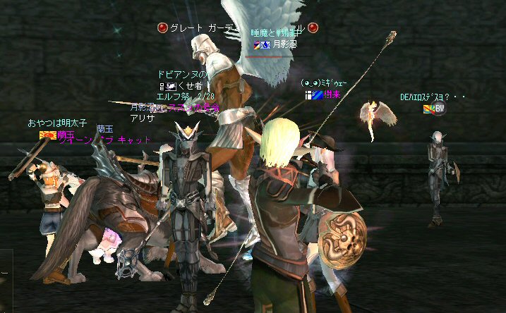 21時近くでインしようとしたら、分割アップデートが始まり、 結局ぎりぎりになってしまった。 告知は21:30集合と言う事で書き込みをしているから、 俺が遅れたら洒落にならんw で、アンタラスクエを受ける。 集まったメンバーにも寄るが、あまり開始が遅いと12:00を回ってしまう。 「日時:本日21:30~23:30位の予定」としているので、 出来るなら23:30頃には終了させたい。 進行が遅れるようなら前半で終了と言う事もありえるかな。 理想を言えば、21:30の状態で参加メンバーが集まり、すぐにスタートできれば、 恐らくは、余裕をもって終了できるはず。 たしか、1時間30分~2時間くらいのクエストだ。 だが、21:30分で人が集まっている事など少ない・・・ ここが、ローカルなイベント故の悲しさだろうか・・・ 人数が少なければ、クエストの進行も困難さが伴うだろう・・・ 「最悪一人か・・・」と思うのは、いつもの事ではある。 (もちろん一人でだってやるさ。自分で蒔いた種だし) でも、不思議な事に、少人数でも参加してくれる人がいる。 本当に、いつもありがたいと思う。 もし、誰一人、集まらなかったとしたら、このイベントと言うか、 サークル活動の意味が無くなったと言う事なのだろう。 その時は・・・まあ、そのとき考えるか。(覚悟はしてるがw) 年度末だし、正式隊員の中でも忙しい人もいるだろう・・・。 だが、あまりのんびりも出来ない。 参加者全員が、常時接続で、時間に余裕のある人とは限らないからだ。 以前やった「ちょこっと課金」やった人ならわかるはず。 1時間100カイモ(100円)。それはリアルで消費される現金だ。 一応、ギリギリの22:00頃まで待って出発する事にする。 シルレンの俺以下、 タイタン デュエリスト ウォーロック アタッカーばかりでヒーラーが居ないPTw だが、工夫次第で何とかなるだろ。 ある意味、そう言う所が「ノングレードで行こう!」の魅力のひとつだと思う。 参加者にNPCのガブリエルからクエを受けるよう促し、 22時を回った所でクエスト開始だ。 クエスト進行で足並みがばらつくのを避けるため、PTMは閉じた。 大まかな予定は、 ・アデンのシーレンにてサチコから出現するクエストモンスター「供物の霊魂」を倒す。 ・忘却の平原に行きマーシュ ストーカーとマーシュ ドレイクを倒す。 ・巨人たちの洞窟に行きクランロットとハムルートを倒す。 ・猟師村から鏡の森へ移動し、ハリツ リザードマン オーバーロードか シャーマンから出現するクエストモンスター「ハリツ リザードマン狂信者」を倒す。 クエストアイテムを入手後、 猟師村のNPC>象牙の塔のNPC>アデンのNPC(2箇所)と話をして、 アイテム「守護者の証」を手に入れてギランのガブリエルに話をする所までが前半だ。 順調にクエストをこなしていく中、 猟師村あたりに差し掛かった22時30分頃だったと思うが、2名参加者が増える。 隊員のミカ・アエルさん(魔法使い)とBIGCATさん(ヒーラー)だ。 時間的に後戻りはできないので、このままクエなしで行くしかないかなと思っていたら、 蘭玉(ウォーロック)さんが、サポートに向かうと言う。 こちらは、先に進んでと言う話なので、先行部隊としてクエを進行する事にする。 (正式隊員のススメさんも20分頃にINしていた事を、SS整理してて気がついた;; WISくれればよかったのにww) 火力的には多少不安はあるものの、 魔法職とヒーラーと召還職の3人居れば、クエストは進行できるだろう。 後半の進行は、 ・オーレンの胞子の海近くのアビスジェルと取り巻きを倒してアイテムを取得、 鍛冶屋に話をしてアイテム「守護者の証」を手に入れる。 ・グルーディン村の風の丘近くのアビスジェルと取り巻きを倒してアイテムを取得、 倉庫番長に話をしてアイテム「守護者の証」を手に入れる。 ・ギランのガブリエルに話す。 ・DV入り口のNPCに話す。 ・DVCでケイブ キーパーかケイブ メイドンを倒し、最後のアビスジェルを出現させる。 アビスジェルを攻撃し、倒すんだが、取り巻きが出現して、結構面倒w 火力が弱いと、倒す事が出来無い事がある(数年前のブログに記述したはずw)。 ・入手したアイテム「ジュエルの破片」をDVC入り口の監視者NPCに渡すと、 「ポータルストーン」が入手できる。 23時32分頃、無事、先行組のミッション終了。 予定していた時間だ。 何も無ければ、20分ほどで後発部隊も到着するだろう。 最後のアビスジェルは手強いので、サポートは必要だな・・・などと考えつつ、 周辺の薄青いモンスターを倒して待っていた。。。 後発組は、アビスジェル(風の丘)にてクエの進行中・・・。 だが、そこで悲劇は起こった。 ミカ・アエルさんとBIGCATさんが死亡(戦闘不能)状態に@w@; アビスジェル周辺に湧く大量の取り巻きに絡まれたらしいw 救援にいかねばw (実は手持ちアデナが50Kを切っているんだが;w;) ノーマルスクでPTの態勢を立て直し、クエストのリトライ。 後発組はアイテムを入手した。 もう、12:00近い。 仕事を持ってる人は、そろそ