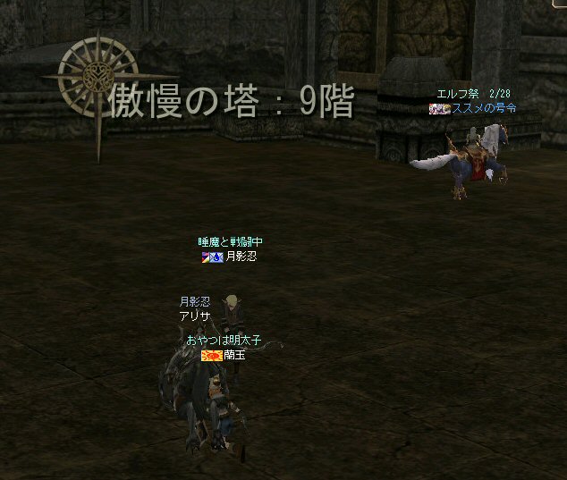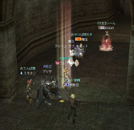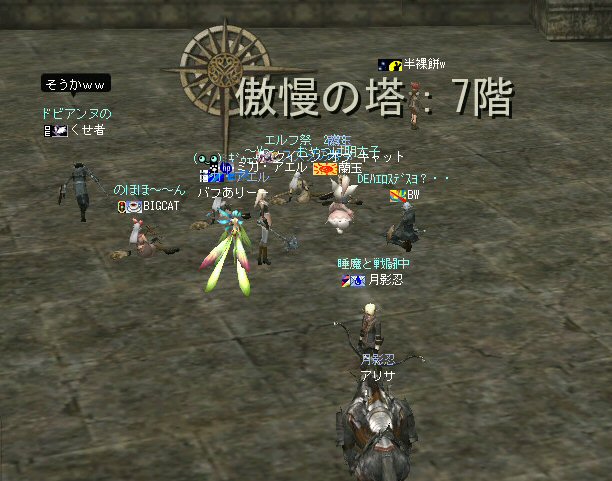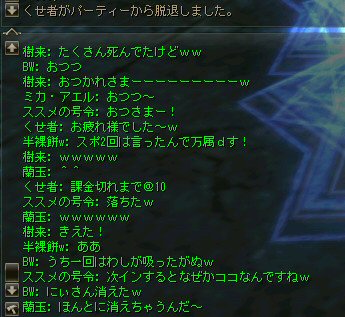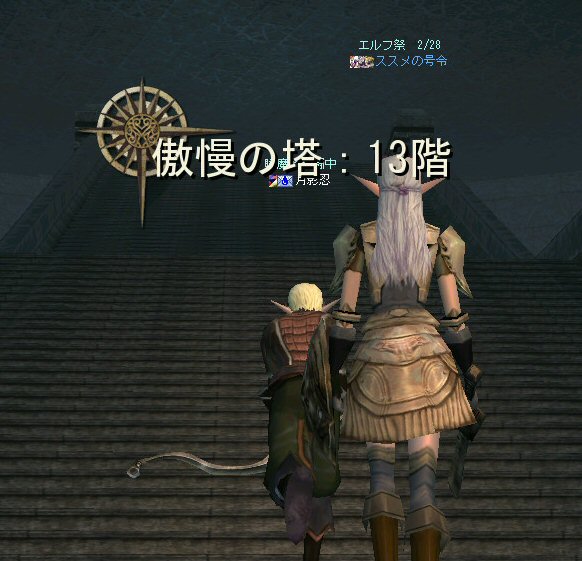 以前、登頂に成功した傲慢の塔への再挑戦だ。 業者の塔としても有名ではあるが、今回行った時にはBOT連中は影を潜めていた。 もっとも、彼らと戯れている時間など無い! 2度目の登頂を狙う! 以前、ブログにコメントしてくれたくせ者さんが参加w (メインが他鯖は半裸餅wさんらしいw ^^;) そして今回は、若干26才のスカベンジャー、半裸餅wさんも参加w (一応縛りで40以上と書いてはあるんだが・・・ゆるいのがノングレクオリティ^^;) 死んでも知らねーぞw って言ってる先から・・・ orz まあ、覚悟の上での参加だろうし、 20代で傲慢の塔に登ろうと言う心意気が素晴らしい! 将来、ノングレード戦隊の主力をになってもらいたい物だwww 半裸餅wさんが今回、火力として戦力になったかは疑問だが、 HPが二桁で助かったり、スポイルが入ったり、 ネタ提供には事欠かなかった事(ネタ戦力?)は確かだw (実際、楽しかったし^^) モンスターを倒して行く所に、今回、特記事項は無い。 PTであろうと、リンクしようと、少ないMPをうまく回して、その階その階をじりじりと攻略し、登って行った感じ。 「安定PT、時々危険あり」 スリルと会話を楽しむには最高のPTだったかもしれないw 以前は2PTで、5階を通り抜けられず、全滅した事もあったのに・・・。 すでに7階。下はかすんで見えない。 8階も通過・・・ 時々、ピンク戦隊になるのは愛嬌だ。 リチャしててタゲを切り替えをミスる事は、ヒーラーなら誰でも経験しているだろう。 眠らされた時に味方に殴られて起きる事もあったしw で、レイドボスの牛がいる階になんとか到着した。 さて、ここからがまた大変。 最後の最大の難関と言ってもいい。 ここを乗り切る(走り抜ける)にはどうしたらいいのだろうか? ススメさんに妙案があるらしい。 以下、ススメさんからの攻略作戦の説明。 ススメの号令: 作戦の説明: 私先頭でmobひきまくって走るので 全mob無視して頂上目指します 支援一切不要、mobのタゲがはがれるまで逃げます。 以上。 要はDVCでの作戦をもう一度行って見たいとの事。 で、タイミングを計って、作戦開始。 ラグ死は勘弁なのでスクリーンショットは無いが、 意外と早くススメさんが逝ったw ・・・ってか早すぎw orz (3K、1Kと連続でダメージを食らったらしいwww) それでも走り出した足は止まらないし、止められないw 先行した人達がモンスターを引きつれ、あるいは召還獣がタゲを取って道を開く。 通路を抜けて、追ってくるモンスターも、 外周の通路にある上の階へ上がる坂道にさしかかるあたりで引き上げる。 以前の仕様変更で、ダンジョンなどのアクティブモンスターは、元の場所へ戻る時間が早くなった。 つまり、逃げているうちにタゲを外して帰ってしまうのだ。 (言い方を変えるなら、槍PTでモンスターを引く事が難しくなった=w=) 現状を見ると、とりあえず、俺は生存。 だが、PTは半壊状態だったw 蘭玉さんが傍で逝ってたのでノーマル復活スクロールで復活。 他の場所でも生き残ったメンバーが死亡メンバーを蘇生している。 くせ者さんの課金切れの時間があと10分ほどとの連絡が・・・急がねばw なんとか無事?全員集合する事が出来、上の階を目指す。 途中の敵も、キツイけど何とかなる。 天使のレイドモンスターは、どこかの集団にでも食われたのだろう。 いなかった・・・。 で・・・登頂成功!! 傲慢の塔2度目の登頂を祝してノングレード帰還だ!! そしてくせ者さんの課金切れw 容赦ない運営の接続遮断によりPT離脱(ちょいと残念^^;) また、機会があったら参加してチョ^^v まあ、なんにしてもミッション完遂できて良かった。 そして、こんな楽しい時間を一緒に仲間(参加者全員)と過ごせた事をうれしく思う。 参加した皆さん、お疲れ様でした^^ノ また、冒険しよう! |