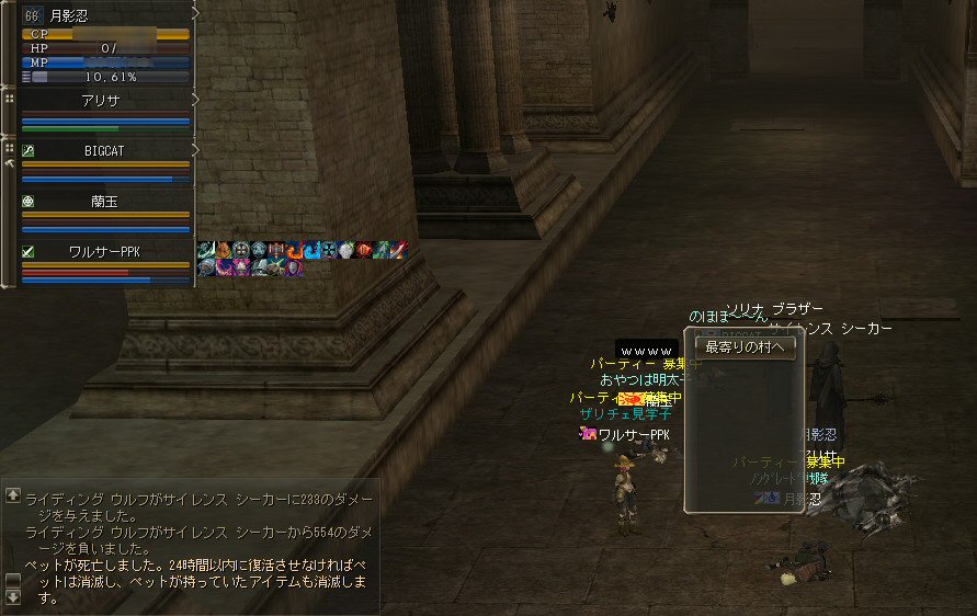 ----------------------------------------------------------------- 【情報】 ノングレードで行こう!沈黙の修道院全滅作戦 (マテ 前回は、傲慢の塔最上階への2度目の登頂に成功した。 26で傲慢の塔の作戦に参加するツワモノもいたしw いや、楽しかった^^ で、今回だが、たまには修道院にも行ってみようか あ、全滅作戦ってのは冗談ね。 まあ、洒落にならない場所ではあるが・・・ =w=; 今日は、どの辺まで行けるだろうか・・・ あの部屋は、やっぱり無理かなぁ・・・ そうそう、全滅する予定はないけど、可能性はあるからよろしく・w・ ----------------------------------------------------------------- 一応、『ミッション:沈黙の修道院潜入作戦!』と詳細に部分に書いてはいたのだが、 みんな、タイトルの修道院全滅でビビッたのか人が集まらない・・・ 先週の大盛況は夢の彼方へ・・・ =w=; 集まったのは、命知らずな冒険者 ・俺、月影忍 ・BIGCATさん ・蘭玉さん ・ワルサーPPKさん 以上、4名 正直、厳しい戦いになるだろう・・・。 猫とアリサの火力に頼るしか無さそうだ。 魔法クリティカルは怖いが、単品なら倒せる。 しかし、傲慢以上に硬そうだ。 (PTが先週の半分なので、当然火力も半分か・・・) 慎重に倒していけば、いけるだろう・・・。 だが、倒した後、すぐにモンスターは出現してくれない。 しばらくかかる・・・ そして、出現と同時に攻撃を開始すると、すぐ隣に2体目が出現・・・ こ、これは・・・ モンスターが硬いと言ったが、硬いだけなら時間をかければHPを削り倒す事は出来る。 だが、時間がかかるのだ・・・ 隣に湧いたモンスターも火力はとても高い。 モタモタしていたら、数発でこちらがやられてしまう。 とにかく各個撃破しか手が無いので全力で一方を倒しにかかるのだが・・・ ヒーラーが片方を眠らせようとするが、結構、かかりにくい・・・ 機転を利かせ、ワルサーPPKさんが、FD(フェイクデス:死んだフリ)で難を逃れる。 全滅は何とか回避できたが・・・壊滅状態w ノーマルの復活スクロールで態勢を整える。 そしてススメさんがゲームにINしてきた。 「助かったかも。。。」と内心喜んだのも束の間。 PTに誘ったまでは良かったが、あまり乗り気じゃない様子。 PTマッチの募集で「参加者募集チュ❤」が気持ち悪いとかなんとか・・・ @w@ いつものことじゃないかw 今日に限って何故!? そして・・・ ちょっと風呂へ行ってくると離席し、帰ってくる事は無かった。 OTL orz ・・・ 近くでプレイしていた他のPTにリザしてもらい、 再度態勢を立て直すも・・・火力不足(もしくはデバッファー不足)で、 何度倒れたろう・・・2枚あった傷スクロールはすでに消費し尽し、 呪われた傷を引きずっての戦闘が続く。 23:00も回った頃、参加希望者からWISが来た。 39歳のドワ、スタモンさんw 現地に来て戦闘に参加してすぐに逝ってしまったw orz 想定内とは言え、自分の年の倍のレベルの敵と戦うんだから、生き残る方が大変なんだが(^-^A;) それでも心意気は○だ。 機会があれば、また参加して欲しいところだ(レベルを上げてからw)。 それにしても、ノングレ史上これほど死んだのは初めてだ。 5回以上逝ってるだろう・・・。 ある意味、ノングレの伝説となるなw まあ、何にせよ、キツイミッションだった事は確かだ。 付き合ってくれたみんなに感謝する。 ありがとう^^ ではまた^^ノ