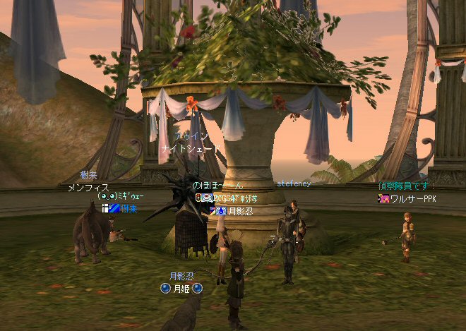今日は、遠足予定。 22時に出発。アデンを南下する。 鏡の森を抜けて猟師村へ。 猟師村出入り口にて・・・ ウィスリーさんをサクっとNPK(ノングレ用語:NPCをPKする行為)。 警備員さんとの戦闘は、ノングレ定番だ。 どこまでも警備員さんを引けた時代は、共にアデンの果てまで遠足したものだ・・・(遠い目・・・ リザードブレインを横切り、ギランに向かう途中の出来事。 アリサが22歳に>w<b ギラン横断の図。叫びで「通りまーす」とギラン露店業の人にw クロコダイルの島から見た「サンダーバード秘密基地」 今にもサンダーバード2号が発進しそうだw (公式では、神託の島とも言うらしい・・・) 島に渡る。 向こうに見えるのは、サンダーバード3号機の発射台に違いない。 (公式では、水晶の神託所と言う所かも知れない・・・) 秘密基地であるがゆえに、警備も万全だ。 最新の科学を使ったバイオテクノロジーを使用し、 新しく造った生物(モンスター)を警備員として使用している。 その警備の隙を突いて、山やら谷やら移動していたんだが、 ノングレ隊員の一人が引っ掛っかかって追われる羽目にw 島を渡った場所のモンスターは3名以上でPTを組んで攻撃した場合、 分裂する事は確認している。 しかし、ここは奥地。 根拠は無いが、この青色のスライムモンスターは分裂しないだろう。 追われているワルサーPPKさんを助けるべくダブルショットを放つ! そして惨劇がw 分裂するやん!! 壊滅状態に近い中、樹来さんが生き残る。 流石!古参のノングレード戦士w アゥインさんがボタンを押し間違えて一人村に最寄るも、すぐに走って現地へ戻る。 その間、樹来さんのリザでPTを立て直す。 このあたりのモンスターも分裂するのか・・・侮れんなw 頭の辺り光ってるモンスターもいるしw なかなか独創的なモンスター達だ。 発光ダイオードでも仕組んであるんだろうか? それとも蛍や発光する生物の遺伝子を組み込んだバイオテクノロジーなのだろうか? 科学の最先端技術を使った何かなのだろう。 これらの技術が世界に広まると大変なことになるに違いないw だから秘密基地なのだ。 人間の警備員がいたとしても、きっとその秘密は教えてはくれないのだろうな・・・ そして目的地。 ノングレード戦隊の結婚式場あsdrfちゅじ・・・ いや、秘密のアジトだ。 秘密なのでノングレ戦隊もめったに来ない。 (と言うか、今回初めてだ@w@;) 一般公開もしているが(秘密なのか!?)人はめったに来ない。 隠れた観光名所である。 ミッション完了!!暴走ワルサーPPKさんの花火乱舞w いや、美しいwwww しばし、みんなでマッタリする。 リネージュではない、リアルでの話し・・・。 昔あった、空き地や公園、ちょっとした森、坂道、近所の友人達と走り回った場所の数々・・・。 テレビゲームなんて、まだ存在していなかった時代。 学校の登下校も友人達と一緒だったり、一人で登下校も珍しくなかった。 だから道草もいっぱい食べた(いっぱい寄り道しながら帰ったという意味ね)。 遊びだって、みんなで集まってから「何しようか?」相談してた。 自分達で遊びを考え、ルールを作り、それを守って遊んでた。 日が暮れるまで走り回って・・・遊んでた。 クダラナイ話に花を咲かせてわいわい話してた。 そのときは、それが当たり前の世界だった・・・。 時と共に、空き地は駐車場やら住宅やらが建ち並び、森の木は切られ、 砂利道は舗装され、近所の友人達もいまはどこで何をしているかすらわからない。 10年も経てば、そこは見知らぬ町に変容していたりする。 ふるさとを離れ、他の地に住み、たまに戻ってもあの頃の風景はどこにも無い。 町内の子供達がカン蹴りや鬼ごっこをする姿も見られなくなった・・・。 学校の登下校も集団で行われるようになり、道草している子も見かけない。 もちろん、子供の時代が良い事ばかりと言う訳ではないんだが・・・。 ただ、ノングレードで行こう!で行動を共にした仲間といると、 そんな、子供の頃の感覚がよみがえる気がする。 出逢った友人達と共に過ごすこの時間が愛おしいと思う。 恒例の5分帰還で本日のミッション終了。 みなさん、お疲れ様でした。またね^^ノ 追伸:PT解散と同時に、GMが出現www ノングレード戦隊の行動が見られていたらしい・・・^^; 「ノングレードで行こう!」と言うローカルイベントは、GMも知っていたらしい。 サーバ内のユーザーイベントの応援をしてくれているとの事。 挨拶程度ではあったが、GMと少しでも話が出来たのはうれしかった。 本当なら、 ゲームの仕様について改善要望とかも直に聞いてもらえると更に良かったんだが・・・ 空気読むとそんな雰囲気じゃなかったもんね^^;