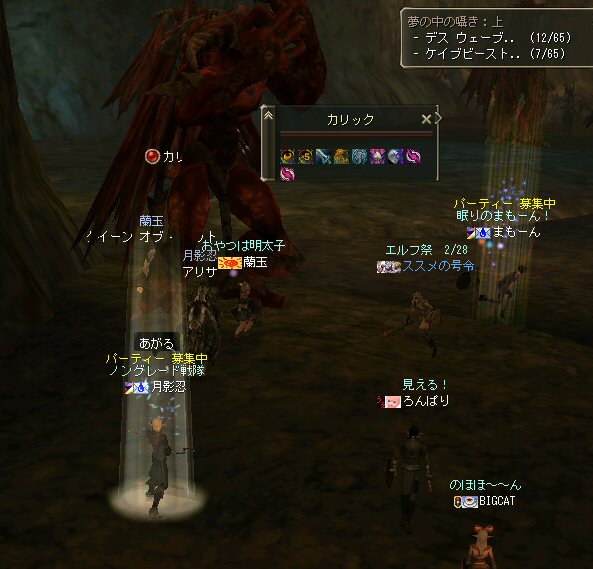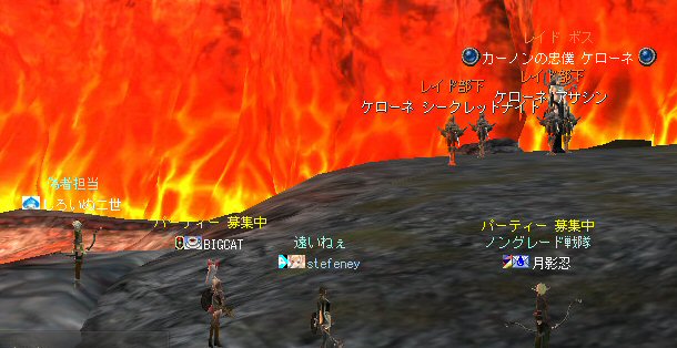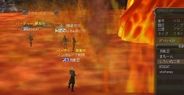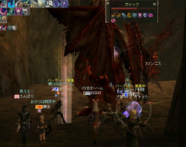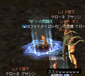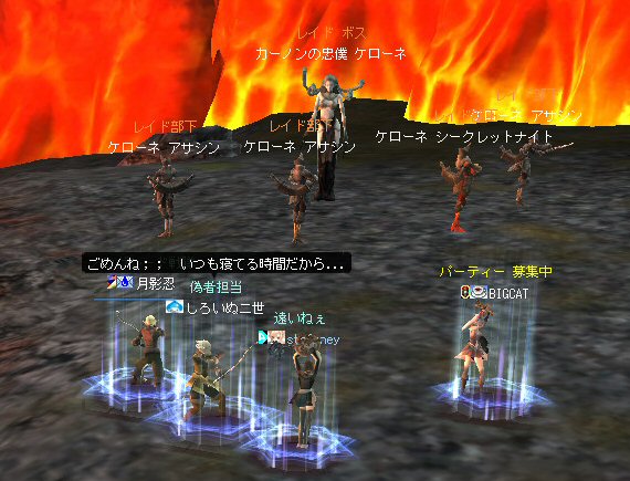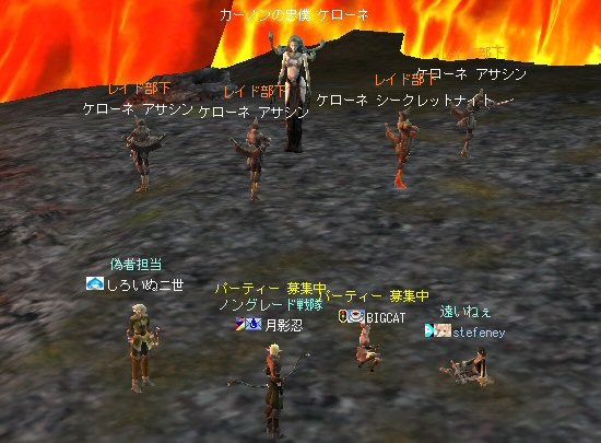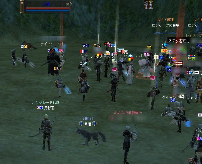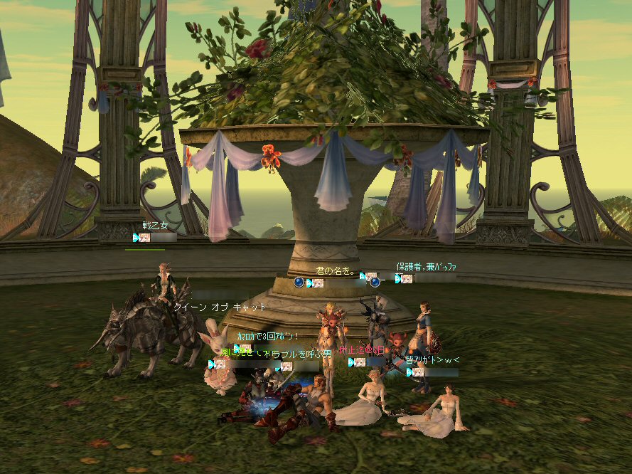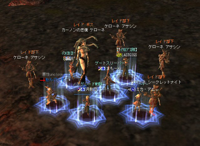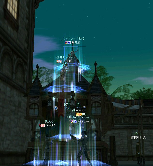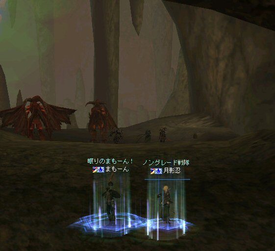 当初、50代~60代が4名ほどだったので、今回もノングレ冒険は火炎を選んだ。 南側の浅瀬で遊んでいたのだが、参加者が増える。 70代のセルアードさんが入る事で、PTの安定感が増す。 (もう少し危険な場所でも大丈夫なくらいだ・・・火炎も油断すると危ないが^^;) そして本日の目玉! ヒューマンファイターのファイターレッドさんw 1次転職すらせずに、50代!! 正直、そんな人が存在すること自体がびっくりだ@w@ リネージュ2の誰もが通る転職活動。 それを無視したプレイスタイル!! ・・・こ、これは、ノングレイズムだw ノングレードで行こう!は、元々「普通のプレイ(決められた遊び方とか制作側で想定された遊び方)」から少し外れた「遊び方」の研究、実戦の場でもある。 レベルに合った装備、 レベルに合ったスキル、 レベルに合ったPT、 レベルに合った狩場、 レベルに合ったクエスト・・・ 第三者がこう遊びなさいと決めて、 それに従う作業の様なプレイではないプレイ・・・ 遊び方の創造を試行錯誤しながら実践しているつもりだ。 (最近マンネリっぽいが・・・ T-T;) 理想のMMORPGとは本来、そんな遊び方すら創造できる環境であるはず。 装備を最低グレードにして装備格差を少なくし、 PTレベルも40~85として経験値効率よりもPTプレイヤーの交流を主としている。 二次転職以上と指定したのは、スキルくらいはレベル相応で持ってた方がいいかな? 位のものだ。 これだけの縛りだけでも、ゲーム難易度はかなり上がる。 だが、 考えてみればプレイヤーの交流に二次転職はどれほどの意味があるのか? 逆に複数そんなキャラクターが存在しているのであれば、 1次転職前の50代キャラでPTプレイってのも面白い!! って思ってしまったw まあ、HPとかかなり低いらしいので、戦闘不能(死亡)状態にはなりやすいらしい。 死亡前提で参加してもらっては、少し困るが^^; 死亡しやすいサークル活動なので、それを覚悟の上なら2次転職にこだわる必要も無いだろうと参加を許可した。 どれくらい彼が戦力になったかは不明だが、ネタとしては面白い! で、一緒にプレイすることに・・・。 実際、PTが充実してくると、多少火力は低くともノングレでも十分狩りは可能だ。 横殴りになってしまった時も、周りの人から暖かく支えられたりする^-^; やっかいなPTモンスターでも、PTの連携がよければ問題なく狩れる。 ただし、魔法クリティカルとかは自然災害という事でw ・・・ 問題なく狩れる火力もスキルがあっての事。 MP休憩は多くなるかな^^; で、数バフ狩りをして今日の活動は終了となるのだが・・・ 5分帰還と何度も言ってるし、 掲示板の告知にもお約束と書いてあるノングレード帰還。 時間がかかるだけで、帰還スクロールを消費する事無く、楽しくチャットが出来、 かつ綺麗な魔方陣の変化を楽しめる最後の締めくくりを・・・ 帰還スクロールを使って台無しにしちゃいけないんだぞw ま、FATLをしてくれたセルアードさんがとてもPTを引っ張ってくれ、 各メンバーも良い連携をして、多少戦闘不能の事故(?)は発生したが、 楽しい一時を過ごせた。 参加してくれたみんな、ありがとう^^ノ という事で、また来週。