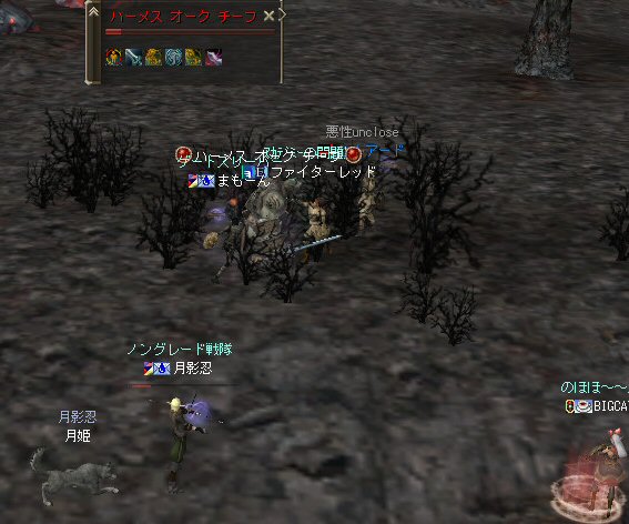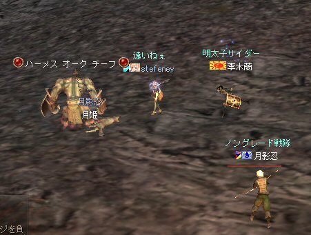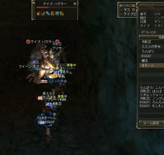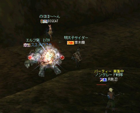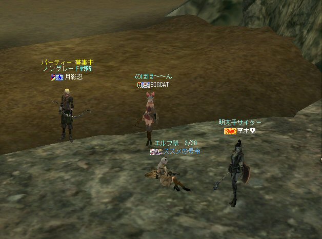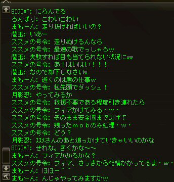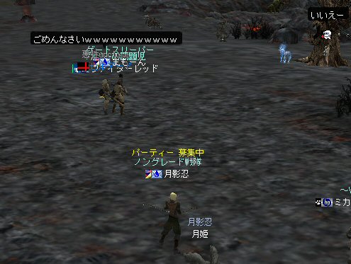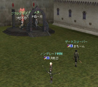 さて、今回のPTメンバーは5人編成。 近間で50~70あたりで遊べそうな狩場と言うことで、 火炎が候補にあがった。 全員移動完了かと思いきや・・・まもーんさんの姿が無い。 リアル爆睡かも・・・ さて、 ノングレード初心者を含むPTの場合、多少説明を加えないといけない部分があるんだが、 まあ、習うより慣れろで、早速しろいぬ二世さんが逝った。 7761のダメージを食らったとの事。 そりゃ、即死するわな^^; 魔法攻撃を受けると、最悪こうなる;w; 復活後、ビビリながら再開。 慣れてくると、普通に狩りをしているのと変わらなくなる。 ただし、受けるダメージが大きい事と、与えるダメージが少ない事は変わりない。 リンクした場合や、PTモンスターを攻略する場合、 叩くモンスターがばらけると全滅の危機が訪れる。 レベルの高い人が多い場合、危険度はある程度軽減されるが、 モンスターのレベルや種類によっては全滅する危険がある事は忘れてはいけない。 久しぶりのケローネさんにも挨拶(ダブルショット)を・・・ 「最寄りの村へ」まあ、普通の風景だな・・・ =w=; 今だ、高レベルの適正レイドモンスターをノングレ装備の集団で倒した事例は、 聞いた事が無いし、倒せたら世界的に伝説だろう。 やってみたいと思うが、協力者が居なければどうにもならない;w; 集合記念写真? しろいぬ二世さんタイムアップ。 急遽ノングレ帰還ミッション発動。 代わりに(?)ノングレ正式隊員の蘭さんがINしてきた・・・が、 到着前に、チーフの餌食になってしまった;; ノングレ帰還終了後、救出に向かうが、それより先に、 近くで狩りをしていた人が救援してくれた。 ありがたや、ありがたや(-人-) しばし、ノングレ狩りを楽しむ。 ミッション終了、2度目のノングレ帰還だ。 参加した皆さん、お疲れ様でした。 追記・・・こ、こんな所でwwwww |