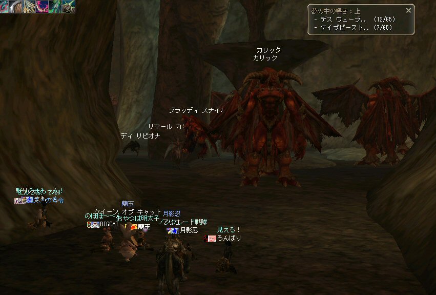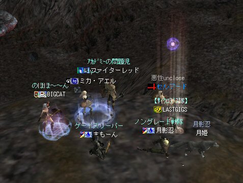 先週リクエストがあったDVCに潜入する。 ミッション:「DVCの橋を目指せ!」 フッ・・・ 我ながら無謀なミッションかもしれない・・・ ノングレード戦隊は、今だかつて、橋までたどり着いた事は無いw (途中、全滅や半壊する事は何度もあったがw) なので、火力の高い人とか来て欲しいところ・・・。 出来ればフルPTになったらいいなぁ~ ・・・ってか、「そんなに都合よく参加してくれる人がいるか」ってのが問題か・・・ 最近、フルPTになった事が無い・・・ 浮き沈みの激しいサークル活動だ (^-^;) 参加人数は6名、 今回は正式隊員が多い。 ある意味、心強い(と言うかしぶとい?)メンバーが集まった。 ミッションの難易度から言えば、今回はフルPTが望ましい。 だが、「あるもので賄う」のもノングレスピリッツだ。 4人いればDVC浅瀬で遊ぶ事は出来る。 6人もいれば、ちょっと奥の単品処理でも大丈夫だろう。 そう、単品処理なら・・・ だが、奥へ行けば行くほど硬くて痛いモンスターになる訳だ・・・ そして、モンスターの出現場所が局所的に集まってたりすると大変さが増加する。 リンクしたり、PTモンスターだったり、戦っているそばに湧いたりw 状況は様々なのだが・・・ 正直、ここはキツイ>w<; っと、ここで俺が66にレベルアップ! 55の時から随分成長したものだw (あの頃は、どす赤いモンスターだったのだが・・・) かと言って、すぐに火力が3割増とかする訳は無いw ふむ、本装備でも大変な場所だ。 それを、よくノングレード装備で来たものだw (自画自賛)ノングレPTメンバー最強wwww MPが持てば何体かは処理できる。 しかし、処理を終えた頃にはまた別のモンスター湧くか・・・ DVCのこんな奥地に来たのはノングレ史上初である。 時間も23時を回っている。 そして目の前には今まで以上に硬くて痛い連中がたんまりと・・・。 「まあ、ここまで来れただけでも良しとするか」 そんな話も出ていたのだが、 やはり、俺たちは「ノングレード戦隊」なのだなw 一時は、ここまでかと思った。 しかし、納得してる訳じゃない。 ミッションは「DVCの橋」に到着する事なのだ。 途中であきらめるのは不本意なのだ。 もちろん出来ること、出来ない事、限界点はある。 一人なら投げ出したかもしれない。 でも、 一人じゃない。 少ないメンバーではあるが、バランスはいいPTだと思う。 そのメンバー一人一人が自分の役割を考え、 ミッション実現の可能性を模索する。 一人ではどうにもならない事でも、みんなで力をあわせれば、 ひょとしたらそれでいけるかも・・・ そこにあるのは、運と可能性。 もちろん、失敗する可能性の方が高い。 だが、可能性を信じる事ができれば、それは希望の光となる。 希望は、死にかけた心でも蘇らせる力を持っている。 それに運が味方してくれれば、あるいは、どうにか出来るかもしれない。 (もちろん運なんてのは気休めでしかない・・・) (運のせいにすると、気が休まる効果しか得られないのだから) (失敗したのは運が無かったなと・・・) (成功すれば運が良かったと・・・) (自分が行動した結果に対して付いてくるものだからな・・・) 話はまとまった。 ススメさんが飛び出し、モンスターを可能な限り引く。 そして、みんながその後を走り、一気に橋まで駆け抜けると言う作戦だw 途中で倒れたら、他のメンバーが引くことになるだろう。 だが、どのみち集中砲火を浴びたら助からないw 今にして思うが、 「十二国記」で言うなら昇山時の黄海の風景とかぶるかも知れない。 昇山者達は、妖魔には敵わない。だからみんな、集団で逃げるのだ。 誰かが犠牲になっている隙に、他の者が逃げられるように・・・ =w=; 作戦開始! ススメさんが侵攻する! が、意外と早めにススメさんのHPが底をついたw スクリーンショットのラグで少し出遅れた俺w 前方でバタバタタゲられたメンバーが倒れていくw だが、今は戦っている場合ではない。 戦ったら最後、全滅だ@w@; みんな、先へ進むんだ! 前へ! もっと前へ!! ・・・ け・・・結局俺だけ!? ミッションは完遂できた。 橋に無事到着したのだ。 しかし・・・ 到着出来たから思うのだが・・・後味が悪い^_^; そう、この場に立ってみて思う。 「みんなとこの場所に立ちたかった・・・」 とりあえず到着はしたのでミッションは完了でいいだろう。 みんなを救出しないと・・・ 近くで戦闘不能のまもーんさんを救出?し、 他のメンバーもと思ったが、 みんな、自分の倒れている場所を見て救出不可能と判断したのだろう;; 最寄ってしまった・・・ 最後はギランでノングレ帰還。 参加してくれた皆さん、ありがとうw 一緒に冒険できて、楽しかった~>w<ノ でも、ちょっとほろ苦い想いを胸にしている月影でした・・・。