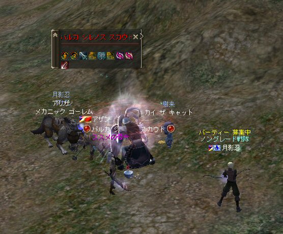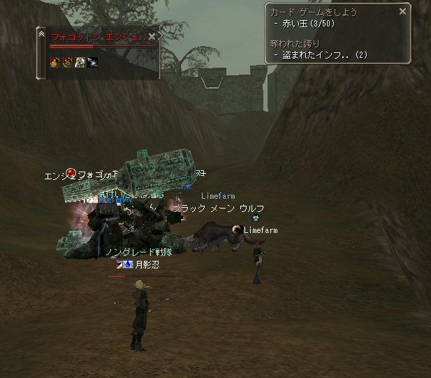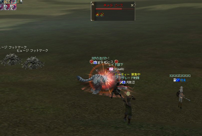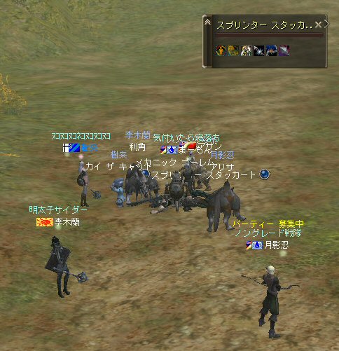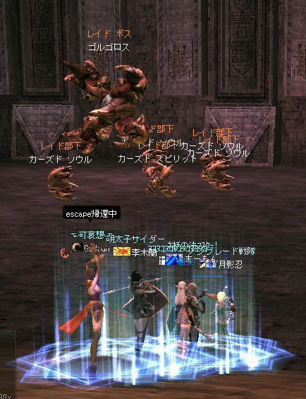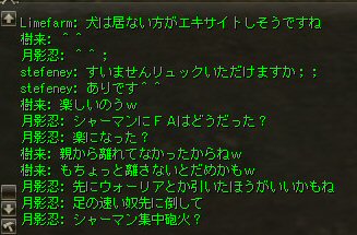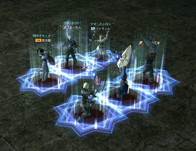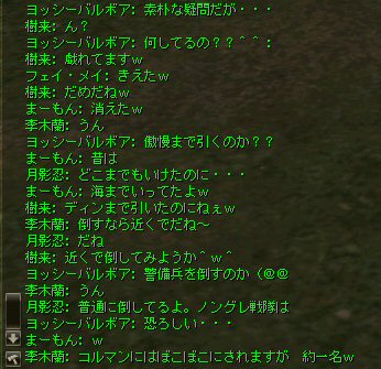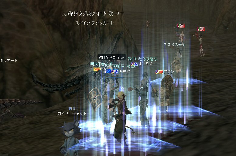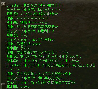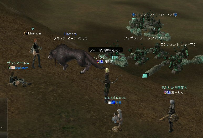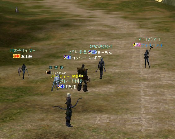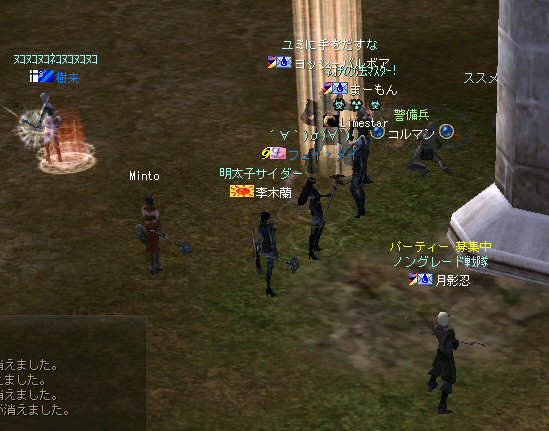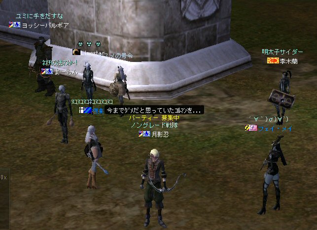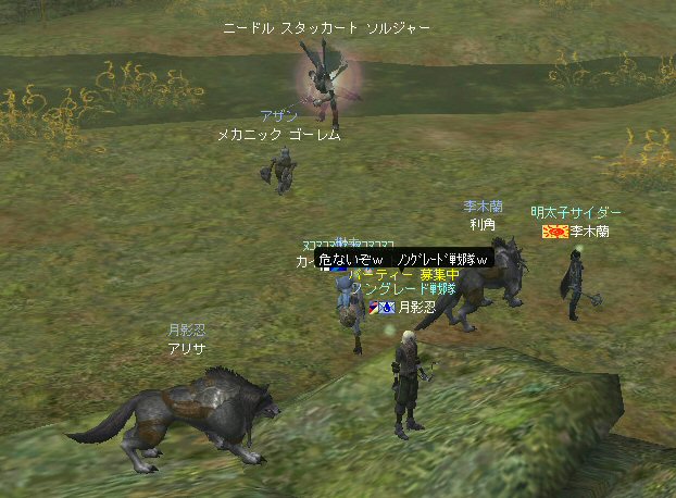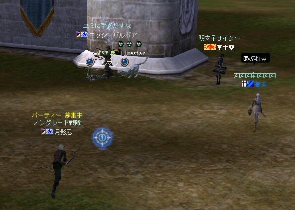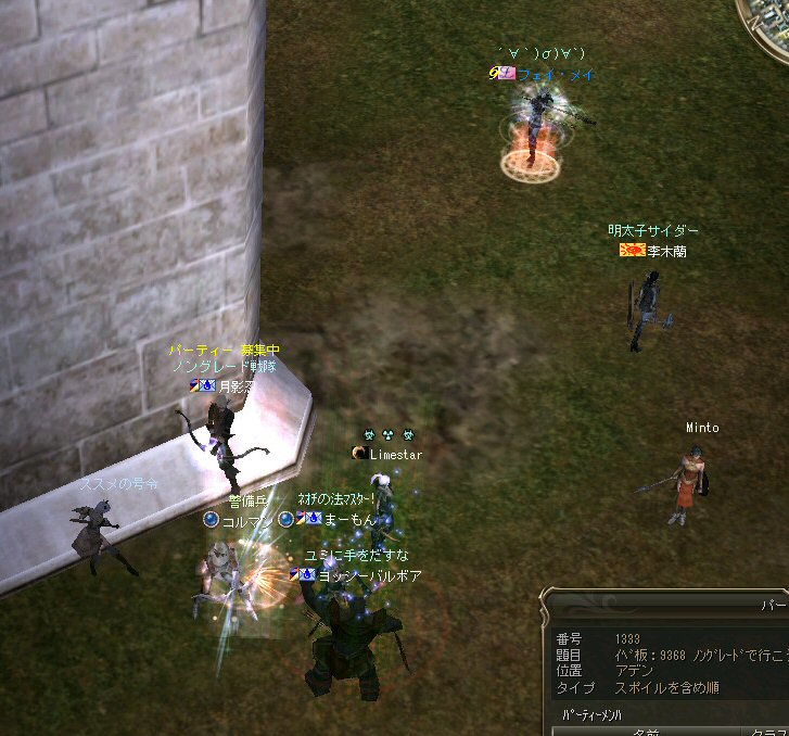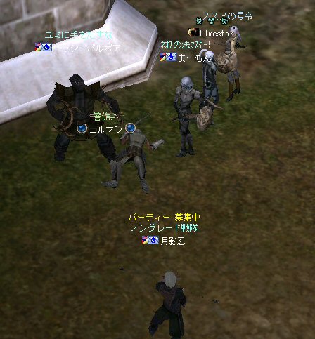 公式での告知文---------------------------------------------- レベルが上がりやすい仕様に変更されて、 最近、本当にレベルの高い人が増えたなと思う。 レイド討伐も、以前は60から募集があったものも62とか64とか… 現地で薄青の人は手抜き、お座り… 適正レベルで参加ならこんな事にはならないのだが、 討伐には人数を必要とする為、適正の人だけでは厳しくなってきているのかも知れない。 もちろん、ドロップ狙う為には有効な手段ではある。 (時々募集レベルに満たなくて泣いているのはナイショだ) でも、みんな70や80になったら、低レベル帯のレイドはどうなるのだろう? やはり、俺たちの様に『石化レイド討伐作戦』だろうか? ある意味時代の最先端を進んでいるのかもw (違? クランでハンティングに行こう!と言っても、上は70~80で下は40台とかになると、 みんなで遊べなくはないが、低レベル者に経験値は入らない。 (ノングレ戦隊も高齢化が始まっていて低レベルの人には経験値が入らない事が…) 「だから、早くレベル上げて一緒に遊べるレベルに…?」 最近、それも面倒に感じる…。 本来、レベル上げ作業をしたい訳じゃない。リネ2の中で仲間や友達と遊びたいんだ。 あまりレベル上げ出来ない人(接続時間短いとかリアル忙しい等…)とか興味のない人は、 そのレベル帯で長く飽きずに遊べる環境が欲しいと思う。 また、レベルが上がったおかげでお気に入りの狩場を去らなければならない事もある。 わざわざ自分から行動不能状態(一般に言う死亡状態)にしてレベル落とすのもなぁ…。 本当にレベル下げポーションとか、レベル強制固定狩場とかできるといいのになぁ…。 他にも、ペットへ行く経験値を自分で設定できるといいのになぁ… ペットに100%自分に0%とか… 以上、愚痴でした。 ま、無い物は仕方がない。 『あるもので賄う』のがノングレスピリットだ。 さ、今日はどんな冒険をしようかね? ----------------------------------------------------------- ・・・と言うわけでアデンの中央広場に集まった俺達。 他のメンバーは分からないが、 気分的に、狩りをする気にならない・・・ NPCで最近遊んでないし・・・ とりあえず南門のコンロイ氏を叩いて、オーク村のNPCと同じか検証した。 コンロイ氏は近接戦闘タイプのNPC警備兵。 叩けば追いかけてくるはず・・・ で、フォースアタックをかける!! 南門を下って闘技場まで引けるか試そうとしたんだが、 スクリーンショットを撮ったあたりで逃げられた(テレポートして消えた)。 目算でキャラクターが見えなくなる距離の倍くらいの位置だろうか。 感覚的には、走り出してちょっと来たかな?くらい(判らんだろうな^ー^;) 元の位置から、そんなには離れてない距離だ。 NPCをノングレで引いて遠隔地へ引いたり、倒したりするのは、 ノングレード戦隊では、定例の遊びの一つなのだが、 今回、初めての人もいたんだよね^^; 最初何が起こっているかわからなかったらしい・・・。 単純にNPCを倒す(NPK)ですなw 以前、警備兵をどこまでも連れて行けたある日(ブログをさかのぼると分かる) コロシアムが単なる決闘場だった頃は、コロシアムで戦った。 あの頃はレベルも55周辺だったろう・・・ 若かったなぁ・・・ (マテ しかし、そこ頃弓警備兵とは、戦っても勝てなかった・・・ 走って逃げても間に合わない。 一発命中すると半分以上HPが減り、反撃する間もなく2発目が飛んできた。 戦った相手は・・・そう、クエストNPCのコルマンだ。 久々にやってみるか・・・ あれ?倒した??? うそん@w@ あの、強敵のコルマンが!? もし、事実ならノングレード戦隊史上初の快挙である。 再検証だw おっ、また倒せたぞ@w@ 俺達、TUEEEEEEEEEEEEEEEEEEEEEEEEEEEEEE!!!!!!! ってのは置いといて・・・ グレシアにアップしてから、多少変更があるようだ。 以前は、足が速いのを利用して、弓の射程ギリギリからダブルショットで打ち込み、 その足ですぐに逃げる戦術を使った。 しかし、相手の射程の方が長く(ロングボウなのだろうか?)、かつ、NPCの足も速かったと記憶している。 全力疾走しても、反撃で死亡していた。 今回の、弓職の俺の戦術としては、門の角から攻撃して、 向こうからの反撃の祭には壁を盾として隠れるようにした。 弓警備兵が追いかけてこない・・・。ほとんど固定砲と化している。 弓警備兵がこちらに気をとられている隙に、近接戦闘職が叩く。 タゲが近接職に移るとヒーラーが癒す。 ヒーラーが癒すとタゲがヒーラーに移る・・・と。 樹来さんが、すぐに叩かれる=w= 固定砲座化しているおかげで、タゲが移ったヒーラーも、門の影に隠れてしまえばどうと言う事は無い。 で、また倒す・・・と。 コルマン氏と戦闘中、補給品クエの途中と思われる人が来たが、 クエの進行には影響が無かったのだろうか・・・ 白チャで呼び止めたノングレ隊員を振りほどき、また狩場へ去っていった・・・。 まあ、NPKです。 コルマン倒せてうれしかったりする^^v その後、巨人たちの洞窟で Limestar さ