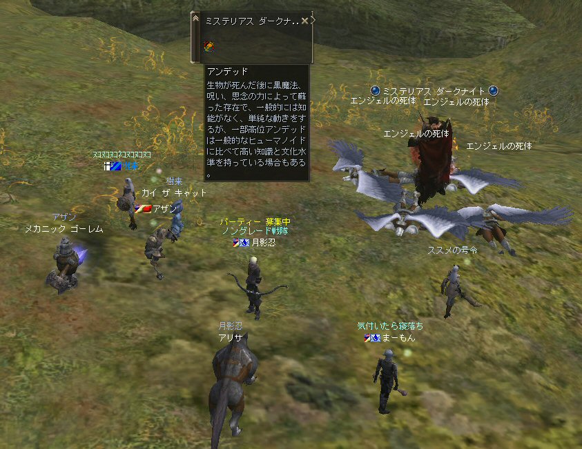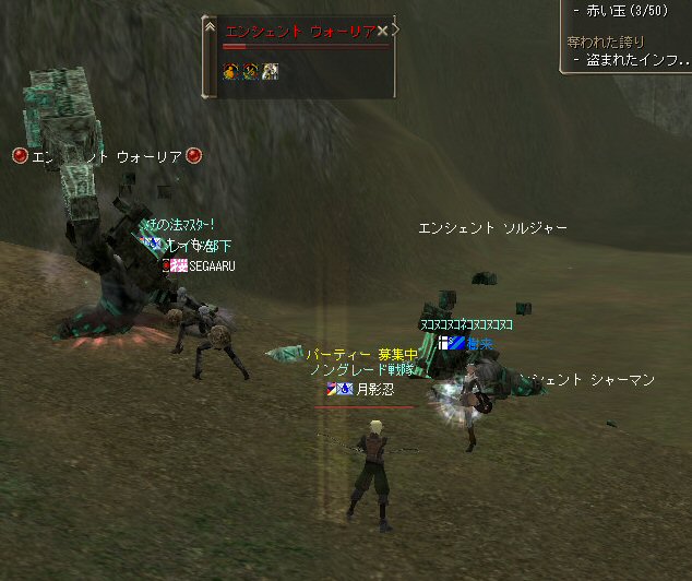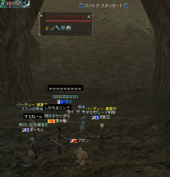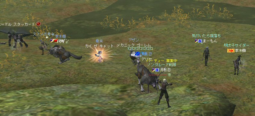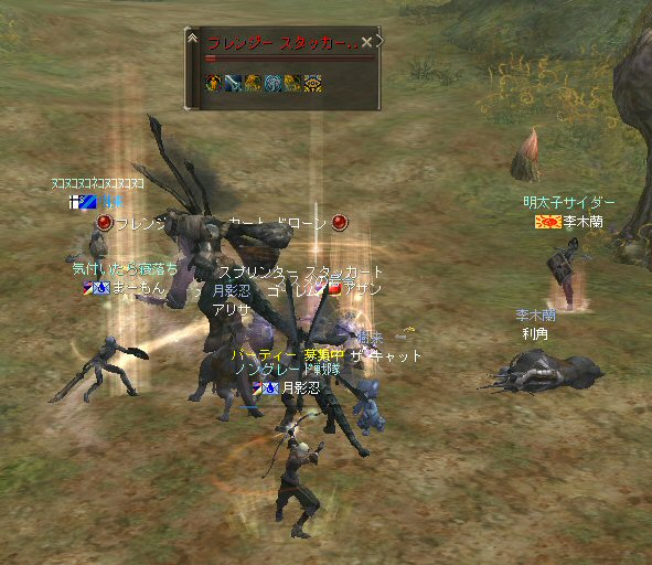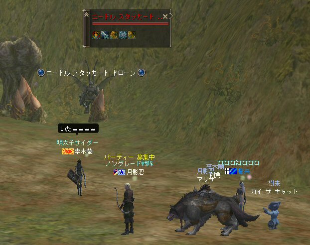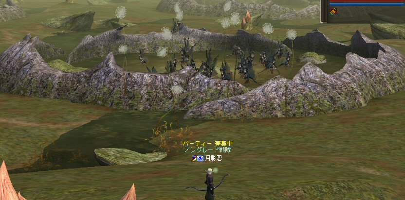 サイレントバレーのPTモンスターと戯れた。 PTモンスターとの戦闘と言う意味では、ノングレ戦隊定番の場所だが、 こちらのレベルが上がってるからと言って油断できない場所だ。 ちなみにウルフは即死するので、育てる気があるのなら出さない方が賢明だ。 せめてBMWにしてからね^^; 先週から言ってるが、 悲鳴の沼あたりのPTモンスターが気にかかる。 果たしてノングレ戦闘がどれくらい通用する物だろうか? 告知してから、数日経過した今日の ビュー:163 ほとんど誰にも見られていないのだろうか? あるいは、ノングレ関係者のみの閲覧とも考えられる。 163人(もしくは163回?)も見に来てくれているのかぁ・・・ そう考えると、まんざらでもない。 で集まったメンバーでシレノスを経由して悲鳴の沼へ。 途中、シレノス関連を倒しつつ進む。 俺からすると、皆、真っ赤なのだが、もうそれも日常。 以前は、ピンクのモンスターでもびびってた事があったっけ・・・ バルカシレノス駐屯地エリアと死霊の関門を通過。 昼時間だったので、アンデッドモンスターはいませんでしたw ・・・で、いよいよスタッカート達の聖地へ。 クエストモンスターらしい・・・ 縁の無いクエストにはトンと疎い。 意外と黄色だったのに驚きつつ。 やっぱり赤いのもいるわけで・・・ で、ドローンが分裂する凶悪な奴らしい。 (前回は、血盟戦布告トラブルで、じっくりモンスターを見る余裕も無かった・・・) 分裂したw そして・・・り・・・利角がwwww この辺のモンスターは、あまり縁が無いので特性がよく飲み込めずにいる。 弓耐性の無いスタッカーとは、HPが減ると仲間を呼びに行くらしい。 で、たくさん襲ってくるらしい。 今回、樹来さんはリコできない職なので、全滅の可能性もある。 回りは皆、慎重に単品引いては料理。 おかげで、危険度もそれほど高くは無い。 しかし、未知の恐怖は払拭できない。 多分、体験しないと真の恐ろしさを理解する事は出来ないだろう。 無難に狩りは進行していくが・・・ ちょいと物足りない。 ↑これは・・・・見ただけで怖さが伝わる。 こんな所で狩りする奴はいるのだろうか・・・(閑古鳥鳴いてるし) 個別に戦うには、倒せるモンスターなので問題ないというか、刺激不足。 しかし、だからと言って集団で来られると勝ち目が無い。 個人的には、遊びにくいフィールドかなぁ・・・。 で、終盤、スタッカートの巣をのぞいてきました。 HP4倍のモンスター達。 一部、単体もいるらしいが、他は分裂する。 4倍で分裂・・・かつ、リンクするとなると・・・ピンポンダッシュ戦法? (逃げてたんじゃ倒せないよ;w;) うーん、倒すためには火力が圧倒的に足りない;; 多分、刃が立たないのだろうなぁ・・・ どこかのクラハンだろうか・・・適正装備で侵入したPTがいた。 ノングレード帰還で〆ている途中・・・ その人達がスタッカート達を引き連れて通路に逃げ込んできた。 幸い、ダンジョン内のモンスターは、出現場所から離れるともとに戻る帰巣本能が強化され、 プレイヤーが、ある程度逃げ切ると追撃を止め、元の場所に帰っていく。 一瞬MPKか!?と思ったのは俺だけじゃないだろう・・・。 言い方を変えるなら、適正装備でも、普通に逃げ出す危険な場所と言える。 危険な場所だが、気になる場所でもあるか・・・。 なんか面白い遊びが出来ないかな? ま、それは次の課題として、本日は終了。 参加した皆さん、お疲れ様でした^^ノ