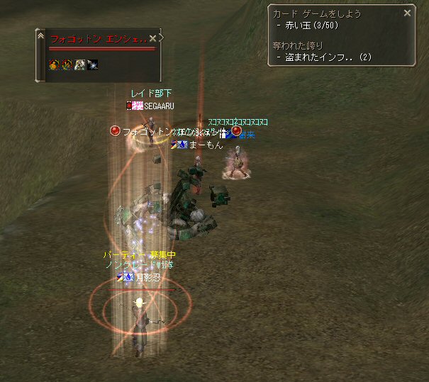 その代わり、サークルハンティングを行った。 通常装備で、普通にハンティング。 惨劇の王者さんが、アクティブなモンスターがたくさんいる傲慢の塔で、 デスリンカーするので、何度も逝っているw ケプルエーさんも来ていたんだが、22:00にリアルの世界へ。 ノングレードも楽しいが、通常装備だって楽しい。 楽しいのは装備が違うからと言う訳ではないと言う事。 集まったメンバーがやはり重要なポイントだな。 傲慢の塔もいつもなら5階入り口でちまちま遊ぶ事が多いのだが、 今回は通常装備。 上の階を目指そう! ・・・と口では言ってたと思う。 にも関わらず、何階まで登ったか忘れてしまった。 いや、覚える気が無かったと言った方がいいだろう。 何階だろうと、楽しければ問題ないw 〆は当然、ノングレ帰還w みなさん。お疲れ様でした^^