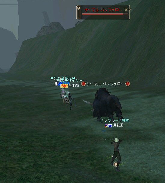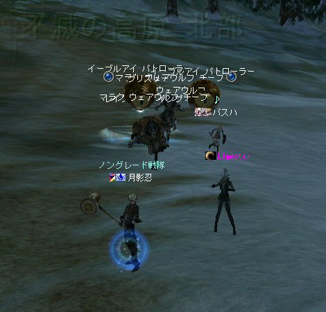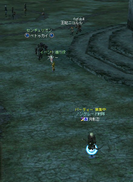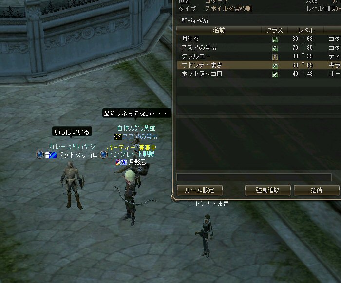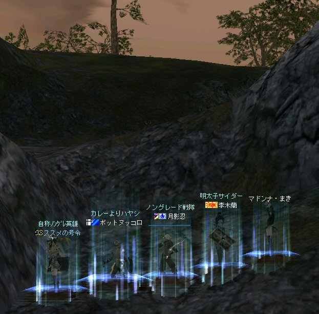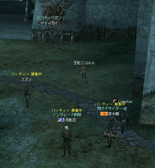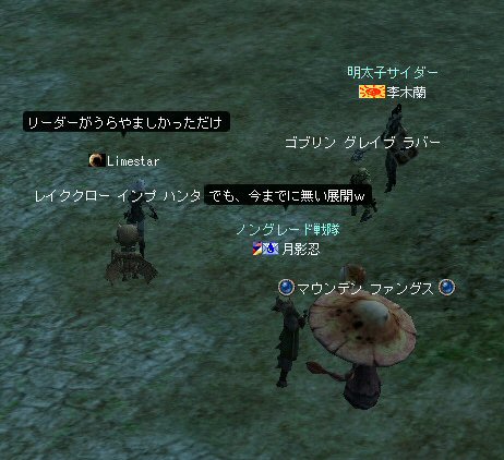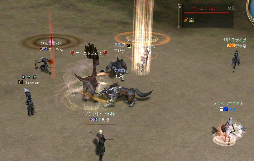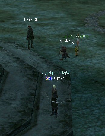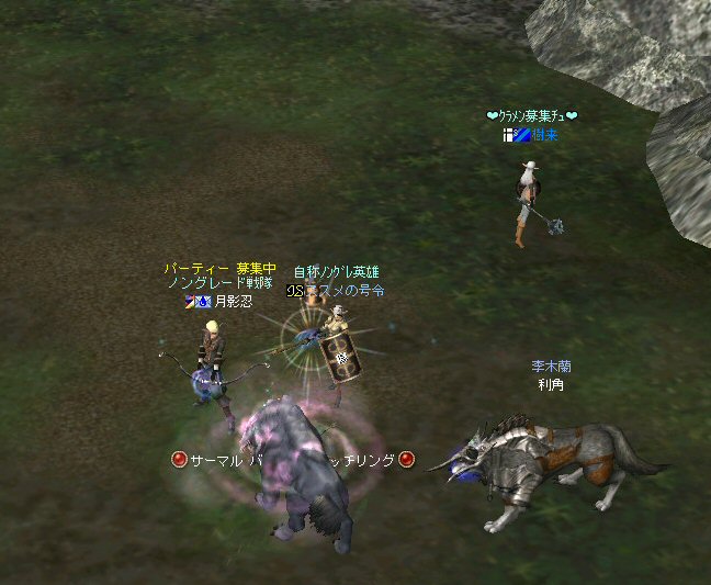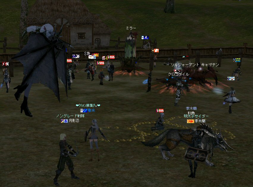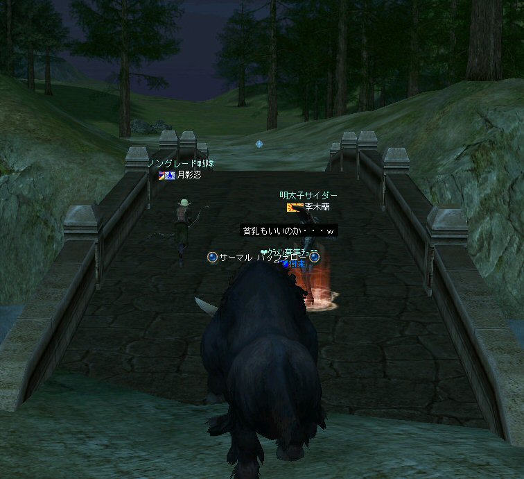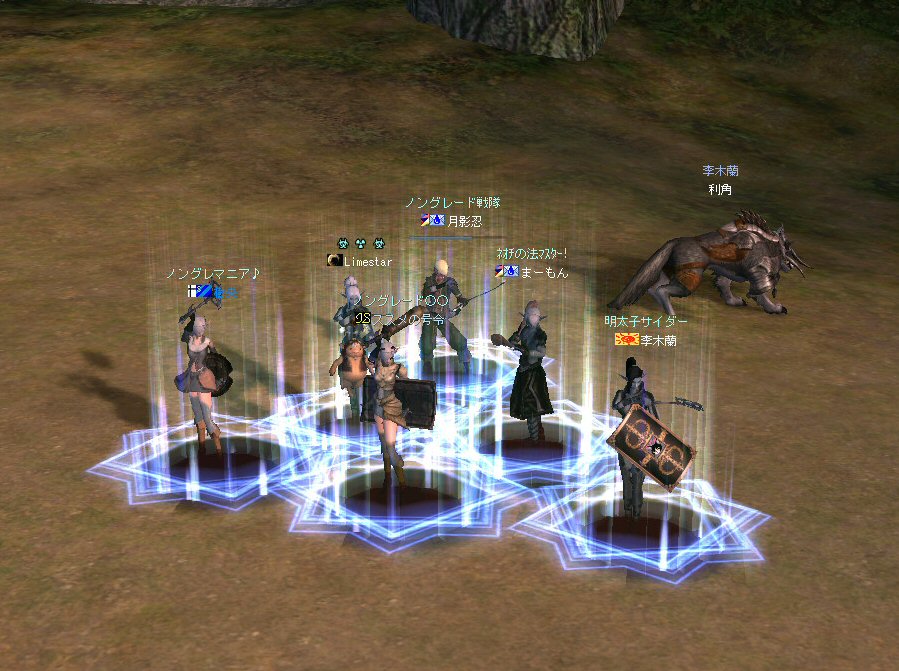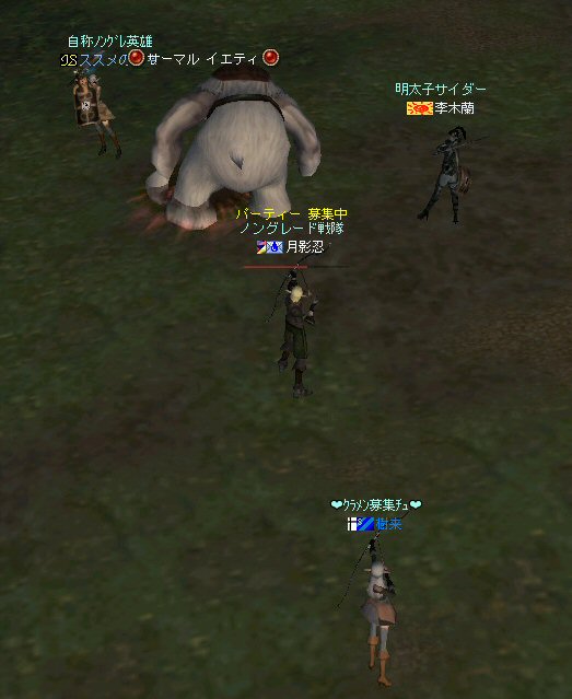 今日は、オーク村に来ている。 するとNPCに向かって自殺するキャラクター達が・・・ 観察して見ると、同じNPCに向かって何度も特攻している。 無我夢中という感じで、周辺の事は眼中に無いようだ。 もし、ここでNPCが居なくなったり移動したりした場合、 普通のプレイヤーなら文句のひとつも言ってくるだろうし、 レベル下げを目的とするなら、他のNPCに向かうだろう・・・ 隣に別のNPCが立っているのだから・・・。 なのでNPCを攻撃して引いて見た。 (セーフティゾーンなので、キャラクターへの直接攻撃は出来ない。) (もしそれが可能なら、間違いなくPKしてたと思うw) 嫌がらせである。 ついて来るついて来る・・・ 彼らには、他のNPCにターゲットを変更しようと言うような思考は無い。 プログラミングされたかの様に、わざわざ固有のNPCを追いかけてきた。 もちろん文句も言わない。 どう見ても、人が操作しているキャラクターとは考えにくい。 結論はひとつ。 BOTだ。 札幌一番って何だよw それも「一」じゃなくて「-」だw (こいつはただ立っていただけだが、名前が限りなくBOTっぽい。) NCJががんばってBANしても、また、わいてくる・・・。 ちなみに今日は、アップ後のリネ2にて、NPCを長距離引く事が出来るかを試すために来た。 どこかで、NPCを長距離引けなくなるような仕様に変更されたと聞いたからだ。 試して見よう。 街中を歩くNPC。 攻撃して見たが、このNPCは、引く事は出来なかった。 攻撃自体を完璧に無視されたw で、門に立っている警備兵を引いたんだが・・・。 確かにある程度離れると、さっさと元の場所へテレポートしてしまう。 仕様変更は、しっかり行われていると言う事か・・・。 これで、アデンの警備兵にギラン城村の町並みや、 グルーディン村の海を見せてあげる事は出来なくなってしまった。 また、ノングレード装備での遊びがひとつ減ってしまった。 リネージュ2は、ノングレード戦隊には冷たい仕様変更をよくしてくれる。 少なくとも、遊びの幅が減ってきているのは確かだ。 複雑な遊び方はいっぱい提示してくれているが、 複雑になればなるほど、リネージュ2の魅力が色あせていく。 OB時代のリネージュ2は、シリアスな世界だった。 ファンタジーの王道を突き進むMMORPGだと記憶している。 もちろん、良心的なプレイヤーばかりでは無いので荒れた事も事実だ。 異国のプレイヤーに蹂躙された事もあった。 みんなレベルも低かったし、だからこそつながりも深かった気がする。 でも、今のふざけた帽子の数々やレベル上げに力を入れたアップ、 強化アイテムを振りまくイベント・・・。 リネージュ2は、遊園地の様相を示してきていると思う。 ふざけた世界に興味は無いんだが・・・。 やはり、理想とはかけ離れたゲームへと進化(退化)している気はする。 それが製作側の求めている物なら、いずれ、俺は離れる事になるだろう。 ま、愚痴は置いといて、 今の所、まだノングレードでも楽しめる要素が残っているようだ。 ・・・と言うか、ノングレード戦隊は、人が命だな^-^; 集まった参加者のエネルギーに拠る所が大きい。 協力しようと言う気持ちの強い人が多いと、まとまりやすい。 逆に、目的も無く、ただなんとなくノングレに入った人には、面白くないかも知れない。 『ノングレードで行こう!』と言うイベント的サークル活動は、生ものである。 美味しくしようとみんなで協力すると、美味しくなるし、そうでないと荒れる気がする。 今回は、美味しくしようとする人達が集まったと思う。 そうでなければ、いろんなモンスターがいっぱい引かれて、パレード状態にはなっていないはずw いままで、こんな風な引き方をした事は無かった。それだけで新鮮! ノングレ戦隊としては、『初のMOBパレード』と言えるだろう。 俺的にはとても面白かった^^ オーク村から聖者の渓谷に来たあたりで、23:30を超えている。 開始が遅かったのもあるが、タイムアップだな。 今回初参加のパスハさん、Limestarさん。 Limestarさんは復帰組で、長いブランクの間に変わったリネ2の景観を見たいとか。 で渓谷からコースを修道院に変更して、修道院で終了にする事にした。 途中の石門に蜘蛛の巣がある事を発見したのは、Limestarさんだった。 普段見慣れて見過ごしてしまう風景のから、制作者のこだわりを切り出す目は大事だ。 MOBと一緒に走る事にときめいたパスハさんも然り。 ノングレに『ときめき』は、欠かせない。 無理強いはしないが、君達にはノングレ戦士としての才能がある。 今回参加した新規の人は、是非継続してノングレに参加して頂きたいw という事で本日のノングレ活動終了。 参加した皆さん、お疲れ様でした^-^v 以上。