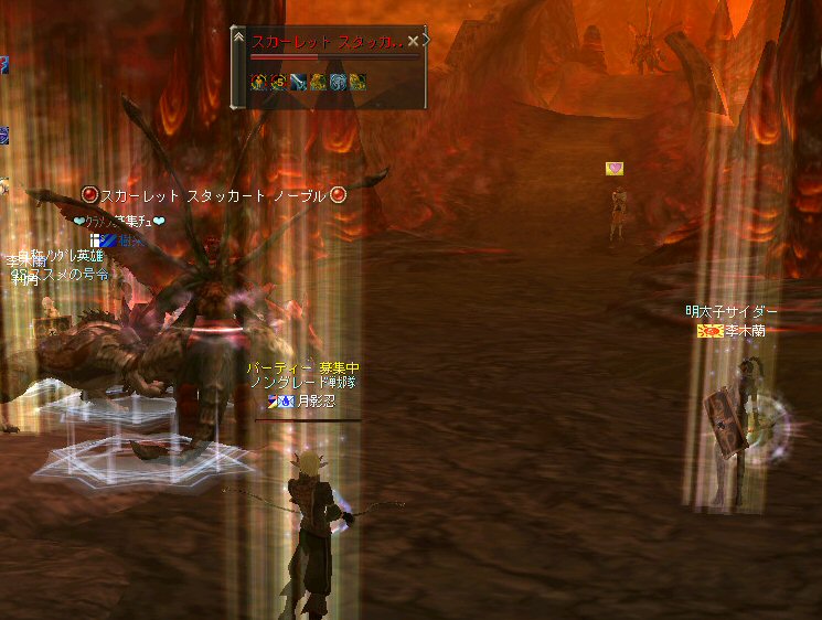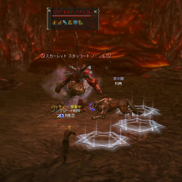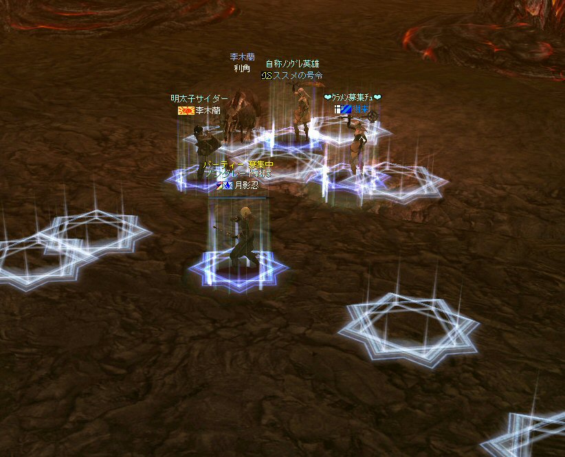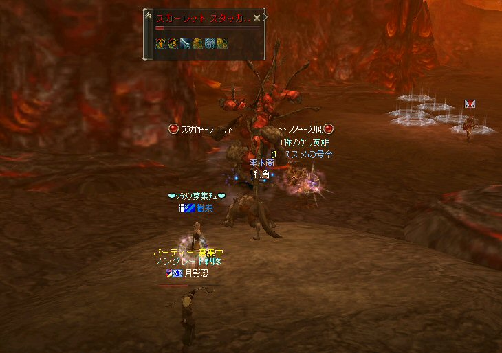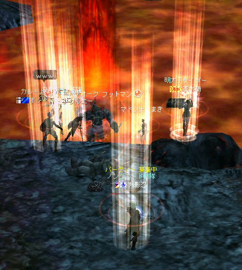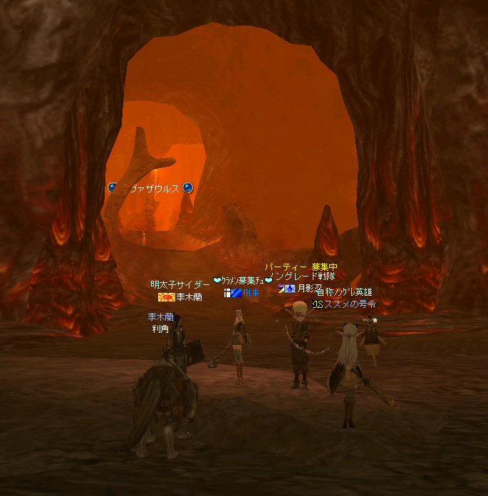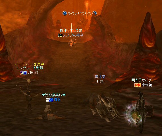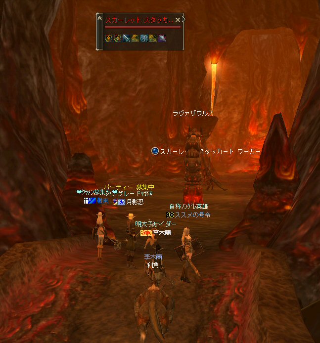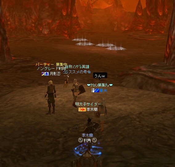 行ってきましたノングレ戦隊! 集合場所は温泉のGKで飛んだところ。 A装備とかS装備とか身に付けた人達が現れては彼方へ消えていく。 70代が対象の狩場。 俺にしてもまだ60になったばかり。 当然モンスターは赤く、命中率も極端に落ちる。 ソロなら、果たして死なずに済むか疑問な場所。 (いや、多分死ぬw) だが、ヒーラーがいると・・・そう、ペア狩りなら何とかなる。 蘭さんの援護でペア狩り。 当然と言えば当然だが、ふたりとも死にそうになってたw で、仲間がぽつぽつと集まってくる。 9:30も回って、コアのメンバーが揃ったので内部に侵入だ。 姉貴は何度か来ている場所だ。 ヴァラカス討伐するためには、ここを通らなければならない。 ・・・しかし、最近ヴァラカス討伐の一般公募は無い。 クローズで皆、狩られているのだろう。 それも70後半だったり、3次職の人だったり、OE品の装備てんこ盛りの人だったり・・・。 恐らく、レベルが適合しても条件が厳しくてPTに入る事は出来ないだろう・・・。 そう、今となっては・・・。 ま、そんな話は置いといて、 ノングレ戦隊としては、初めての聖地だ。(死地か?) 何度か逝く事も念頭に置きながら様子を伺う・・・。 なんか、名前なんか赤と言うよりは、黒に近くね? 危険度はとても高いw ドキドキ・・・ ススメさんが引いてくる。 PTモンスターは最初からは無理だと思うので、まず単品で・・・。 (単品が分裂するって言う話しではあるがw) 引いてきたモンスターを倒す。 分裂しなければ、どうと言う事は無い。 俺達最強www で、ススメさんが再度引きに・・・ 単品・・・のはずだよね? なに?その後にいる奴ら・・・ ・・・ なにか、みんな、HPの減りが早いよ? ・・・ 阿鼻叫喚w ・・・ 蘭さんが逝ったw ・・・ ちょー ・・・ 蘭さん復活・・・ ・・・ぬぬっ PTリコ発動w ゴダードから再度温泉へ飛び、火鉢へ向かう。 これは途中の雑魚処理。 (雑魚とは言っても、俺から見ると赤いのだよ=w=;) 内部へ再度突入。 さっき、リコしたあとが残っている。 バグだと思われるが、綺麗なので許す。 っと言うか、バグだとしても残して欲しい仕様だな^^; で、次は分裂するタイプを引いてきてもらった。 倒すと同時にわらわらとわいた@w@; 即座にPTリコw ゴダードから戻って見ると・・・ 再度引いたが、単品ではなかった。 分裂後でノンアクになってるから分裂しない? にしてもMP切れ、 再度リコ発動した気がする・・・ 再度戻ってきたんだが、折角きたんだから観光もしておこう。 入り口のところにあるマグマの海。 実は海に入ることが出来る。 海と同じ扱いで呼吸ゲージが出る。 マグマの中なので、平行してダメージも受ける。 あまり長くマグマの中に留まる事は出来ないが・・・美しい。 この景色を見て無い人は、もったいないかも知れない^^; かなり苦労して作られているのか・・・時々動けなくなる。 見えない壁があちらこちらにある。 放置すると死ぬw 決して安全な場所では無いので、注意が必要だ。 さっきのリコ跡でノングレ帰還(5分帰還)だ。 ・・・と、PT参加希望者がw 折角だからと言う事で、短時間だがDVCへ行くことに。 2バフほどで終了。ススメさんが寝落ちした^^; 本日本当の最後の〆、ノングレ帰還・・・。 (ススメさんを危険地帯に放置するわけにも行かないので、帰還寸前にリコしてもらった) 参加メンバーのみなさん。お疲れ様でした&ありがとう^^ノ