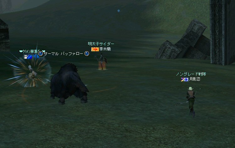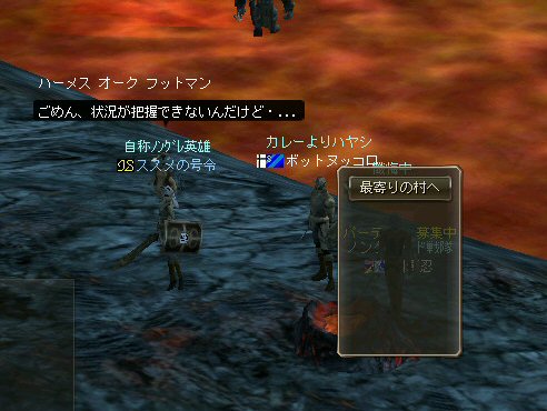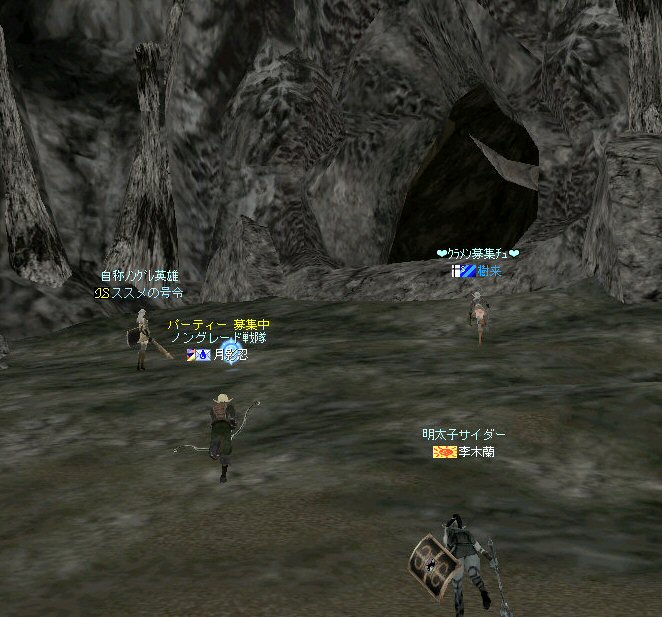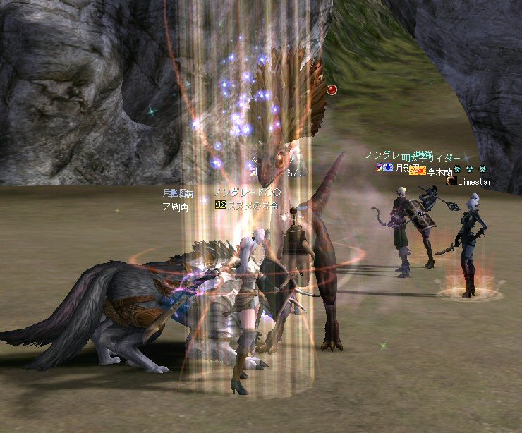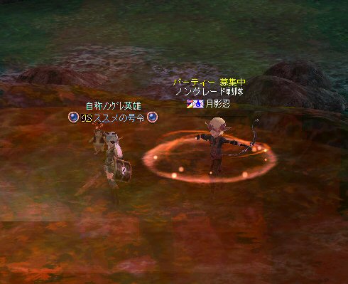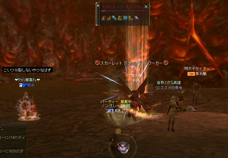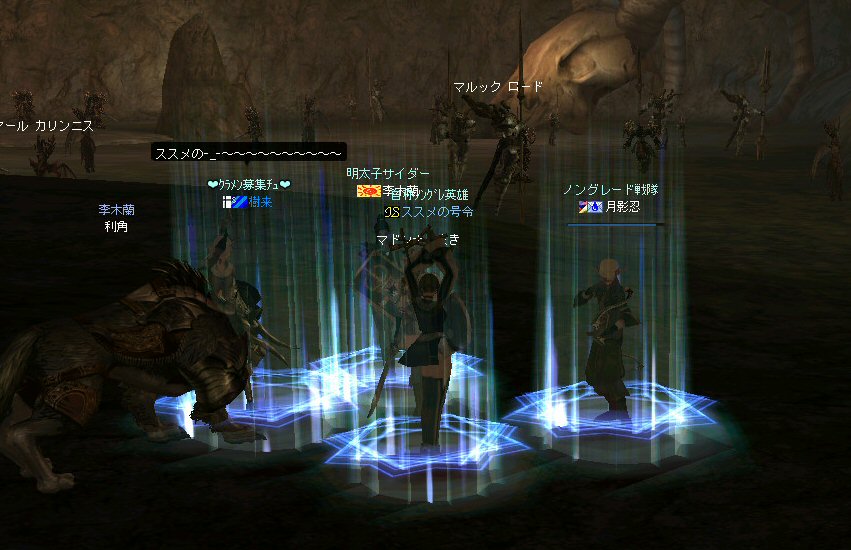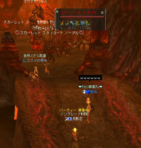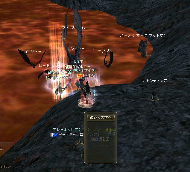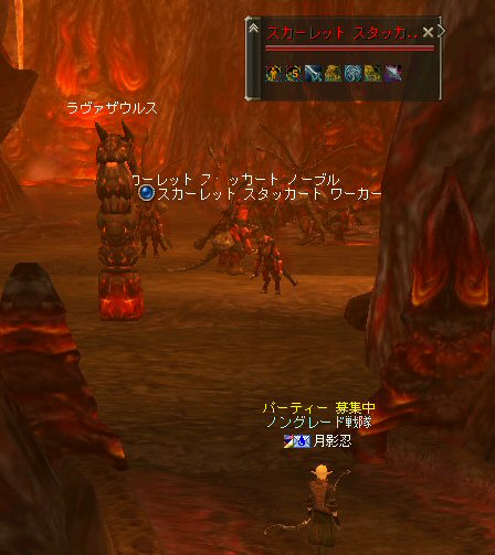 行ってきましたノングレ戦隊! 集合場所は温泉のGKで飛んだところ。 A装備とかS装備とか身に付けた人達が現れては彼方へ消えていく。 70代が対象の狩場。 俺にしてもまだ60になったばかり。 当然モンスターは赤く、命中率も極端に落ちる。 ソロなら、果たして死なずに済むか疑問な場所。 (いや、多分死ぬw) だが、ヒーラーがいると・・・そう、ペア狩りなら何とかなる。 蘭さんの援護でペア狩り。 当然と言えば当然だが、ふたりとも死にそうになってたw で、仲間がぽつぽつと集まってくる。 9:30も回って、コアのメンバーが揃ったので内部に侵入だ。 姉貴は何度か来ている場所だ。 ヴァラカス討伐するためには、ここを通らなければならない。 ・・・しかし、最近ヴァラカス討伐の一般公募は無い。 クローズで皆、狩られているのだろう。 それも70後半だったり、3次職の人だったり、OE品の装備てんこ盛りの人だったり・・・。 恐らく、レベルが適合しても条件が厳しくてPTに入る事は出来ないだろう・・・。 そう、今となっては・・・。 ま、そんな話は置いといて、 ノングレ戦隊としては、初めての聖地だ。(死地か?) 何度か逝く事も念頭に置きながら様子を伺う・・・。 なんか、名前なんか赤と言うよりは、黒に近くね? 危険度はとても高いw ドキドキ・・・ ススメさんが引いてくる。 PTモンスターは最初からは無理だと思うので、まず単品で・・・。 (単品が分裂するって言う話しではあるがw) 引いてきたモンスターを倒す。 分裂しなければ、どうと言う事は無い。 俺達最強www で、ススメさんが再度引きに・・・ 単品・・・のはずだよね? なに?その後にいる奴ら・・・ ・・・ なにか、みんな、HPの減りが早いよ? ・・・ 阿鼻叫喚w ・・・ 蘭さんが逝ったw ・・・ ちょー ・・・ 蘭さん復活・・・ ・・・ぬぬっ PTリコ発動w ゴダードから再度温泉へ飛び、火鉢へ向かう。 これは途中の雑魚処理。 (雑魚とは言っても、俺から見ると赤いのだよ=w=;) 内部へ再度突入。 さっき、リコしたあとが残っている。 バグだと思われるが、綺麗なので許す。 っと言うか、バグだとしても残して欲しい仕様だな^^; で、次は分裂するタイプを引いてきてもらった。 倒すと同時にわらわらとわいた@w@; 即座にPTリコw ゴダードから戻って見ると・・・ 再度引いたが、単品ではなかった。 分裂後でノンアクになってるから分裂しない? にしてもMP切れ、 再度リコ発動した気がする・・・ 再度戻ってきたんだが、折角きたんだから観光もしておこう。 入り口のところにあるマグマの海。 実は海に入ることが出来る。 海と同じ扱いで呼吸ゲージが出る。 マグマの中なので、平行してダメージも受ける。 あまり長くマグマの中に留まる事は出来ないが・・・美しい。 この景色を見て無い人は、もったいないかも知れない^^; かなり苦労して作られているのか・・・時々動けなくなる。 見えない壁があちらこちらにある。 放置すると死ぬw 決して安全な場所では無いので、注意が必要だ。 さっきのリコ跡でノングレ帰還(5分帰還)だ。 ・・・と、PT参加希望者がw 折角だからと言う事で、短時間だがDVCへ行くことに。 2バフほどで終了。ススメさんが寝落ちした^^; 本日本当の最後の〆、ノングレ帰還・・・。 (ススメさんを危険地帯に放置するわけにも行かないので、帰還寸前にリコしてもらった) 参加メンバーのみなさん。お疲れ様でした&ありがとう^^ノ