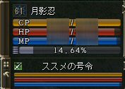 ノーアイディアだ。 最近、マンネリ? うーむ・・・ 集まりもイマイチ・・・ ま、それは個人の都合だからとやかく言えん・・・ 人が少ないね・・・今日はTwT; (と言うか・・・クランもINしてる人が少なくなった・・・) 「木曜日と言えばノングレ」を合言葉に集まってくれるススメさん。 木曜に限って言えば、一番ハマってる「FEZ」よりも、こちらを優先してくれているw で、告知文のコピぺで集合場所が温泉のままだった為、 ふたりで温泉に入って(混浴だ^^v)一汗・・・ とは言え、ススメさんは70代も中盤に・・・・随分差が開いてしまった。 かく言う俺も61になって、少しずつ経験値を貯めている。 2年前よりもペースが速いかもしれない>w<ノ 今日は14.64%だ。 しかし、レベル差が存在し、その弊害があるというのも確かだ。 20以上はなれると、経験値の文字すら出なくなってしまう。 ファーストスローンから変更になった仕様だ。 1-3. パーティー経験値の分配 1. パーティープレイ中に経験値の分配を受けられるレベル差が設定されました。 2. パーティー内最高レベルのキャラクターとのレベル差が20以上あるキャラクターは 経験値を得ることができません。 『ノングレードで行こう!』にとっては迷惑な仕様変更だと断言する。 (ノングレイベントに、余計人が来なくなるじゃないかw) 恐らくは、業者や心無い不正プレイヤーによって放たれるBOTキャラクターの 高速育成を抑制するためだとは思う。 だが、死亡すればしっかり経験値はロストする訳で、 レベル差を無視したPTは、 経験値取得とかレベル上げといった効率的思考を停止しないと、 損得勘定がどうしても頭をよぎり、PT行為自体が辛くなるw 経験値:1とかでも入ると気がまぎれるんだけどね^^; 結構きついなぁと言うのが俺の本音。 「だったらレベル制限をすりゃいいだろう」とか言う意見は却下だ! 今回はケプルエーさんが39で参加。 40でもきついのに2次転職前・・・ あまり無茶な場所にはいけないか・・・ 温泉からふたりとも帰還してアデンで相談。 手ごろなところは傲慢か火炎かな。 参加者の希望もあって、火炎に行く事にした。 まあ、ここも危険な場所には違いないが、狩れない事はない。 しかし、狩れてもケプルエーさんに経験値は入らない。 70以上の人が入っているPTでプレイしてる… その差30以上! ノングレのレベル、55くらいからにしようかとも思ったりする。 でも、もともとの原因はNJじゃないか…。 納得できない仕様で振り回されるのは嫌だなぁ…。 あれ? あれれ? あれれれれ@w@? なんか、いつもと違う。 地に足が着いていない感じ。 こんなときはよく逝く。 参加者に気を使い始めると、空回りもする。 最近は40代の人とか居なかったから、ある意味強力なPTになっていたのだろう。 油断をすると70代の人だって逝く場所だ。 モンスターの湧きが微妙に早い。 今日は壊滅状態が2回ほど・・・ 最近にしては珍しい・・・と言うより、なめてかかってた感があるかな。 油断大敵だ。 まあ、散々な状態で23:00頃、ケプルエーさんが帰還。 残りのメンバーで、少し南側で狩りをする。 そう、オークとか、芋虫とか、浮遊玉とか・・・ ・・・・普通に狩れるやんw・・・ なんだかなぁ^^; ま、たまになこんな日もある。 参加した皆さん。お疲れ様でした。 なんか、逝くだけ逝った今回のノングレ・・・ 自分の中では「敗北感」がちょいと残ってます^^; 経験値もご覧の通り下がってます。 ま、活力システムのおかげで、後日、すぐに復旧したけどね^^;