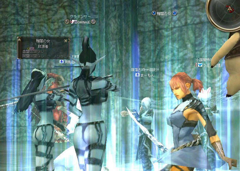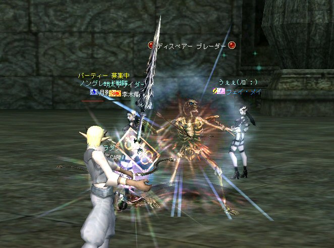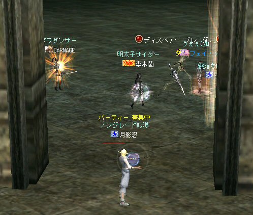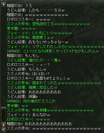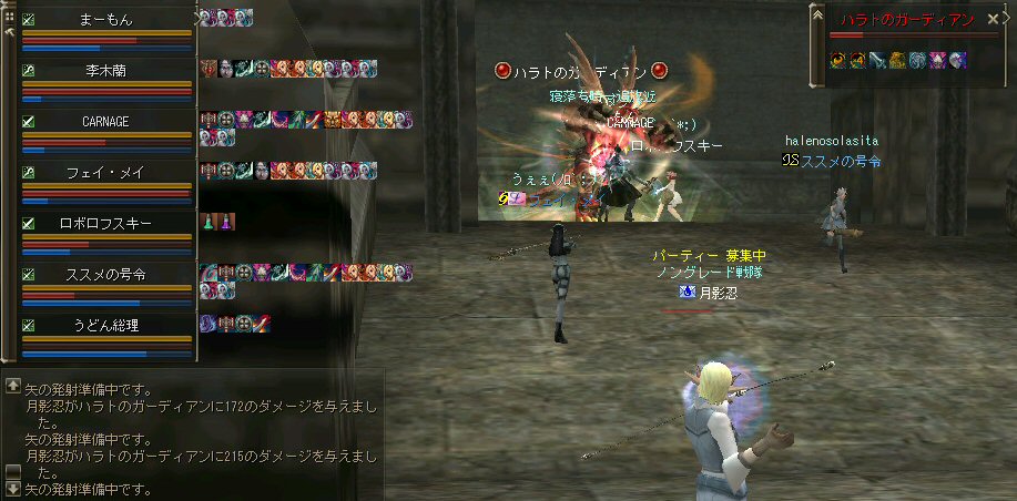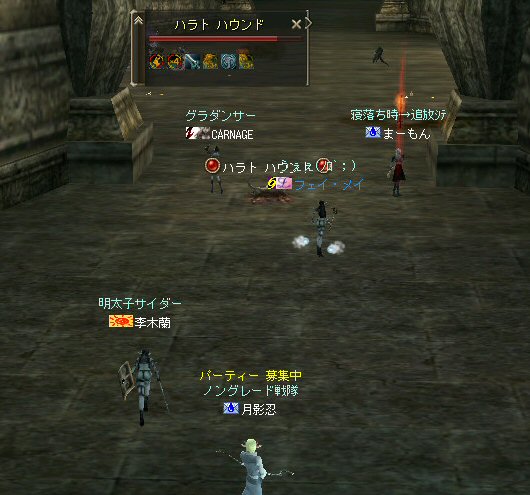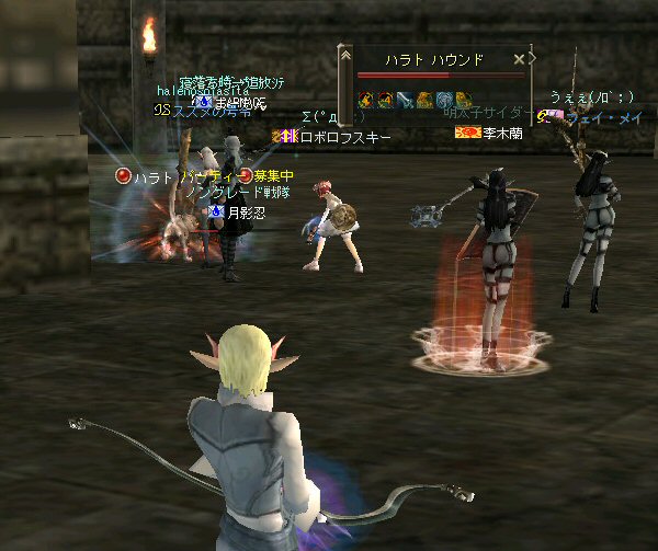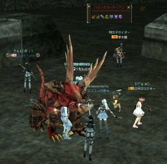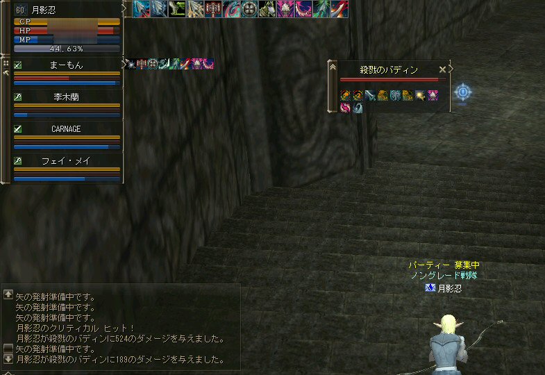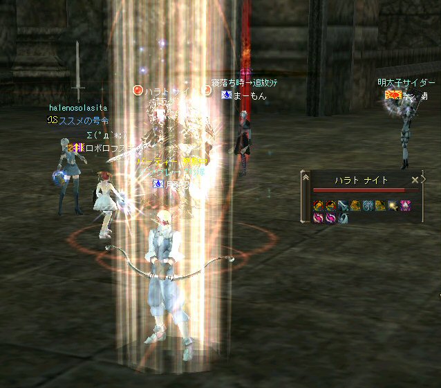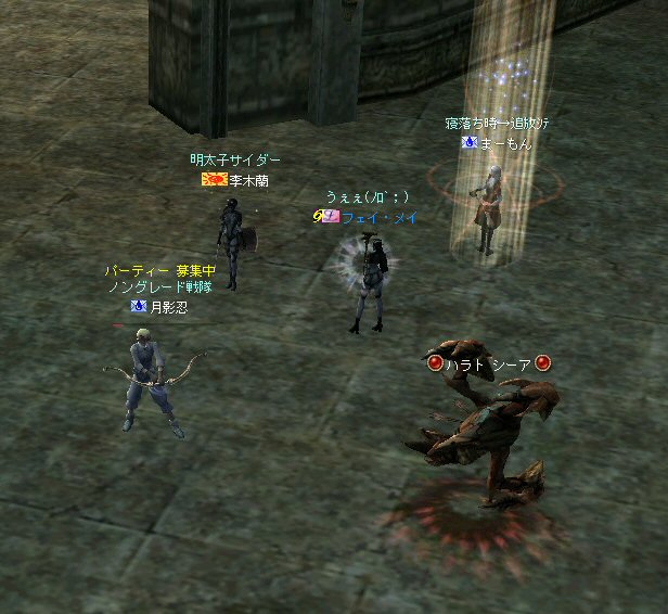 先週、話の流れから裸でノングレード戦隊になってしまったが、なかなか面白かった。 そこで今回は定番の『傲慢の塔』の予定だ。 傲慢の塔の5階は、ノングレードで行こうの原点のような物だ。 そう、DVCの浅瀬と傲慢の塔は思い出深い場所なのだ。 当時の俺が真っ赤な敵を相手に戦った場所。 もちろんPTメンバーがいてくれなければ、それは単なる特攻で終わっていた事だろう。 無謀な試みをして無駄に死ぬのは、ただの自殺行為と変わらない。 それは、遊びとは言わない物だ。 高レベルの狩場に、「ノングレードで行こう!」は無謀ではないのか? そう、無謀に違いは無いと思うが、死ぬ気は全然無い。 以前にも話したが、生き残りをかけた遊び方が「ノングレードで行こう!」だ。 全滅したらゲームオーバーなのである。 集まったメンバーではちょっと厳しいかもしれない1Fから開始。 相変わらず、手を変え、キャラを変えてBOTが走り回っている。 ここの連中が、数ヵ月後にどこかの血盟に所属し、盾職なのにヘイトって何ですか? とか質問するのだろうか・・・? アカウントを買う馬鹿がいなけりゃ業者だって商売にならない。 需要があるから違反してでも供給するのだろう。 また、ツールを使って高速育成なんてやってるプレイヤー連中もいるのだろう。 高レベルの方が戦争は有利だし、時間をかけてプレイできない連中は、 違反と知りながら、高レベルキャラクターを手に入れようとするかもしれない。 要は、高レベルで高額装備を身に付けている者が、俺TUEEEEEEEEできると、 そう言う仕様なのだ。 新規で初めてリネージュ2する人は、 70代とか80代のキャラクターが戦争してるのを見て、絶望するかもしれない。 戦争目的なら、レベル上げと高額装備は必須条件だからだ。 クランに入って、気のいい先輩から使わなくなった低レベルでの最強装備を借りて、 一生懸命レベル上げ…。 戦争に参加しても最初は敵の的にしかならず、結局は必死にレベルを上げ・・・。 早く高レベルになってクランに貢献できるようになる為には結局、廃プレイか 規約違反のRMTに走ってしまうんじゃないのか? ゲーム環境を提供している会社が、 低レベルしか参戦できないような戦場を提供すればいいのだろうが・・・ それも、古株プレイヤーのサブキャラクターがOEした武器で我が物顔で荒らすだろう。 やはり、低レベルでしか参戦できないような戦場を作るのなら、 そう言った不公平感を無くすためにも、『ノングレードで行くしかあるまい!!』 そうだ、俺たちは遥か未来を見据えてプレイしているのだw (ホントカ? ・・・とか、ノリはいいんだが、さすがに裸は痛い>w<; CARNAGEさんがw・・・ 戦死者が出てしまったw 魔法クリだったのかもしれないが、自分のHPを越えるダメージを受けて生き残る手立ては無いw ・・・ orz メンバーの一人がGMにBOTコールをした。 無事、キャラ凍結になる事を祈ろう・・・。 よし、2Fへ移動だ。 ここには先客がいてた。 火力もその人達と比べたら低いので、少し引いては各個撃破とかしてたんんだが… PTモンスター引っ掛けたw うはw ちょwww もう少しで全滅w 取り合えず『モンスターを引いて逃げ切り作戦』をしようと下の踊り場へ移動中 シルレンは足が速いので、モンスターを引いて逃げ切るのに成功する場合が多い。 逃げ切ったあとは、モンスターのタゲが外れるので舞い戻って体勢を立て直す… と言うのが常套手段(実は脳内作戦?)なんだが、 先に遊んでいたノングレとは無関係のPT(人達)にリザしてもらったらしい。 すでに体勢は整っていた。 3F、4Fもちらっと味見して5Fへw ハラトコマンダーが入り口から見えた。 単品のあいつから血祭りに上げようw と、近づいて矢を発射するときに、 入り口の影にハラトのガーディアンがいるのがチラッと見えたw 発射態勢に入った俺は止まらないw うはw リンク必須w でも2匹なら足止めと眠らせる事でなんとかいけるハズだw とにかくハラトコマンダーを引いて、敵モンスターの火力を分散させよう。 @w@; ハラトのガーディアンが何で2匹おんねんw 3匹はちょっと危険信号だw 全滅はマズイ。とにかくみんな攻撃をやめて、俺にモンスターのタゲを向けさせてくれw ・・・って想いに反し、みんな良く戦う。 ものすごい善戦だ。 コマンダーを倒し、ガーディアンへ火力集中。 ある者は床に転がり、ある者は火力の有無を無視して敵に立ち向かうw 本来、後衛職などと呼ばれている職は、支援が本職だ。 薄い防御で減らしたHPを可能な限り回復すれば、あっという間にMPは枯れる。 そして、戦闘職の火力で敵を殲滅するのを待っていられるほど余裕も無い。 後衛職業務も滞るほど、MPは枯渇た状況で殲滅時間が長くなれば当然全滅の可能性が高くなる。 だから、ノングレではヒーラーも戦闘に加わっている。 ノングレではそれが普通の状況。 ヒーラーはアタッカーとして、ヒーラーとしての仕事を受け持つ事になる。 なんと言っても本日は裸族なのだTwT; 守ってく