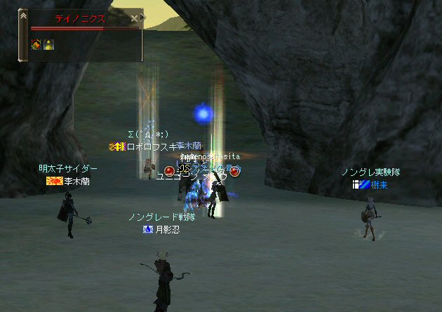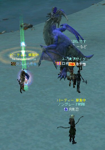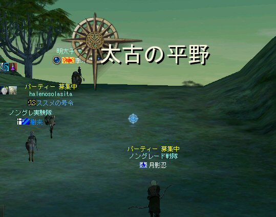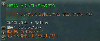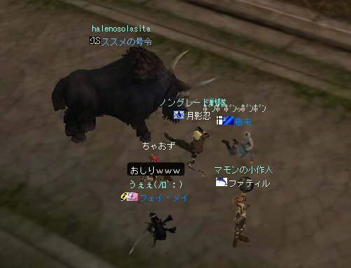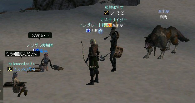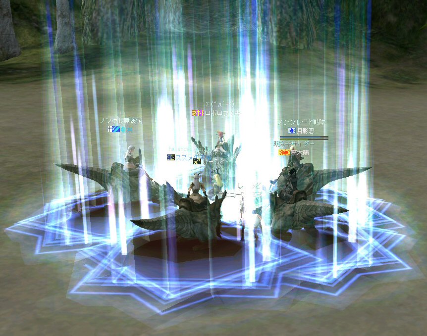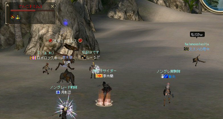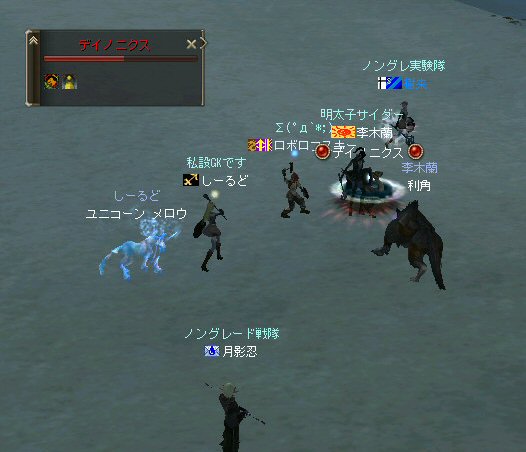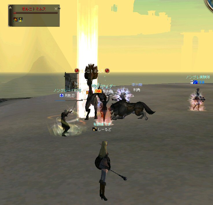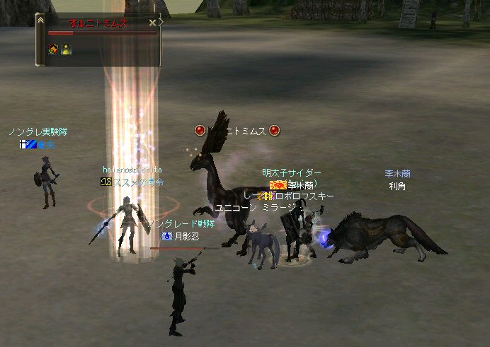 「もうすぐ課金が切れるなぁ…」と言う想いを胸に、どうせなら派手に行こうかと考えた。 初参加のしーるどさんがルウンに居た事もあり、怪獣島(太古の島)へ ここへ来たのは何ヶ月ぶりだろう… ちょっと懐かしい気もする。 何かにつけ、集まると何かやり始めるのがノングレード戦隊だ… ストライダーへ搭乗したままの5分帰還… いや、なかなか見栄えがいい。 あとで使おう。 さて、早速戦闘開始だ。 平原を見て、ちょっとびびったw 単品モンスターが見当たらない・・・ こんなにPTモンスター多かったっけ?ここ・・・ ってぐらいモンスターは沢山いるのに、ソロが見当たらない・・・ それでも無理やり見つける。 そう、太古の平原に巣食う恐竜型モンスターの単品を狙い、ダブルショーット!! ・・・とここまでは良かったんだが、3匹くらいついてきたw こいつもPTモンスターかよw (リンクした可能性もあるが) あっという間に死屍累々w 俺も逝った。 男の勲章ゲットw もちろん、様々な危機的状況を今まで体験して来た隊員達だ。 そう簡単には全滅しないw ま、一発で即死するダメージを受ける場合も多い場所だから、 戦闘不能も結構でたが、逃げのびた者も多数いる。 うーむ、やはりなめてかかっちゃイカンな。 今度の引きはススメさん。 美味い具合に単品を釣った。 戦闘開始! スポるしw 光るしw スウィープするしww 他のプレイヤーから褒められるしwww さっきPTモンスター引いちゃったとき、 褒めてくれたプレイヤーをMPKしそうになってたのは内緒だw (実は我々を、助けてくれた人だったりする ^^;) 本当にMPKになったら洒落にならんので、釣り場を少し移動した。 その後も単品を釣って戦闘を楽しんだ。 たまに複数引いてお祭りになる^^; ススメさん死にすぎ>w< 各プレイヤーとも、MPをバリバリ消費し、補助魔法の切れる時間も忘れ、 ノングレード戦闘を楽しんだ。 今回は、めったに死ななかった利角も逝った+w+; 日の傾いた中、俺達はお腹がすくのも忘れてモンスターとの戦闘を楽しんでいた・・・ なんか、リアル昔の風景みたいな感じがするな ^^; TVゲームも無く、情報化社会とは縁の無い時代。 そう、それはTVさえも珍しかった時代、子供達は外で遊んでいた。 建物も多くなく、町内には畑やら空き地やら、だだっ広い公園があった。 他人の家の庭だって子供達の遊び場と化し、みんな走り回りまわっていた。 学年の違う近所の子供達が集まって一緒に遊んでいた風景。 学校から帰ってから集まって、遊びまわって、気がつけば夕方。 そんな毎日・・・。 貧しかったけど、人の心は温かかった気がする。 リネージュ2では、 せめて、対人戦闘で人の心をすり減らすようなゲームにはなって欲しくないなと思う。 本来なら、対人戦闘はフェア(対等の立場)で行われるべきだと思う。 もし、人間のダークな面を育むようなゲームなら、いっそ無くなった方がいい。 俺としては、逆にゲームの中に癒しの場が欲しいよね・・・。 ま、癒しとしては『ノングレードで行こう!』はなかなかいい感じだと思うがw さて、 ノングレのモンスター討伐が一段落した所で、 馬と狼、どっちが強いの?ってな話がでて、 ユニコーンとBMWの一騎打ちが行われた。 召還獣とBMWの決闘など見た事が無い。面白そうだ^^ 結果(ほとんど見えんがw)、接戦だったw しーるどさんのユニコーンミラージュ(馬)の方が 李木蘭さんの利角(BMW|大狼)に勝った。 再戦したら判らんかも@w@; 最後の〆はもちろんノングレード帰還だw それもストライダーで帰還w 初めての試みは面白い>w<ノ という事で皆さんお疲れ様でした>w<ノシ (参加、ありがとうございました(^o^)ノ