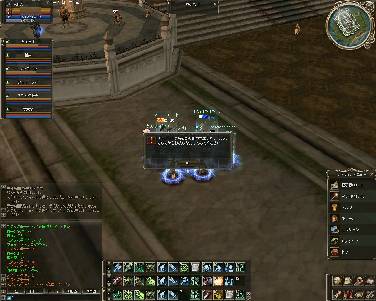 『ノングレード戦隊』の事は気にかかるが、しばし休止する。 思う事はいろいろある。 リネージュ2の中で今までプレイしてきて貯めたゲーム資産。 兄弟姉妹のキャラクターが持つアイテムを全て売り払ってアデナに換算すれば、 100M単位のアデナにはなるのだろう。 G単位は無理w もちろん誰かにくれてやる気はない。 ゲーム内で自力で稼ぐのもゲーム内では大切な要素だし、今回も休止だ。 垢ハックあわなければ、復帰後にすぐ適正装備で遊べるだろう。 まあ、何ヶ月先になるかわからないが、引退ではない。 ただ、復帰して浦島太郎状態になる可能性は否定できない。 55~60になるまでに、同じレベル帯だったメンバーですら70超える人がいる。 復帰したときは3次職だとかサブキャラだとかウジャウジャいる状態かもしれない。 『もしそんな状況になっても、一緒に遊んでくれる人はいるだろうか?』 『ノングレード戦隊のメンバー』について言えば、そんな心配は一切していない。 なぜなら、『レベルを無視して遊べる仲間』を作るのが俺のひとつの目標だったからだ。 装備についても同じことが言える。 もちろん所属血盟も同じ。 例え、抗争中のクランだろうと、ノングレルールに従って遊ぶのであれば受け入れる。 リネージュ2を一緒に遊ぶプレイヤーで垣根をなくして遊ぶのが趣旨だ。 サークル活動を作るに当たっては、これは大切な要素のひとつであった。 ただ、これは俺と俺に賛同してくれたドビ鯖のプレイヤー達が創り上げた環境だ。 ドビ鯖で俺達の活動を知っている人はノングレにいつでも舞い戻れるだろう。 しかし、実際のリネージュ2のゲーム環境としては、 仕様から逸脱した遊び方を行う集団となるかもしれない。 リネージュ2での戦争は、このゲームでの魅力のひとつだ。 PVPを楽しみの主とするプレイヤーにとっては、 当然相手より高いレベル、性能の良い装備が必須である。 相手を倒すのが目的だからだ。 結果、悲劇は生まれる。 ゲームが正式に開始された頃から、廃プレイしている人にはどうあがいても勝てる訳が無い。 普通にプレイしていても70を超える人はザラの世界。 戦争もそう言った人達が中心で行われる。 新規で戦争してみたいとか思ってリネージュ2を始めようなんて思うか? 俺なら絶対に嫌だw ま、そんなこともあってグレシアでは新規のプレイヤーが早く高レベルになれるように仕様が変更されるようだ。 でも、 それなら今までやってきた常連の苦労って一体なんだったんだろう? そのまま実装されたら orz になるかもしれないね^^; 多分、新規のユーザーが求めているのは簡単なレベル上げじゃ無いと思う。 複雑なクエストでも無いと思うし、 人として外れるような迷惑行為が黙認される仕様でも無い。 当然、業者が巣食う場所でも無い・・・。 なんでOE格差のないノングレで、 低レベル限定の攻城戦みたいな事ができる新しいフィールド作らんのかな・・・ ってのは俺のアイデアだが・・・ いかん、つい愚痴になっちまうな^^; 言い方を変えれば、それだけリネ2が気に入っているって事なんだけどね。 とりあえず、しばし休止して頭を冷やそう・・・。 リアルも大事だし・・・ という事で、 課金切れ1時間くらい前に、『ノングレード戦隊正式隊員用』としてPTMを開いた。 まあ、このタイミングで来れる人はそんなにいないだろうと思っていたが、 意外とみんな集まってくれた^^ 課金切れも1分前となり、みんなでノングレード帰還を行った。 時間が来て、強制終了w 継続していたリネ生活が、終った。 再びリネ2で逢える日を刮目して待てw