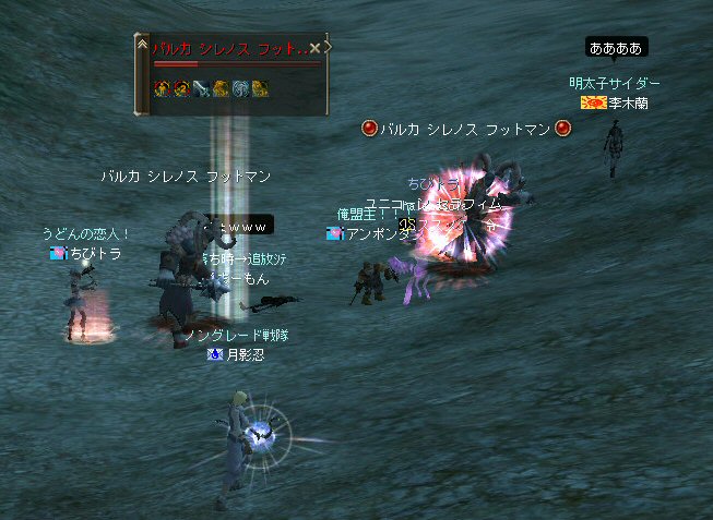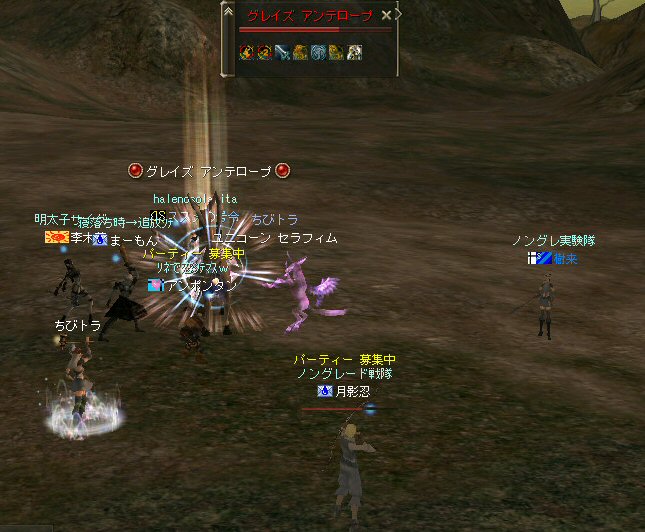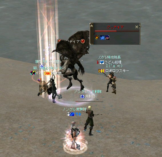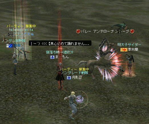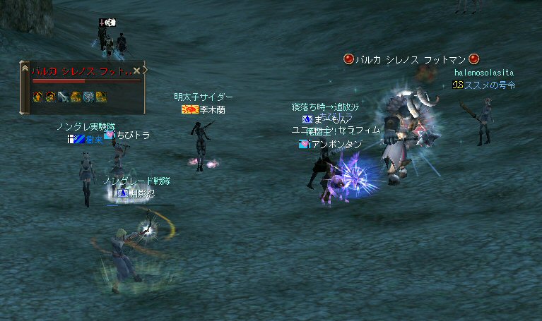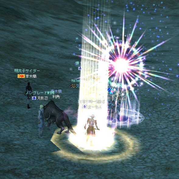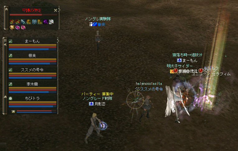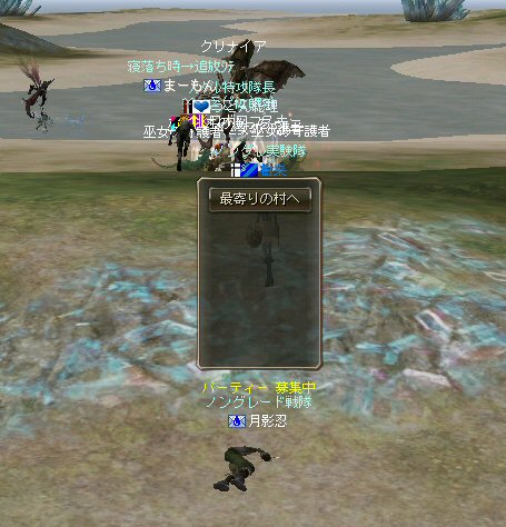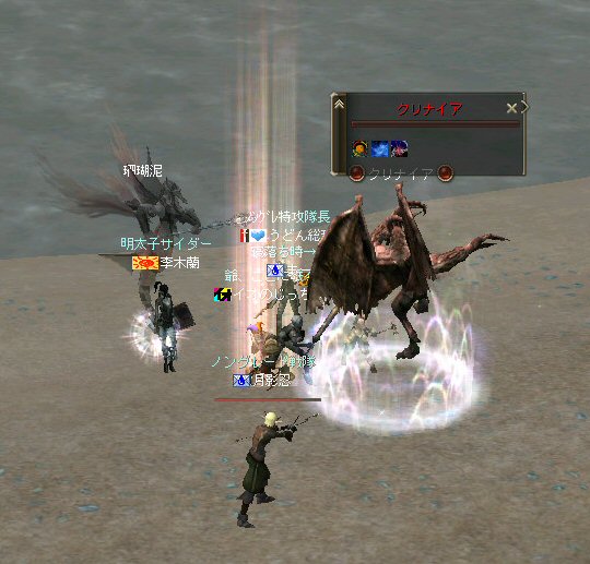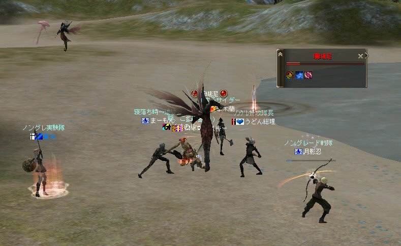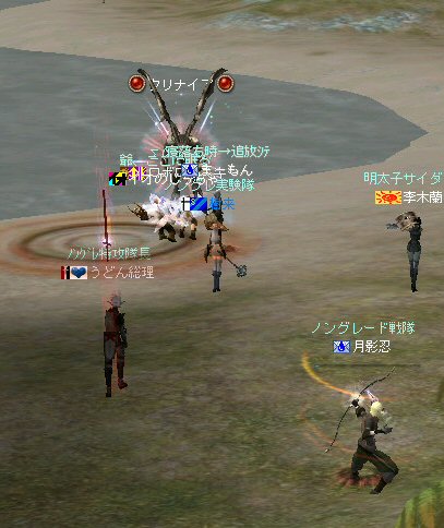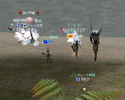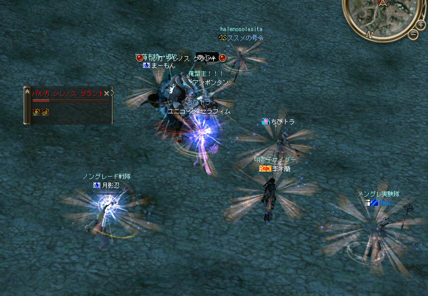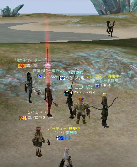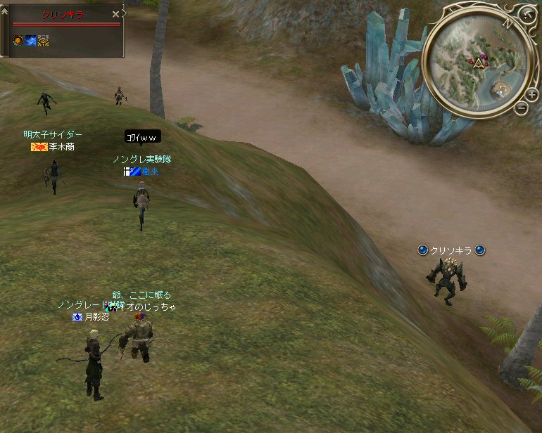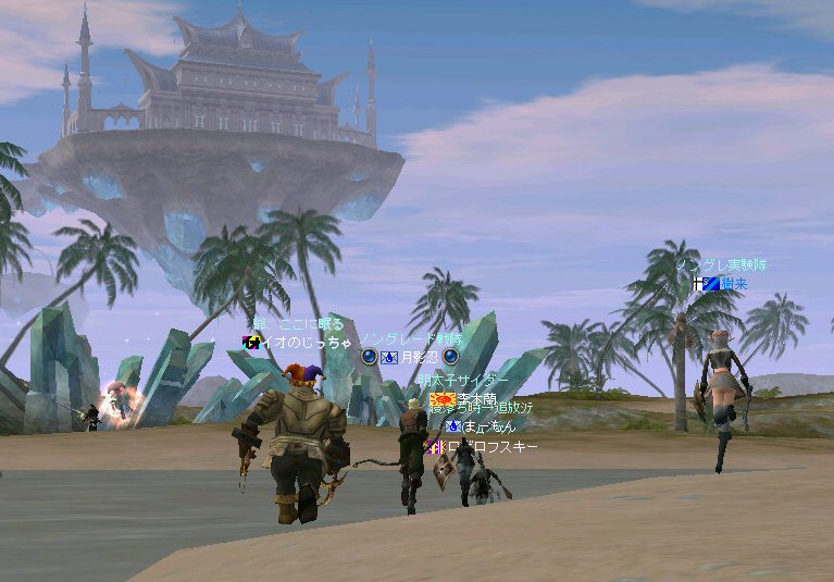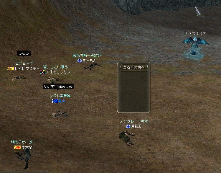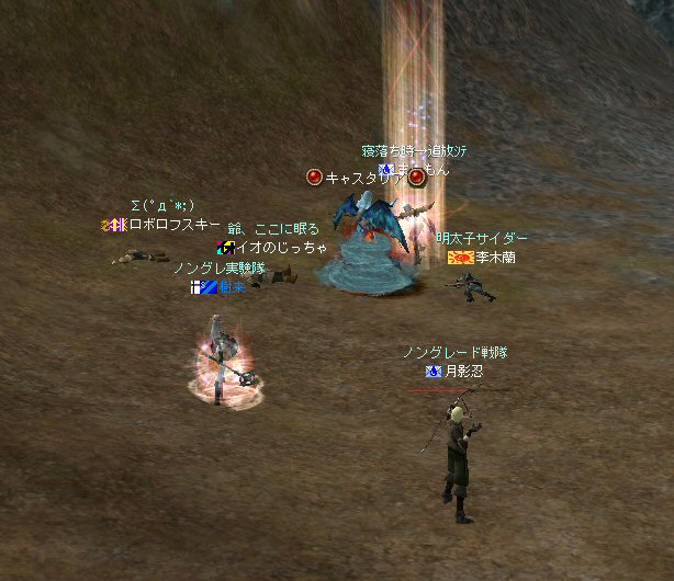 これよりノングレード戦隊は、 海岸線の浅瀬での作戦行動を内陸部へとシフトする。 奥地ではPTを組んでも大丈夫なモンスターが居るらしい。 行けるものなら行って見てみたい。 偵察だw 補助魔法を掛け内陸部へ移動開始。 入り口でもかなり苦戦した。 内陸部は一体・・・w こ・・・これは・・・ 浮遊大陸か? いや、敵の秘密基地かも知れない。 新しい城?アジト?砦?ま、なんにしてもいい感じだ。 やはり、リネージュ2のグラフィックはすごいと、改めて感心する。 しかし、それをストレス無く表示する為のスペックを持つPCを入手するとなると、かなりの投資になる。 =w=; グラフィックは美しいんですけどね…。 と、あちこちSSを撮りながら歩いてて、モンスター引っ掛けたw はい、犯人俺ですw 何とか殲滅。 いや~綺麗だね。 ピクニックに来たいものだ・・・ 危ないモンスターが居なければいいんだが・・・ ちょっと危なすぎるぞこの辺w 先を進んでいくと、両側を山に囲まれた渓谷みたいな通路に・・・ モンスターが何体かいて、行き先を阻んでいる。 もちろん、真っ赤なのは言うまでも無い。 60俺的には超真っ赤だw 単品で引いて道を作るか・・・ だが、 ・・・ 魔法攻撃が痛すぎるぞw あっという間にじっちゃんもロボさんも逝ったw HP俺の倍くらい無かったっけ?>w< とにかく倒さない事には先に進めないw ダブルショットでかなりモンスターのHPを削れる。 体力回復剤を消費しつつ、モンスターのHPをさらに削る。 半分切った。 あと4/1・・・ あと一撃でwwww で、ちょっとタイミングが遅かったみたい。 久々の全滅を味わった。 言っておくが『全滅』は、ここ数ヶ月無かったと記憶している。 ノングレード戦隊としては珍しい出来事なのだ=w=; 危険な事は何度もあったが、全員最寄るなど・・・ orz で、仲良く最寄って最後の〆だ。 定番のノングレード帰還w いや、参加した皆さんお疲れ様でしたw そして、俺のわがままに付き合ってもらって、ありがとうTwT; 今日もノングレード戦隊は、アデンの大空の下を駆け回る・・・。 さて、次はどんな冒険をしようか? ^^v この後、少し有志で通常装備のPTを組んでリハビリした。 こうして見ると、普通のPTも結構楽しいw (マテ おまけ 姉貴からの情報提供 奥地にはこんなのが居るらしい・・・
