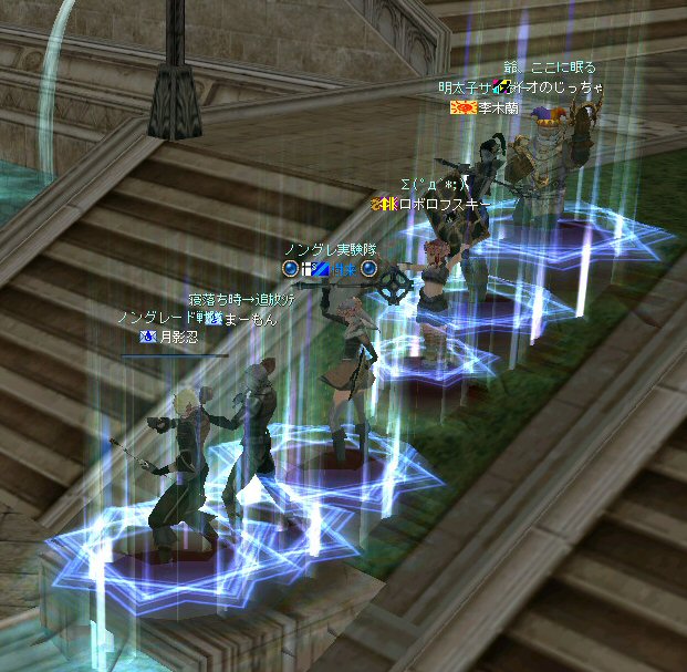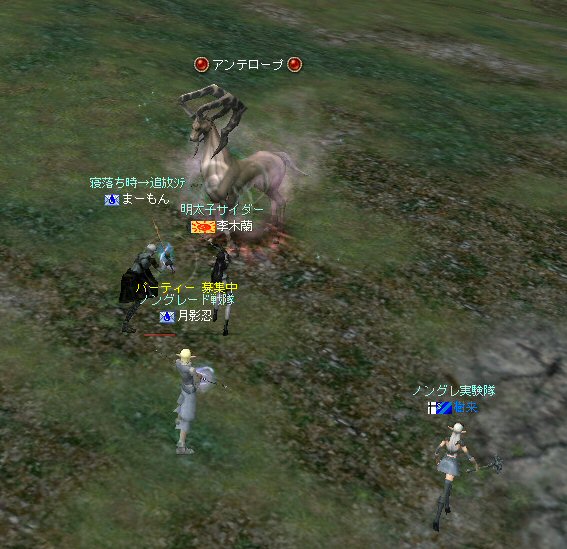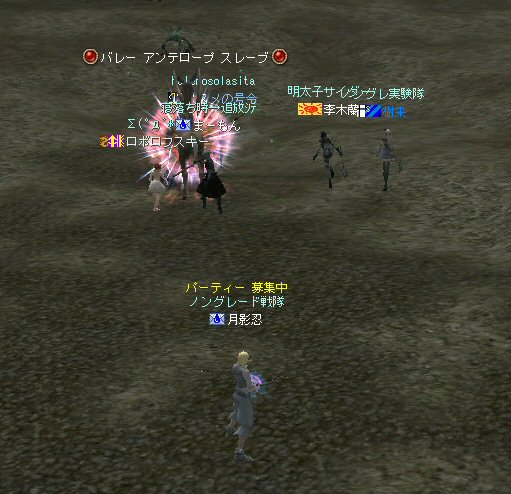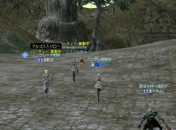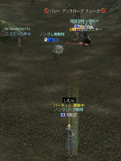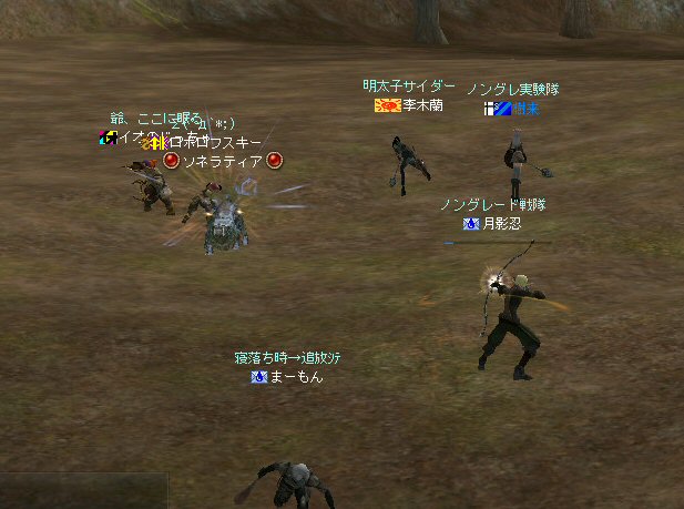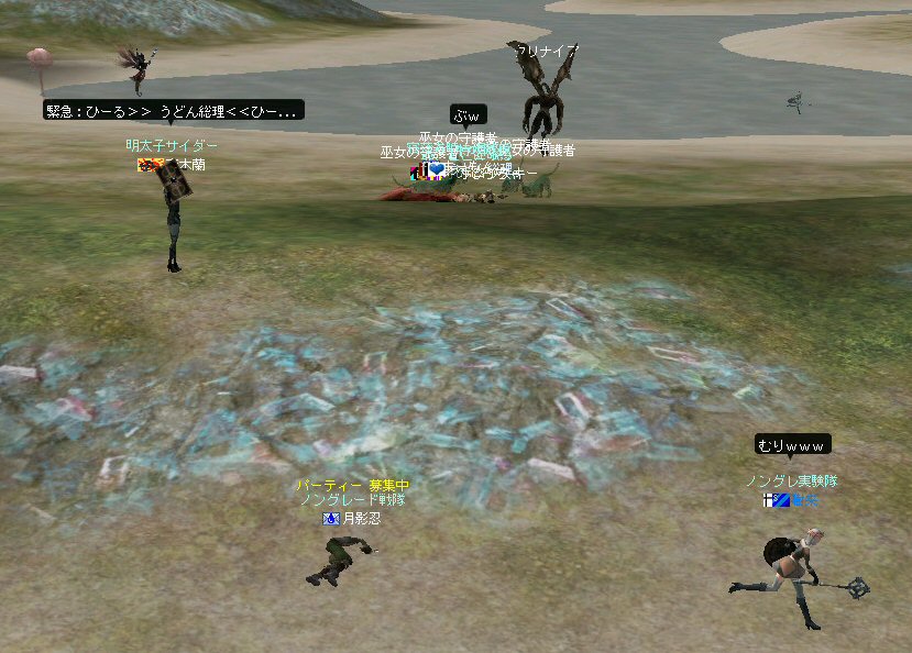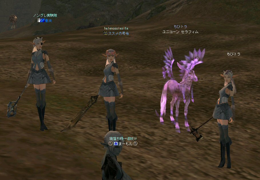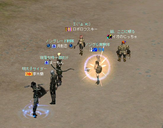 続々と集まるノングレメンバー しかし、何か雰囲気が違う・・・ ススメの号令さんと樹来さんの装備が、まるっと入れ替わってるのだw @w@; 入れ替えている本人達はバカ受けだったらしい。 そう、いつものキャラクターを動かそうとすると、隣のキャラクターが動く。 動かそうとしていないのに、自分が動いてる・・・。 妙な感覚だったことだろう。 装備の入れ替えかぁ・・・ エルフ男は俺しかいないので、この場で同じ事は出来ないw しかし、装備を入れ替えるには、それなりの装備が必要だ。 もっと簡単に入れ替えを楽しむなら・・・ 裸族かw 『装備なしで、果たしてどれくらい遊べるだろうか?』 これは、「ノングレードで行こう!」ではやっていないアプローチだ。 ノングレードを超えて、『裸族で行こう!』 (グラじゃないんだが^-^;) 何か、ノングレとはちょっと違う気もするが、 安価で遊ぶ方法としては面白い。 使うのはノングレードの武器のみ!! (防御力0の装備はOK) で、狩場(遊び場)だが・・・ まあ、真っ青な敵もどうかと思うし、かといって真っ赤な敵もなぁ・・・ 70代を超えている人もいるが、ほとんどが60代なら、アルゴスあたりが妥当だろうと判断。 ゴダードから徒歩で移動。 途中のモンスターで、その手応えを確認する。 ・・・魔法詠唱速度がむちゃくちゃ遅いw ・・・敵に与えるダメージはノングレと同じだが、被ダメは当然大きい。 そりゃ、防具なしの素の防御力で勝負だからな・・・ うむ、行ける。 そんな手応えを感じて、一路アルゴス入り口へw 早速、入り口周辺でテストだ。 行ける! 行けるぞ!! しかし、ヒールのタイミングがむずかしいのも事実だ。 ヒーラーのセンスとプレイヤースキルが、より要求される。 入り口で十分行ける事を確認した我々に、レイド化した天使との戦闘が脳裏をよぎる。 フ・・・ ダメージの大きさ、ヒールの詠唱速度の低下・・・ 装備に掛ける費用が少なくなったと言う事以外、利点が見つからんw 危険度は右肩上がりでアップした。 今回ばかりは、死亡する可能性がいつもよりも高い・・・ しかし、ノングレードメンバーの性質と言うか・・・ やはり、行くしかあるまい(だからノングレメンバーは面白い>w<ノとも言う)。 移動開始! 時々は戦闘しながら、奥へ進む。 そして、天使のいる渓谷まで来た。 休憩中。 その時の俺の装備の状態がこれだw マスクとコンポジット弓しか装備していないw 過激だぞ!ノングレード戦隊!! (って言うか裸族戦隊!?) ・・・で、すぐにこの状態w 予想はしてたが、やはりダメージが大きい。 しかし、単品で倒せない相手ではない。 ここでロボロフスキーさんが帰還し、代わりにちびトラさんが参戦。 途中HPの減りが激しかったので救援に向かう。 さ、新たなメンバーを加え、火力も多少上がったかもしれない・・・ と言うより、エルフ三姉妹w こっちが本題かもしれん =w=; さ、MP充電も終って戦闘再開だw だが、相手がむちゃくちゃ火力の高い相手だ。 単品なら何とかなると思う。 しかし、リンクしたら・・・? そりゃ多分アウトだろう。 立ち位置を変え、なるべく後からモンスターを攻撃するようにする。 クリティカルダメージが出やすいからだ。 しかし、それが仇となった。 うわw おまw どこからわいたーwww いきなり後から現れた別の天使・・・ 今度は俺が逝ったw リザしてもらい、即リコ・・・。 久々に、傷者にはなったが、全滅は免れた・・・。 さて、体勢を立て直して再度天使か?しかし23:20・・・ 移動してリベンジとなると時間的に面倒だ。 一応、天使との戦闘は楽しめたし、同じ相手と対戦するには時間が惜しい。 短時間で移動が出来て楽しめる場所の選択肢はあまり無い。 だが、危険度で言えば申し分ないだろう。 AやS装備の人達が沢山遊んでいるあの場所。 『バルカシレノス駐屯地』 裸で逝くぜ!ノングレード戦隊!! つづく