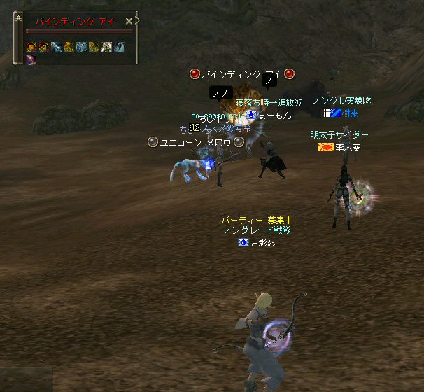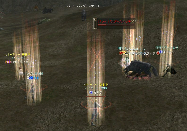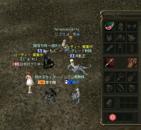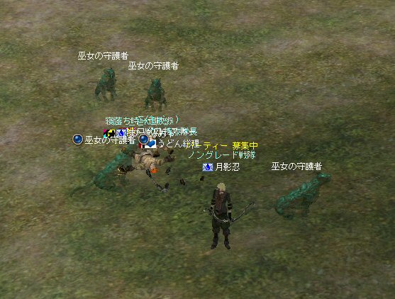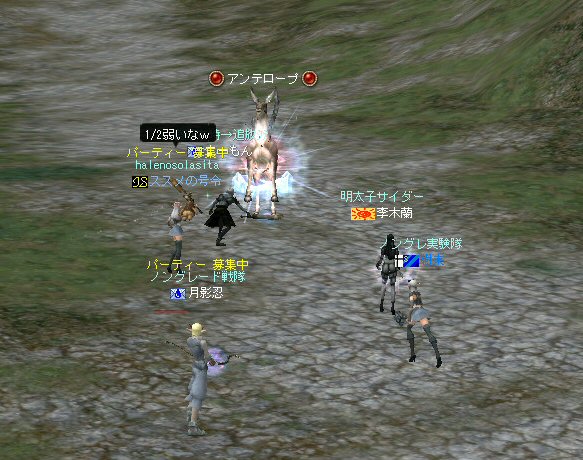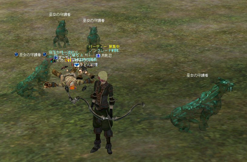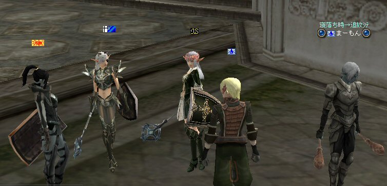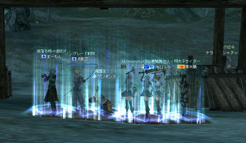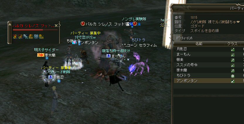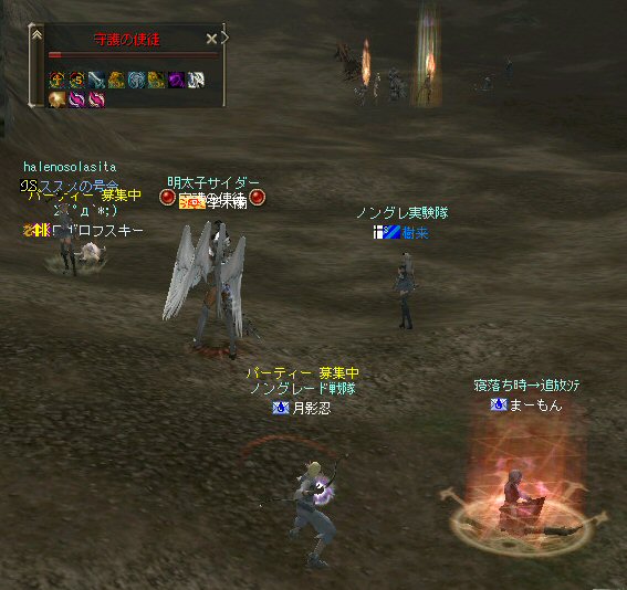 続々と集まるノングレメンバー しかし、何か雰囲気が違う・・・ ススメの号令さんと樹来さんの装備が、まるっと入れ替わってるのだw @w@; 入れ替えている本人達はバカ受けだったらしい。 そう、いつものキャラクターを動かそうとすると、隣のキャラクターが動く。 動かそうとしていないのに、自分が動いてる・・・。 妙な感覚だったことだろう。 装備の入れ替えかぁ・・・ エルフ男は俺しかいないので、この場で同じ事は出来ないw しかし、装備を入れ替えるには、それなりの装備が必要だ。 もっと簡単に入れ替えを楽しむなら・・・ 裸族かw 『装備なしで、果たしてどれくらい遊べるだろうか?』 これは、「ノングレードで行こう!」ではやっていないアプローチだ。 ノングレードを超えて、『裸族で行こう!』 (グラじゃないんだが^-^;) 何か、ノングレとはちょっと違う気もするが、 安価で遊ぶ方法としては面白い。 使うのはノングレードの武器のみ!! (防御力0の装備はOK) で、狩場(遊び場)だが・・・ まあ、真っ青な敵もどうかと思うし、かといって真っ赤な敵もなぁ・・・ 70代を超えている人もいるが、ほとんどが60代なら、アルゴスあたりが妥当だろうと判断。 ゴダードから徒歩で移動。 途中のモンスターで、その手応えを確認する。 ・・・魔法詠唱速度がむちゃくちゃ遅いw ・・・敵に与えるダメージはノングレと同じだが、被ダメは当然大きい。 そりゃ、防具なしの素の防御力で勝負だからな・・・ うむ、行ける。 そんな手応えを感じて、一路アルゴス入り口へw 早速、入り口周辺でテストだ。 行ける! 行けるぞ!! しかし、ヒールのタイミングがむずかしいのも事実だ。 ヒーラーのセンスとプレイヤースキルが、より要求される。 入り口で十分行ける事を確認した我々に、レイド化した天使との戦闘が脳裏をよぎる。 フ・・・ ダメージの大きさ、ヒールの詠唱速度の低下・・・ 装備に掛ける費用が少なくなったと言う事以外、利点が見つからんw 危険度は右肩上がりでアップした。 今回ばかりは、死亡する可能性がいつもよりも高い・・・ しかし、ノングレードメンバーの性質と言うか・・・ やはり、行くしかあるまい(だからノングレメンバーは面白い>w<ノとも言う)。 移動開始! 時々は戦闘しながら、奥へ進む。 そして、天使のいる渓谷まで来た。 休憩中。 その時の俺の装備の状態がこれだw マスクとコンポジット弓しか装備していないw 過激だぞ!ノングレード戦隊!! (って言うか裸族戦隊!?) ・・・で、すぐにこの状態w 予想はしてたが、やはりダメージが大きい。 しかし、単品で倒せない相手ではない。 ここでロボロフスキーさんが帰還し、代わりにちびトラさんが参戦。 途中HPの減りが激しかったので救援に向かう。 さ、新たなメンバーを加え、火力も多少上がったかもしれない・・・ と言うより、エルフ三姉妹w こっちが本題かもしれん =w=; さ、MP充電も終って戦闘再開だw だが、相手がむちゃくちゃ火力の高い相手だ。 単品なら何とかなると思う。 しかし、リンクしたら・・・? そりゃ多分アウトだろう。 立ち位置を変え、なるべく後からモンスターを攻撃するようにする。 クリティカルダメージが出やすいからだ。 しかし、それが仇となった。 うわw おまw どこからわいたーwww いきなり後から現れた別の天使・・・ 今度は俺が逝ったw リザしてもらい、即リコ・・・。 久々に、傷者にはなったが、全滅は免れた・・・。 さて、体勢を立て直して再度天使か?しかし23:20・・・ 移動してリベンジとなると時間的に面倒だ。 一応、天使との戦闘は楽しめたし、同じ相手と対戦するには時間が惜しい。 短時間で移動が出来て楽しめる場所の選択肢はあまり無い。 だが、危険度で言えば申し分ないだろう。 AやS装備の人達が沢山遊んでいるあの場所。 『バルカシレノス駐屯地』 裸で逝くぜ!ノングレード戦隊!! つづく